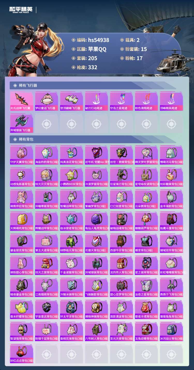 hs54938 苹果手Q-15王牌印记-15粉装-17特效枪-2载具-108950热力值-205套装
