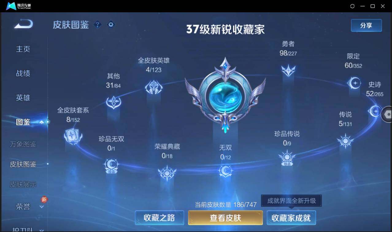 【W4442】【亮点:5.6K场次-发育32段-打野30段-三太0违】安卓Q-可二次-贵6-126英雄-186皮肤-5传说-60限定-8按键-贵族积分13547-营地ID:2147064913(热门:幻光神枪-愿照山河定-山海苍雷引-地狱之眼)