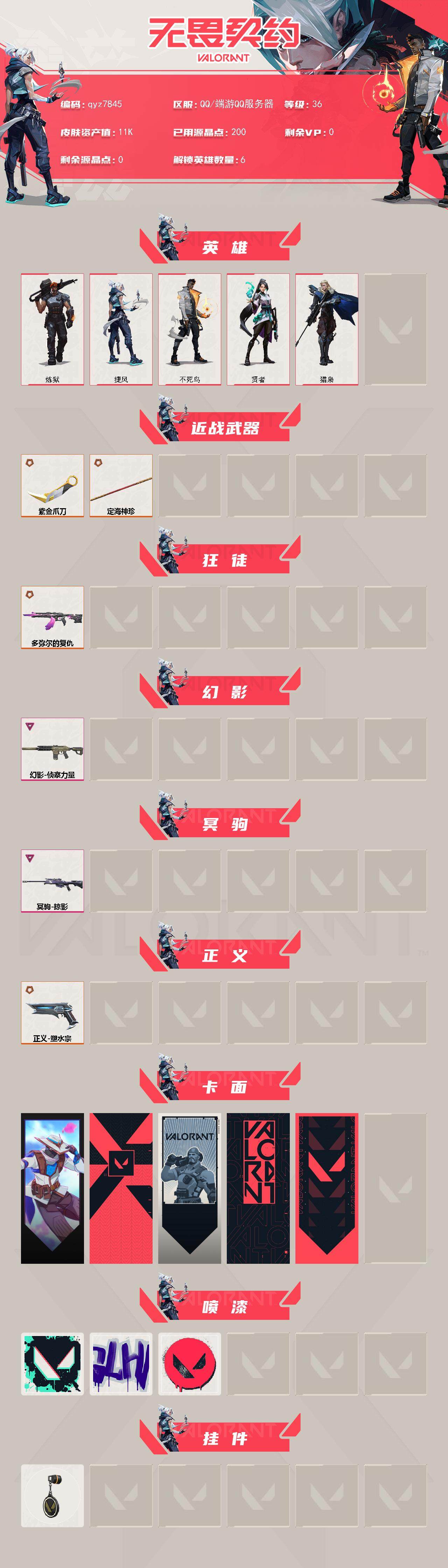 【qyz7845】塑水宗 正义 定海神珍 多弥尔的复仇 狂徒 掠影 冥驹 侦察力量 幻影 紫金爪刀 小精品组合号 qyz7845 近战武器皮肤: 定海神珍,紫金爪刀 步枪皮肤: 幻影-侦察力量 佩枪皮肤: 正义-塑水宗 狙击枪皮肤: 冥驹-掠影 亮点: 【qyz7845】【英雄】:炼狱,捷风,不死鸟,贤者,猎枭【近战 武器】:近战武器-紫金爪刀,近战武器-定海神珍【狂徒】:狂徒-多弥尔的复仇【幻影】:幻影-侦察力量【冥驹】:冥驹-掠影【正义】:正义-塑水宗【卡面】:无畏契约GO!第一卷:零 卡面