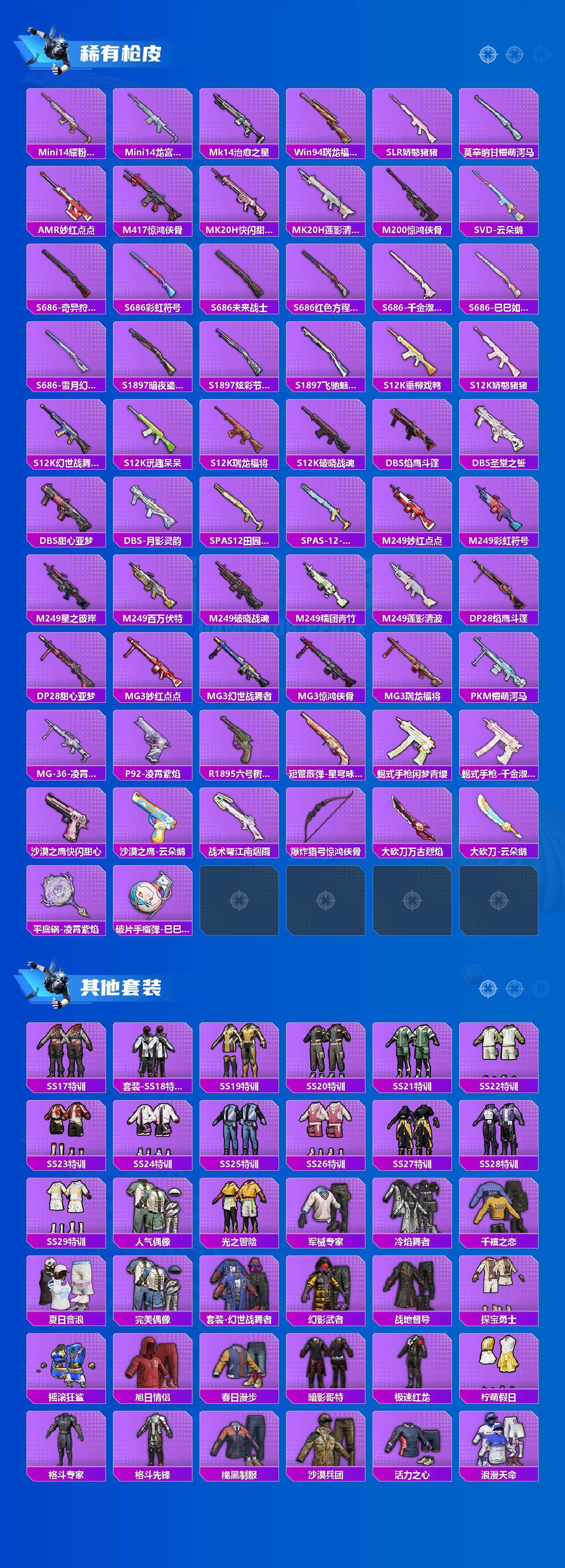 【热门品类】:粉装-梦幻火箭,绝对防御上衣,套装-浪漫天命,套装-都市猎人,套装-深海小丑鱼,套装-小丑鱼,套装-奇异狩猎者,角色-忠真马岱,套装-龟仙人,套装-暗影哥特,套装-粉红小猪,角色-Mark.06,撬棍-龙胆亮银枪