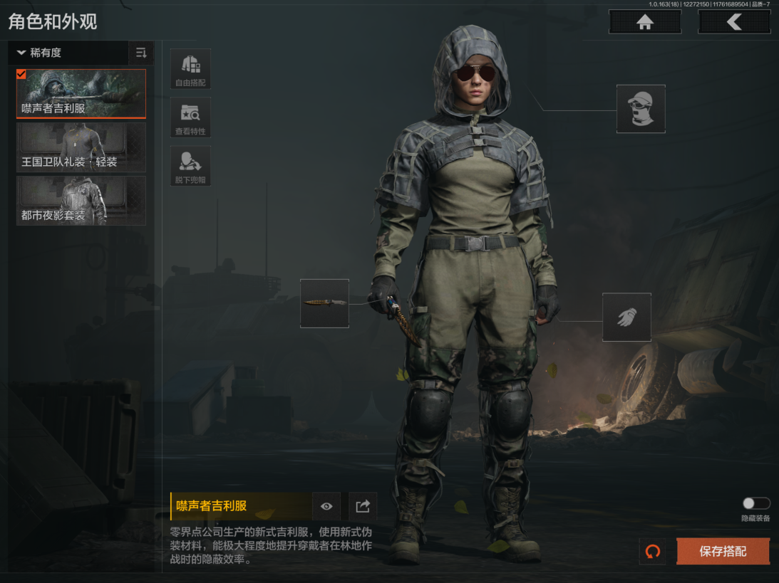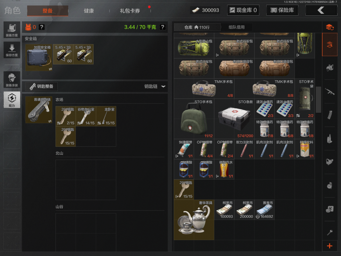 仓库价值1.5M 科恩币300093 3金枪 1金衣 噤声者吉利服 刀皮 S