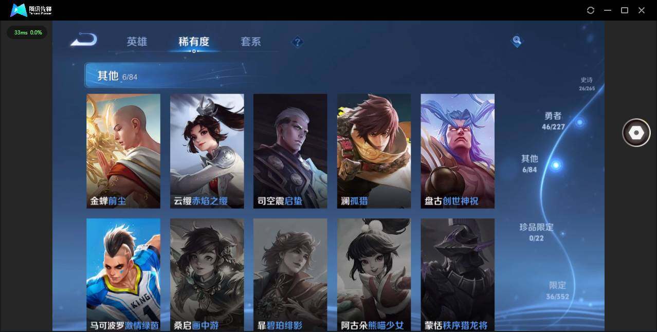 贵族等级: V5 英雄数: 90 皮肤数: 84 传说皮: 炽阳神光,澜逐花归海,神树通天 限定皮: 孙行者,五谷丰年,鸣野蒿,愿照·山河定,愿照·九州拓