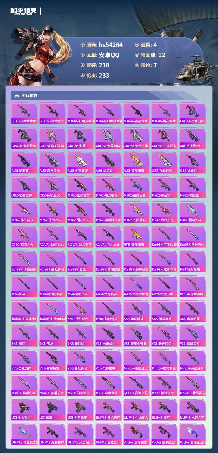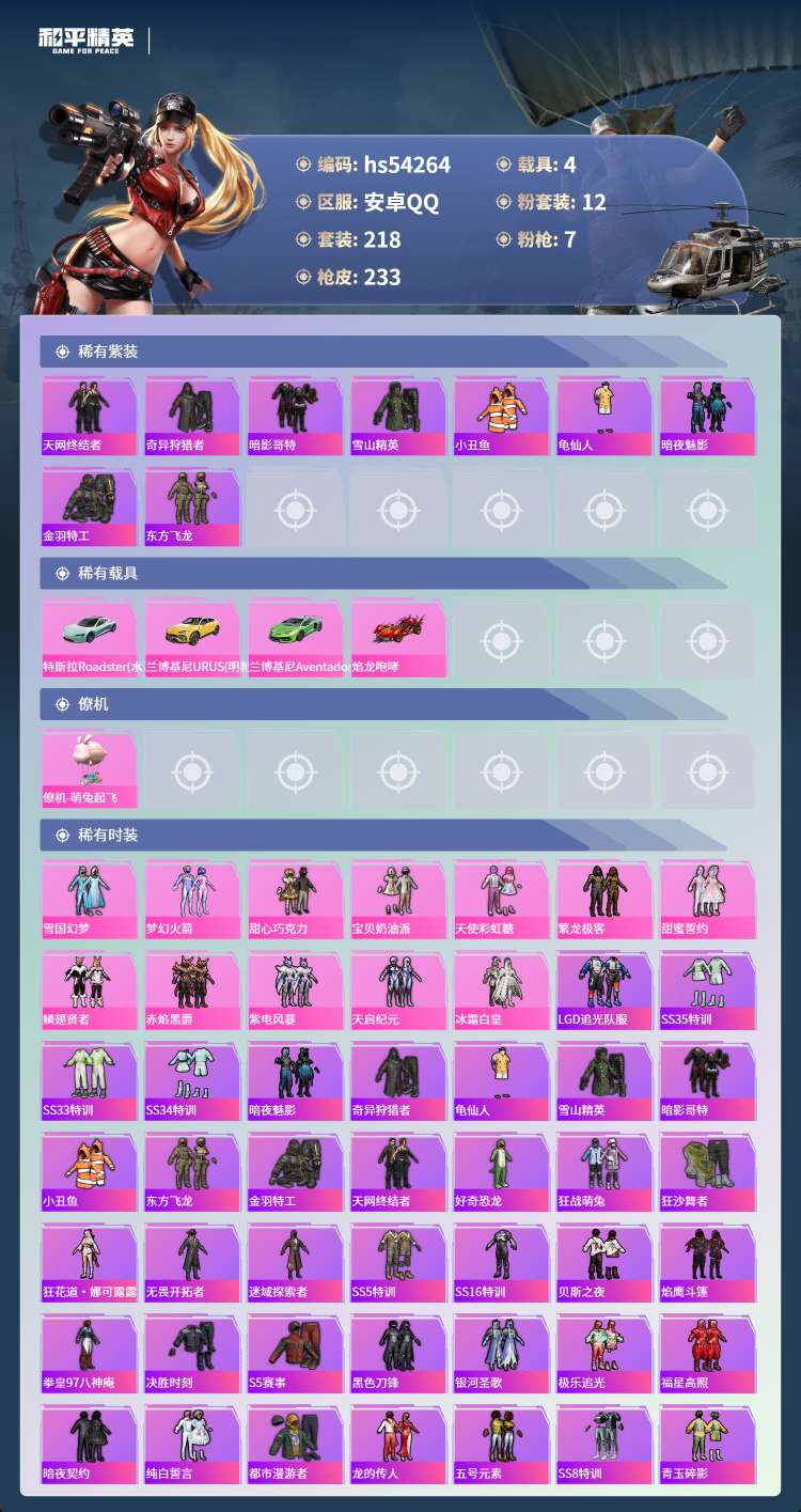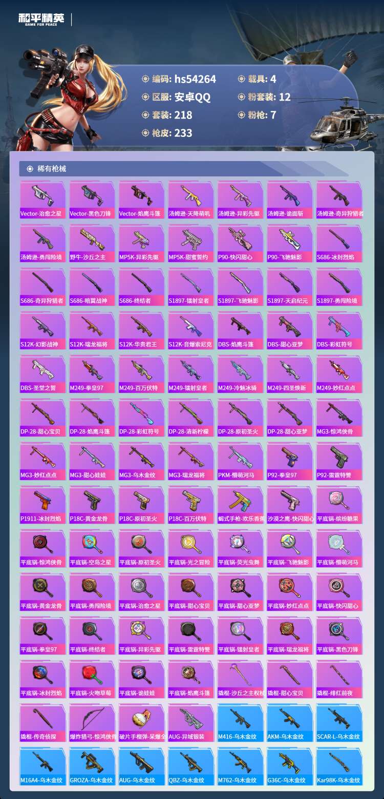 hs54264 安卓手Q-23王牌印记-有战神框-12粉装-7特效枪-4载具-87095热力值-21