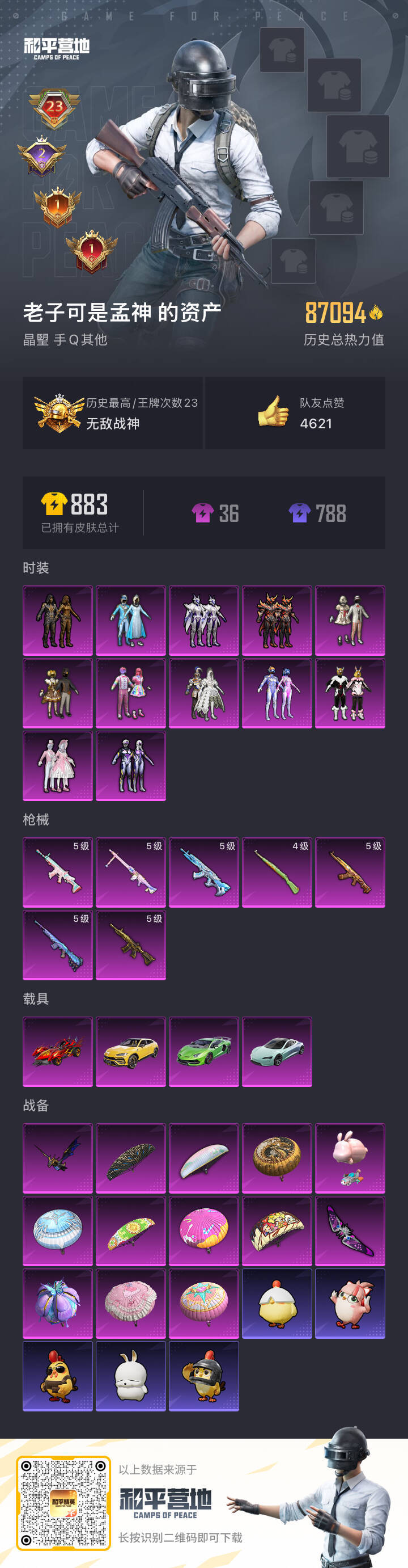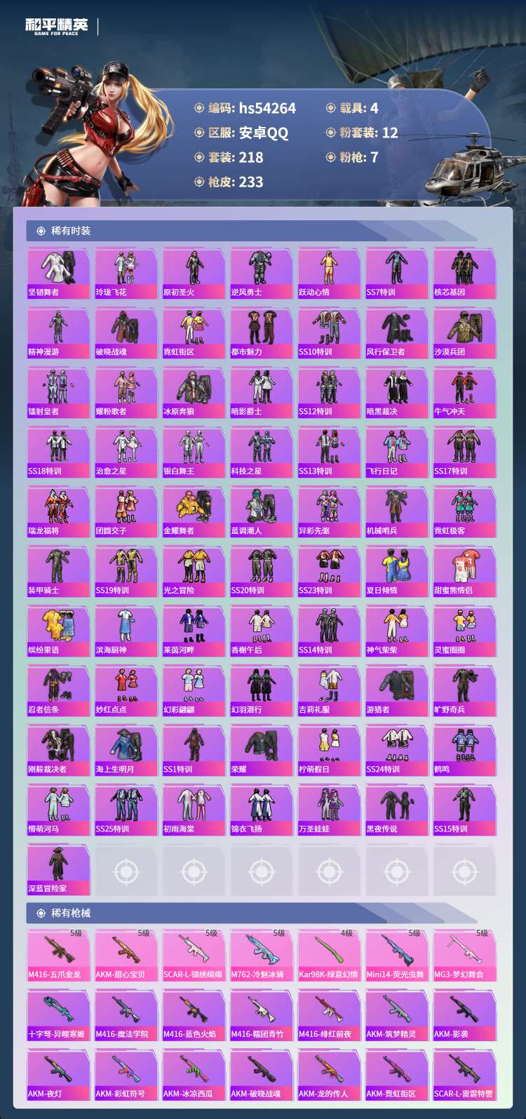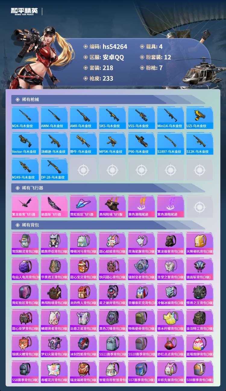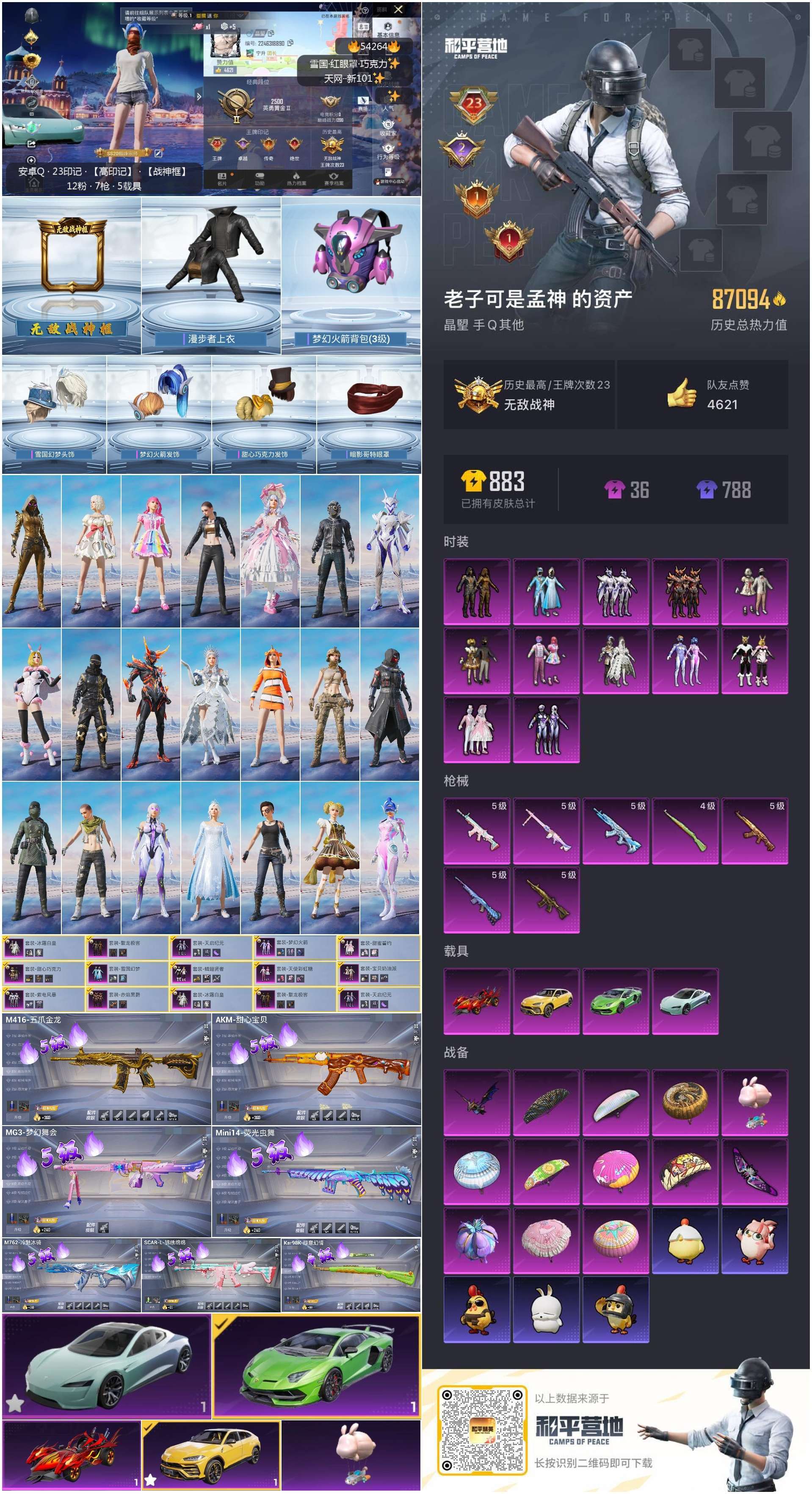 hs54264 安卓手Q-23王牌印记-有战神框-12粉装-7特效枪-4载具-87095热力值-21