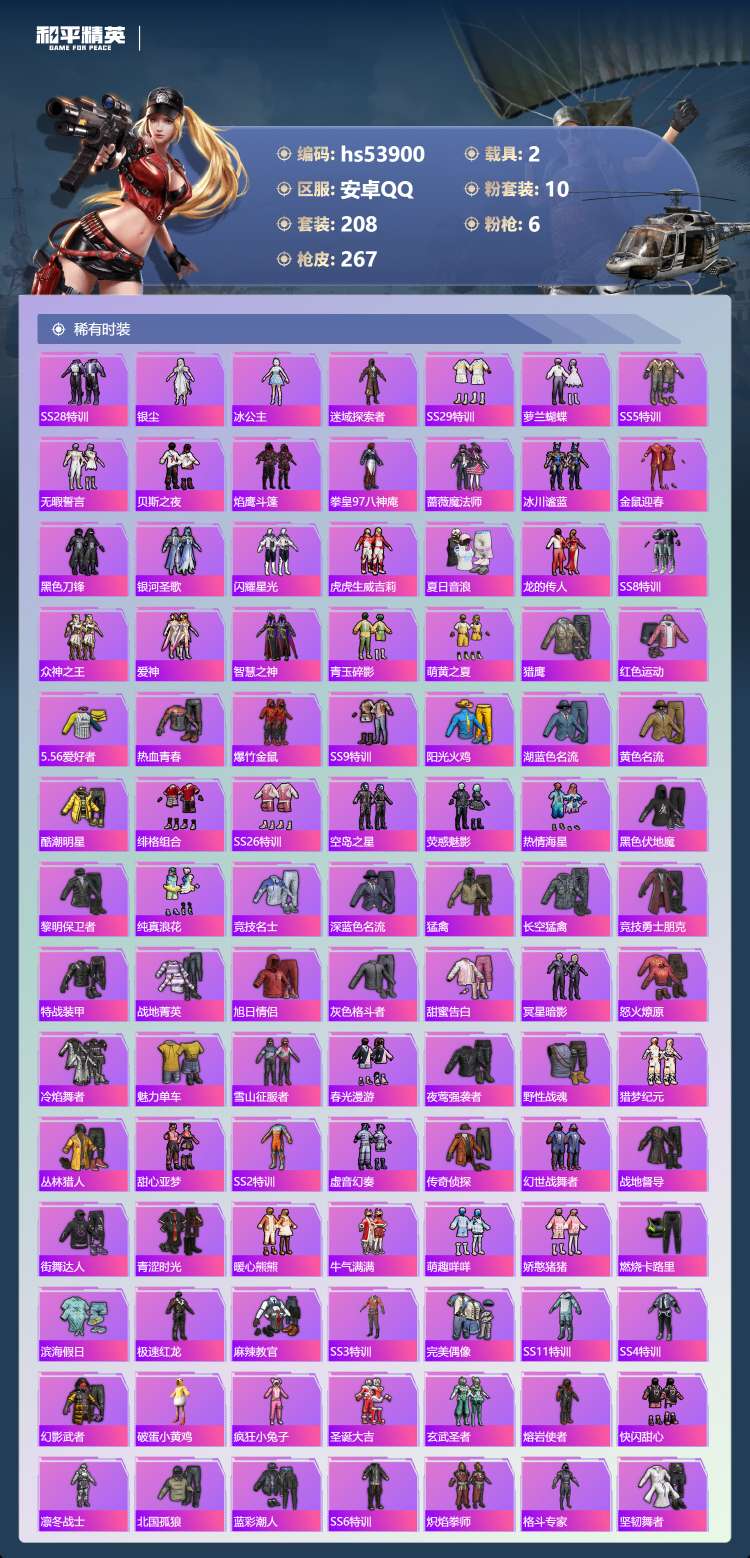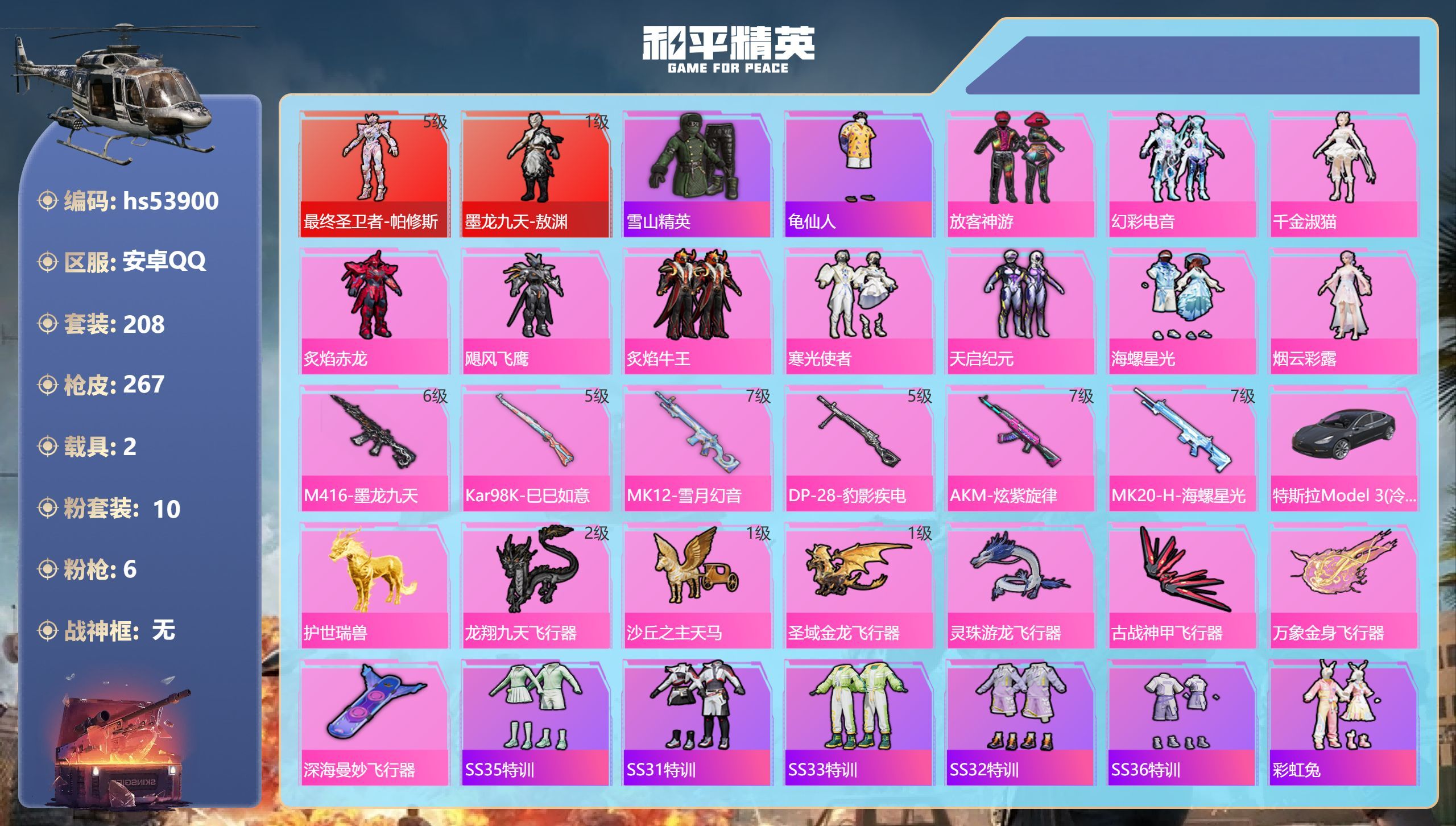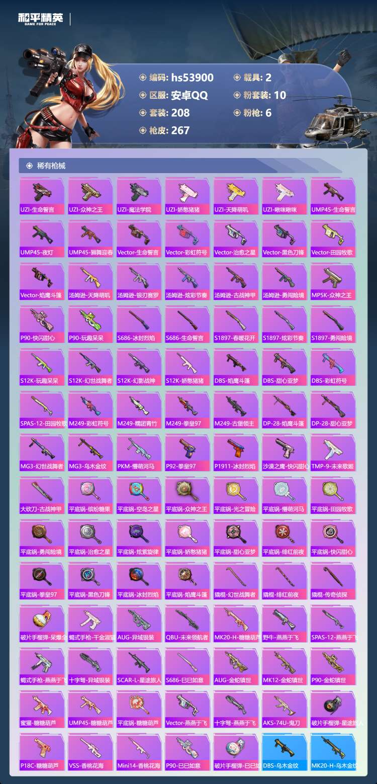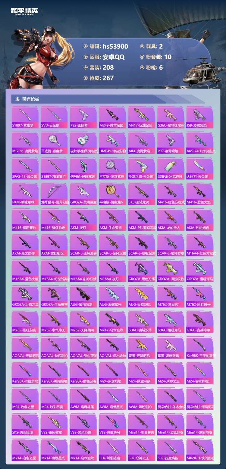 hs53900 安卓手Q-22王牌印记-2红装-10粉装-6特效枪-2载具-98452热力值-208