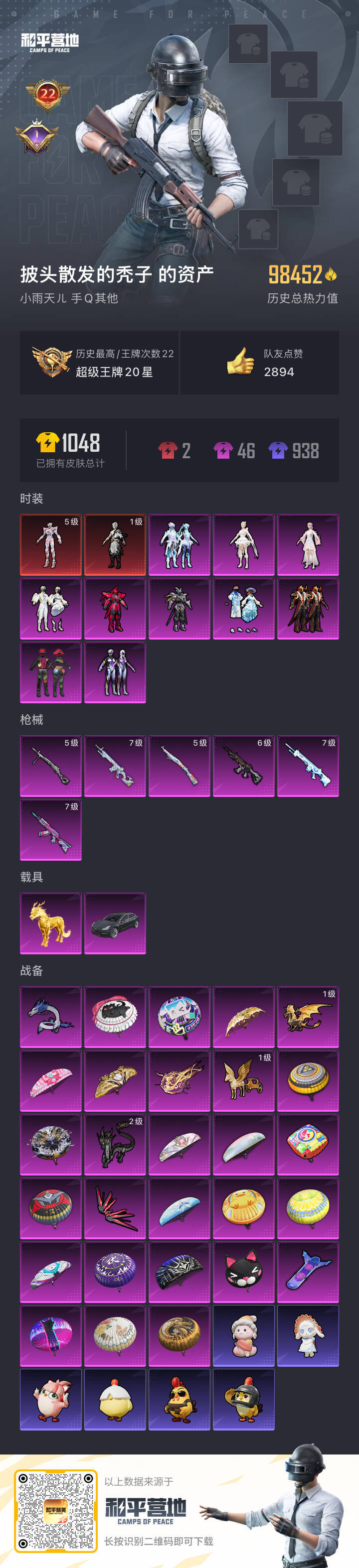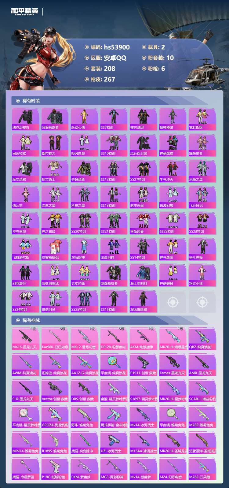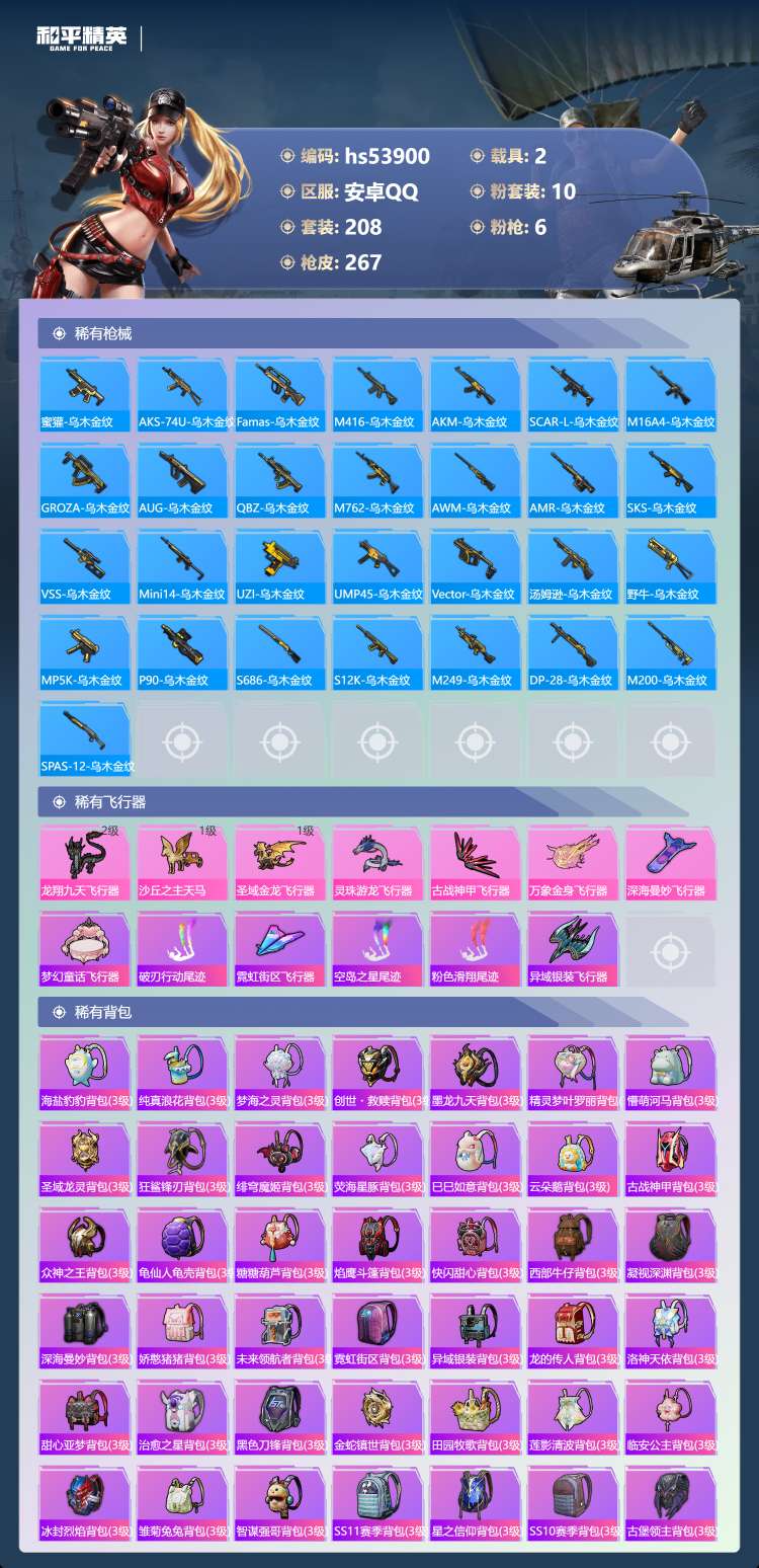hs53900 安卓手Q-22王牌印记-2红装-10粉装-6特效枪-2载具-98452热力值-208