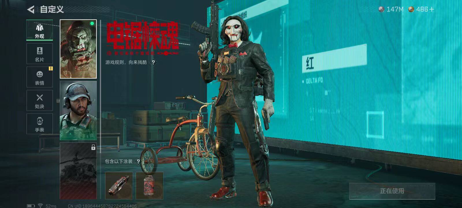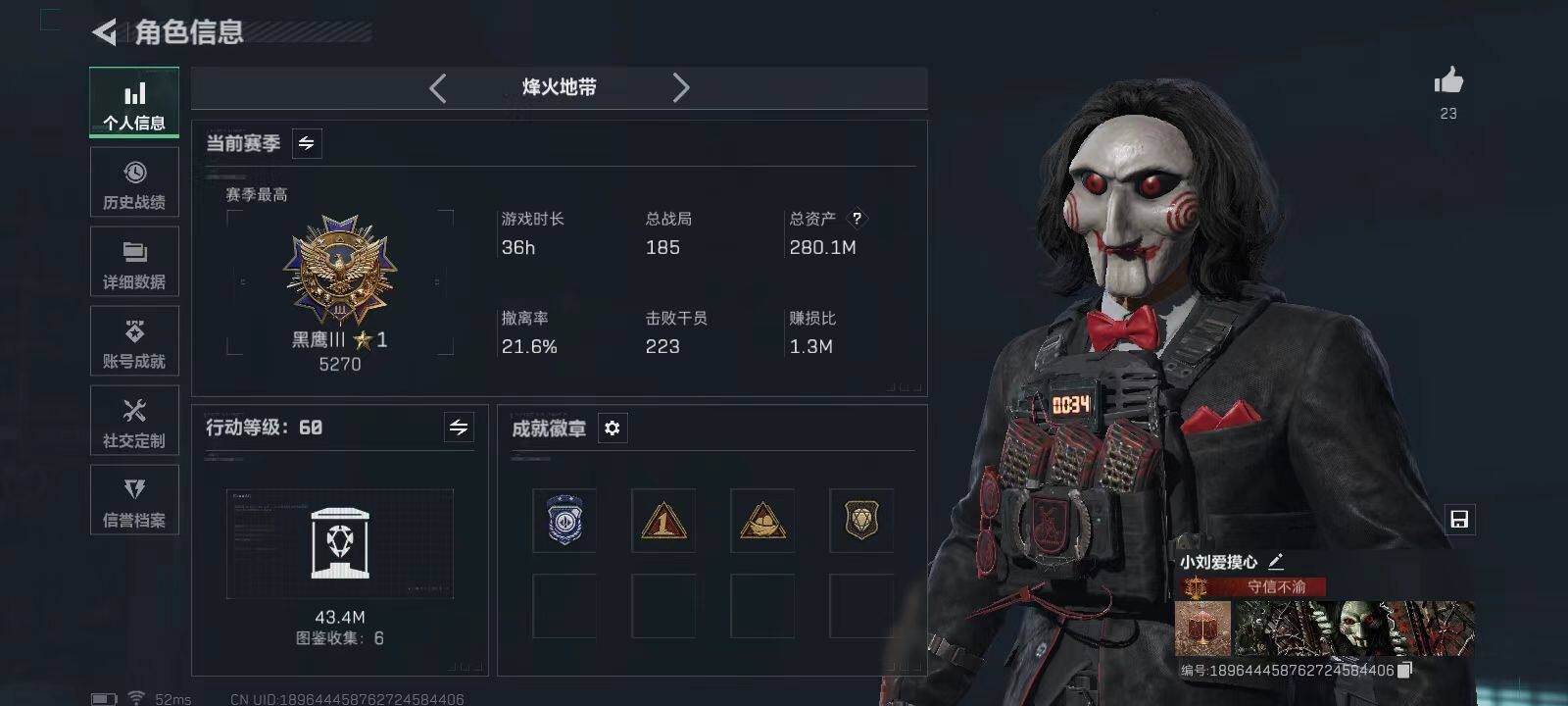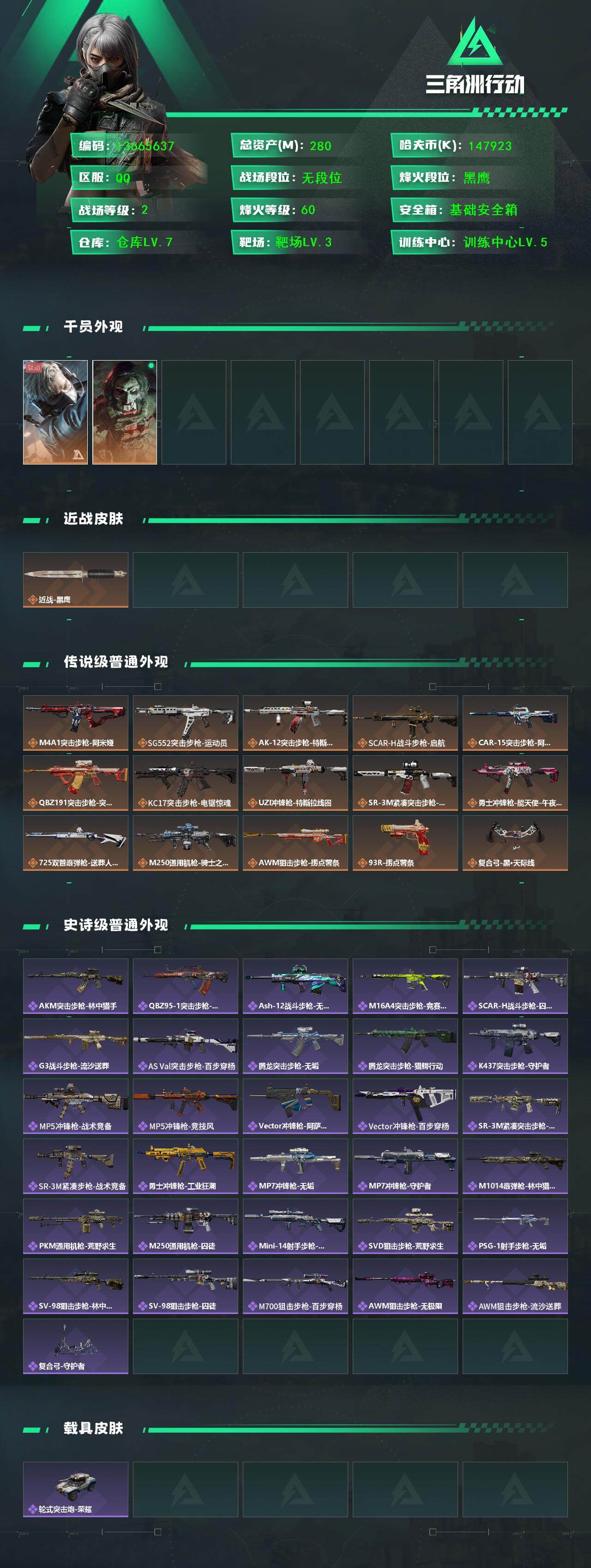 总资产(M):280M/哈夫币(K):147923K/哈夫币(K):147923K/全面战场等级:2_段位:无段位/烽火地带等级:60_段位:黑鹰/蜂医-送葬人·无题密令/红狼-电锯惊魂/近战-黑鹰/M4A1突击步枪-阿米娅/SG552突击步枪-运动员/AK-12突击步枪-特斯拉线圈/SCAR-H战斗步枪-启航/CAR-15突击步枪-阿米娅/腾龙突击步枪-捞点薯条/KC17突击步枪-电锯惊魂/U