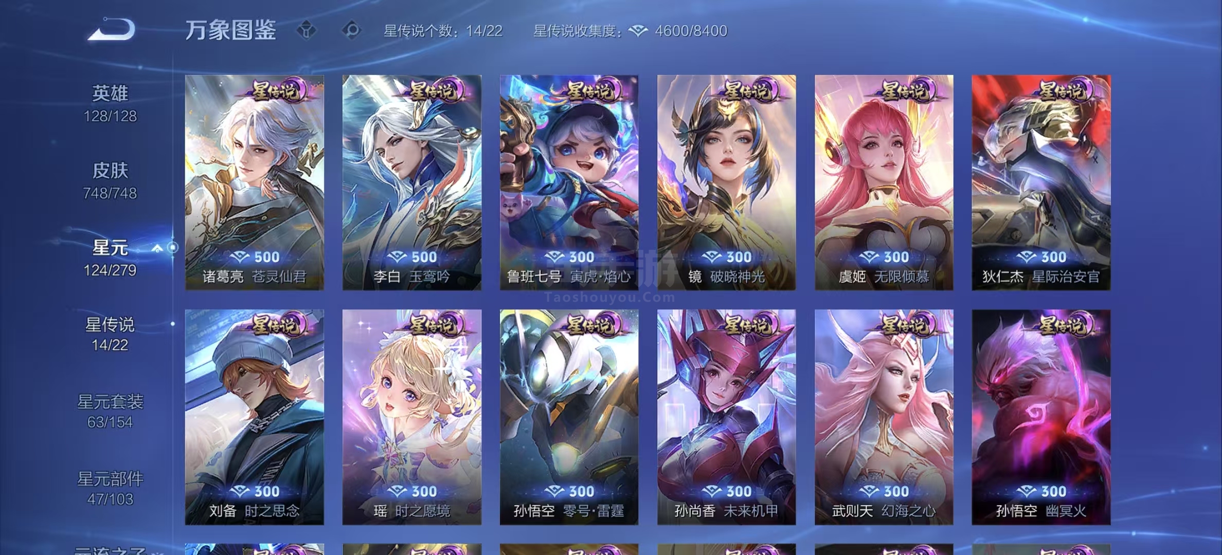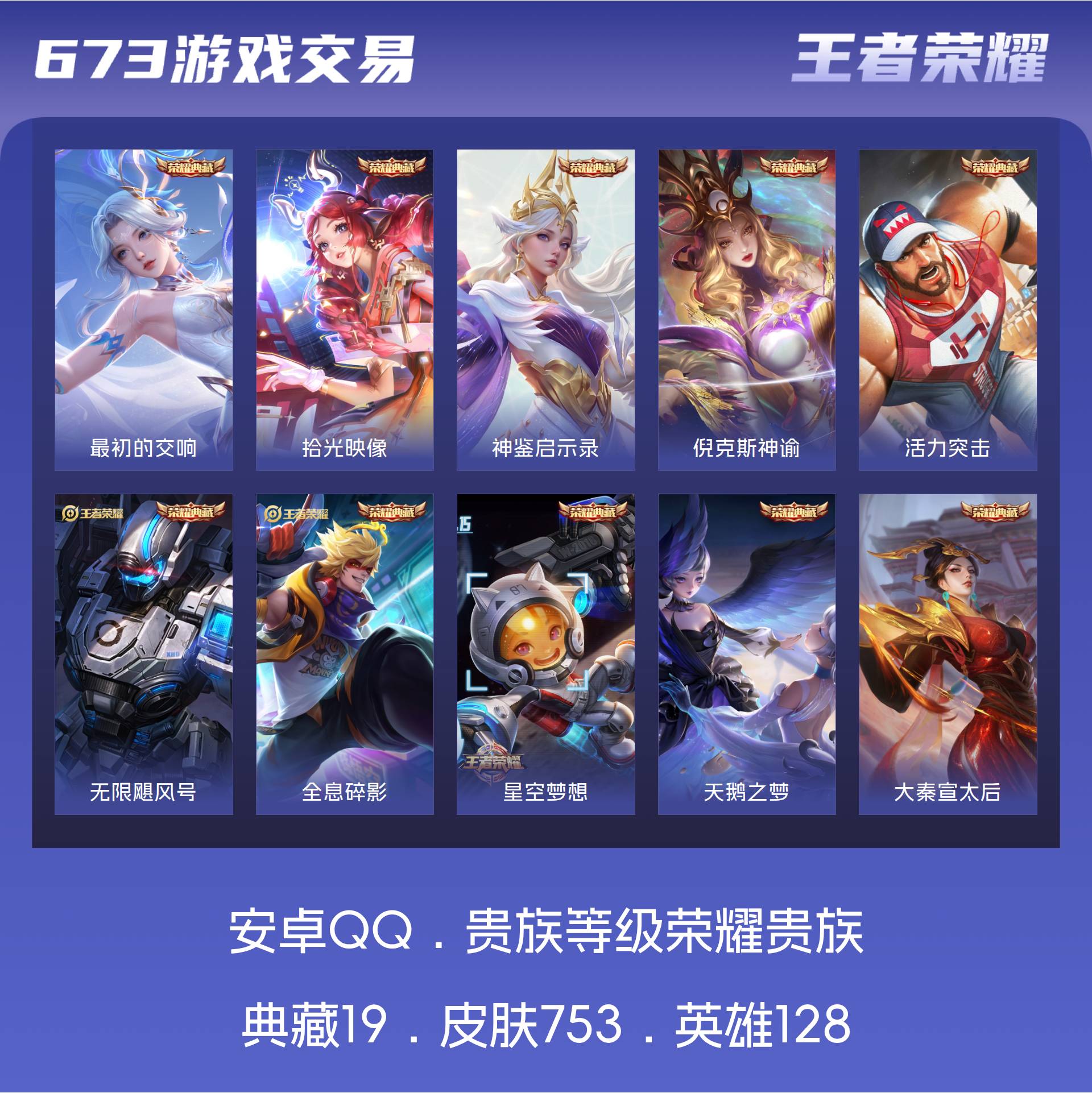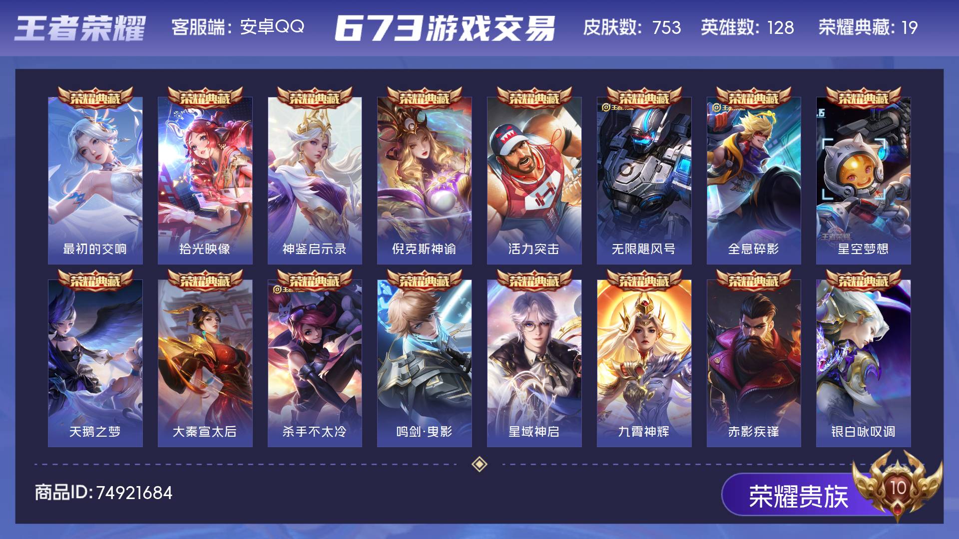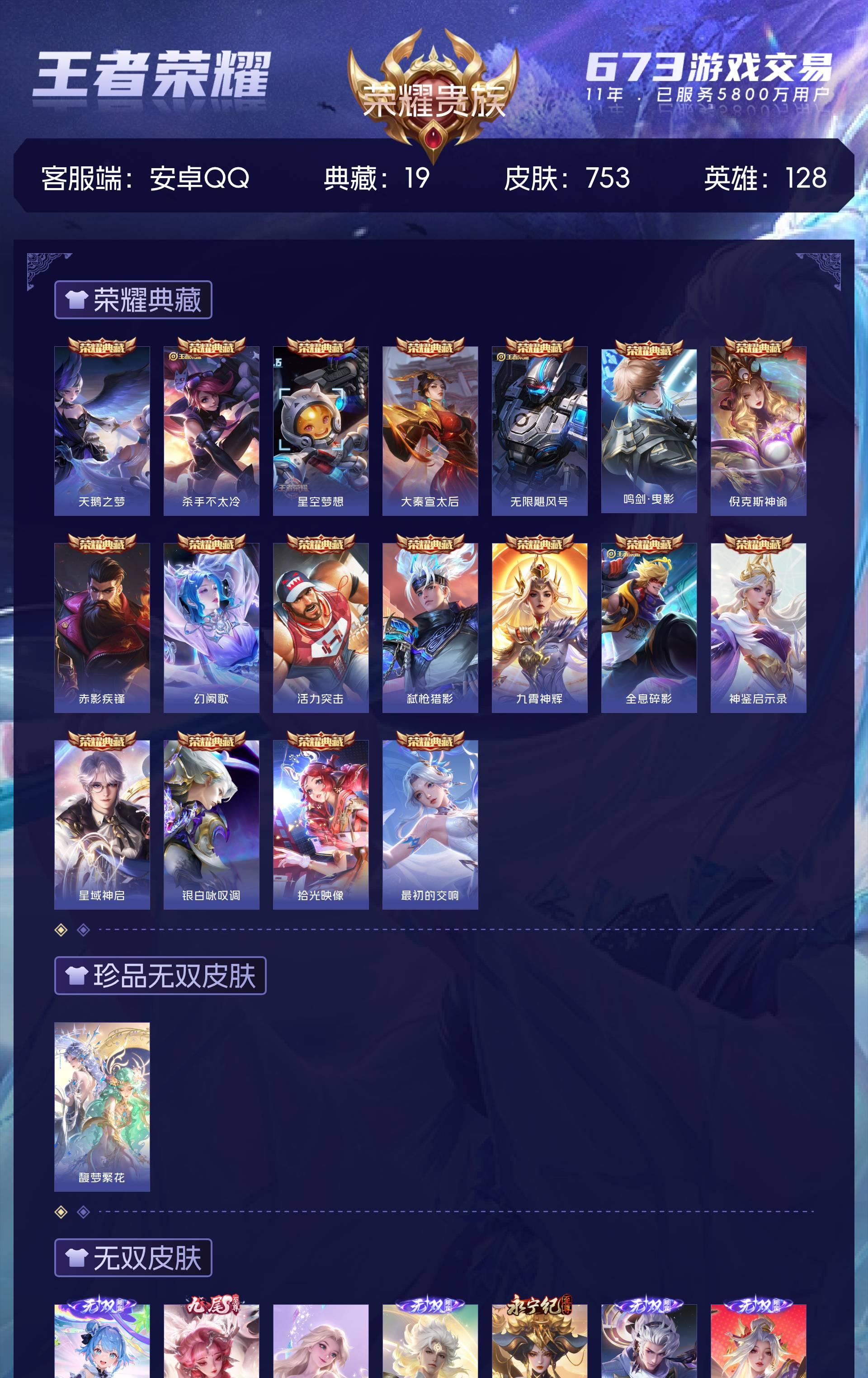 安卓Q 满皮-皮肤753 英雄128 荣耀王者 荣耀典藏19 珍品无双1 无双皮肤13 珍品传说9 传说131 其他皮肤310--背包4颗水晶-8小兵-不议价 最低