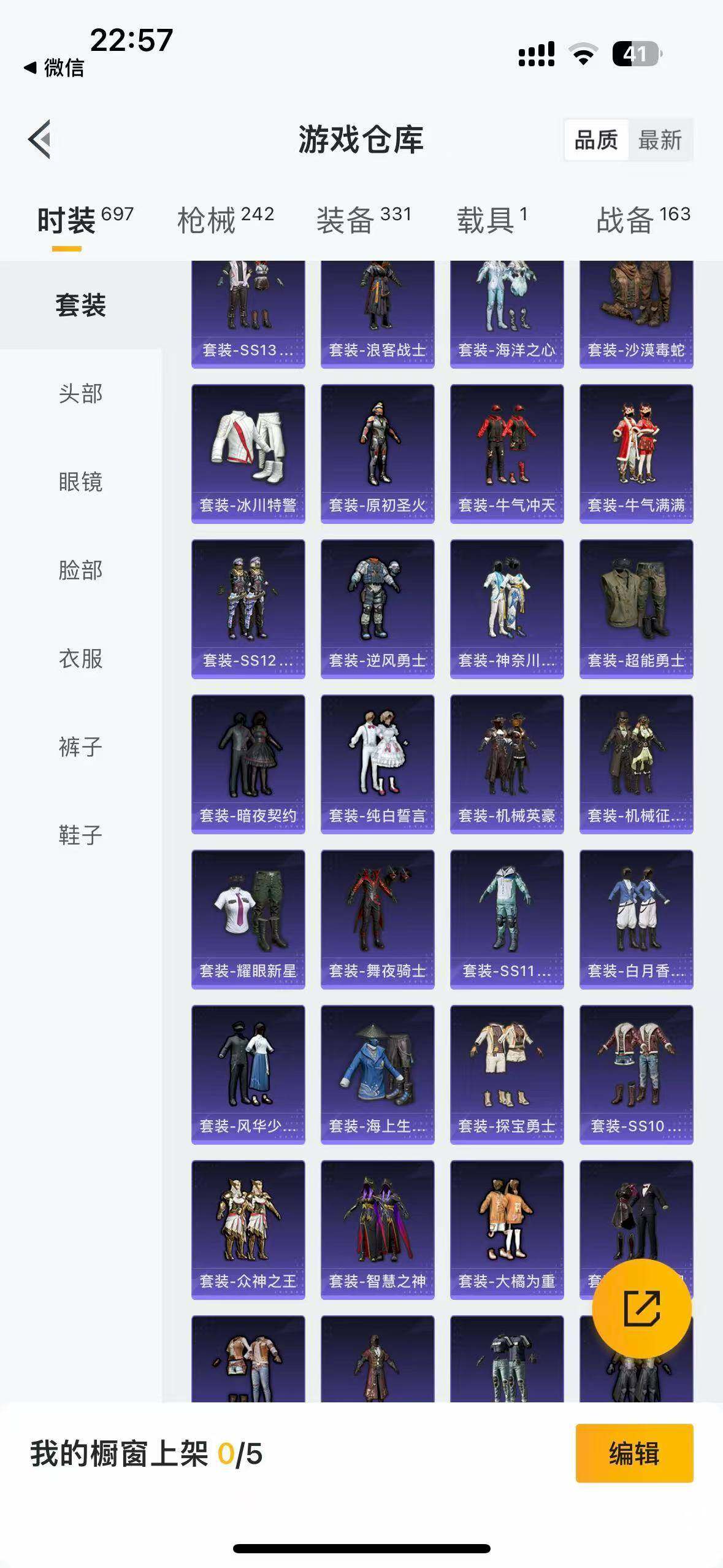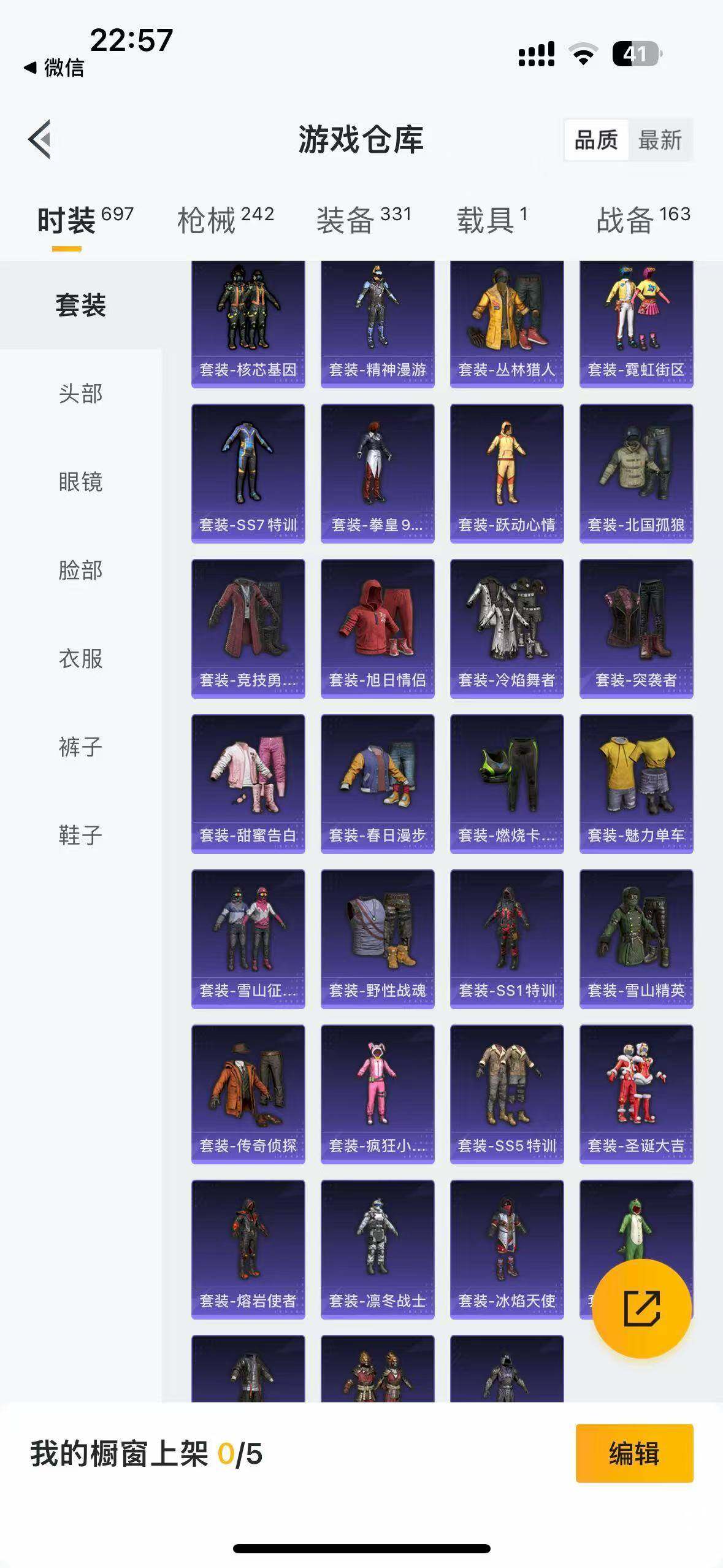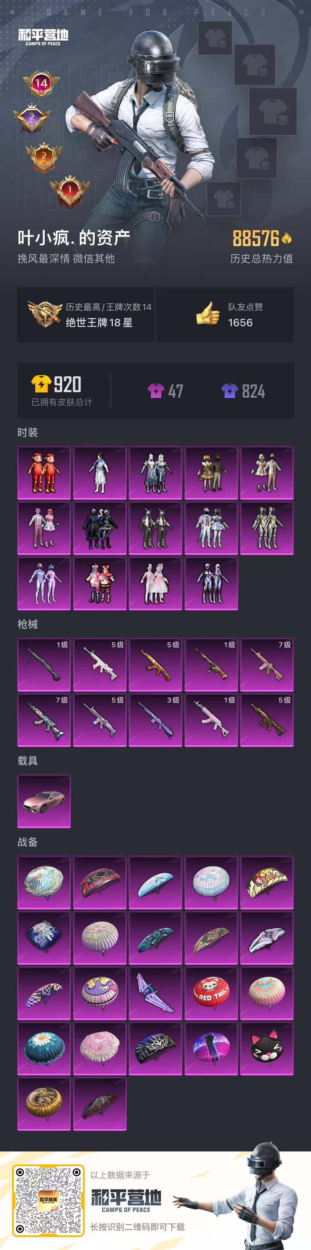 时装数: 697 载具数: 1 枪械数: 242 战备数: 163 热门装扮: 奇异狩猎者,梦幻火箭(新101),甜心巧克力,呆萌铁蟹,数码大师,深海小丑鱼,天启纪元,宝贝奶油派,天使彩虹糖,梦魇先生,迅捷狂鲨,好奇恐龙,甜蜜誓约,绚金战神,俏皮狐尾,甜梦冰蝶,暗夜玫瑰,吟月归客,S1赛事上衣,蜀山剑侠-李逍遥,潮萌小黄鸭,大橘为重,浪客战士,暗夜魅影,猪猪侠 载具: 玛莎拉蒂Ghibli(粉)