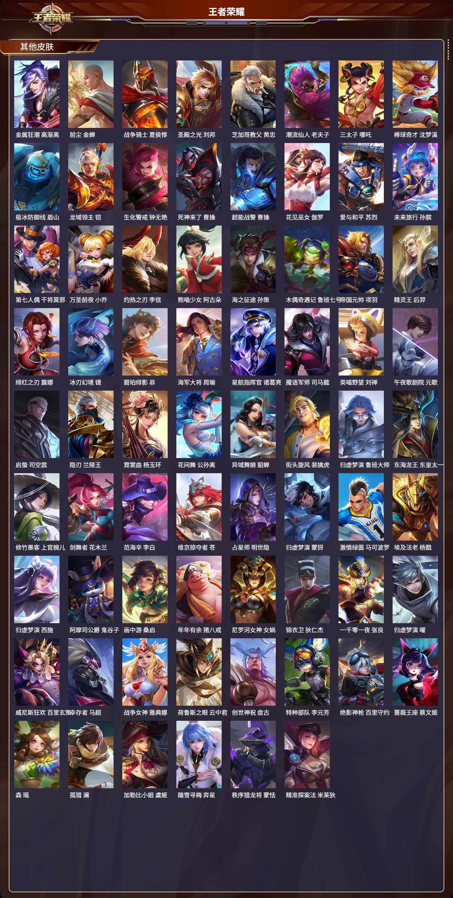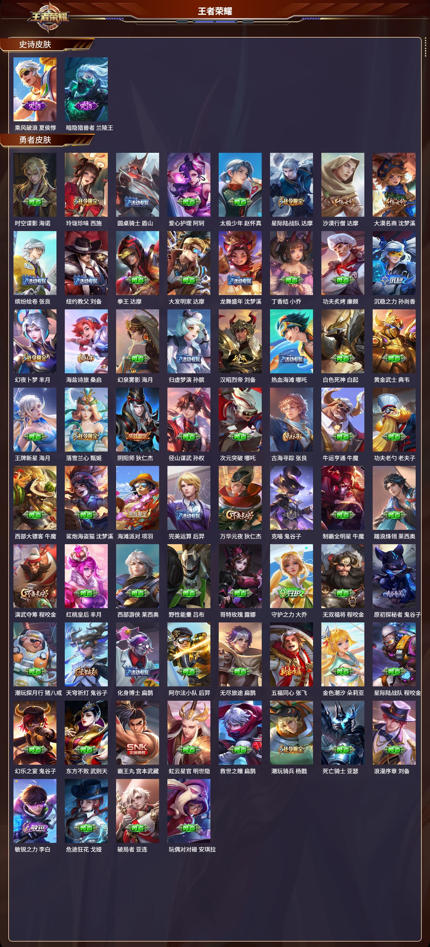 安卓QQ/荣耀王者/359皮肤/128英雄/2典藏/0珍品无双/5无双/0珍品传说/38传说/97史