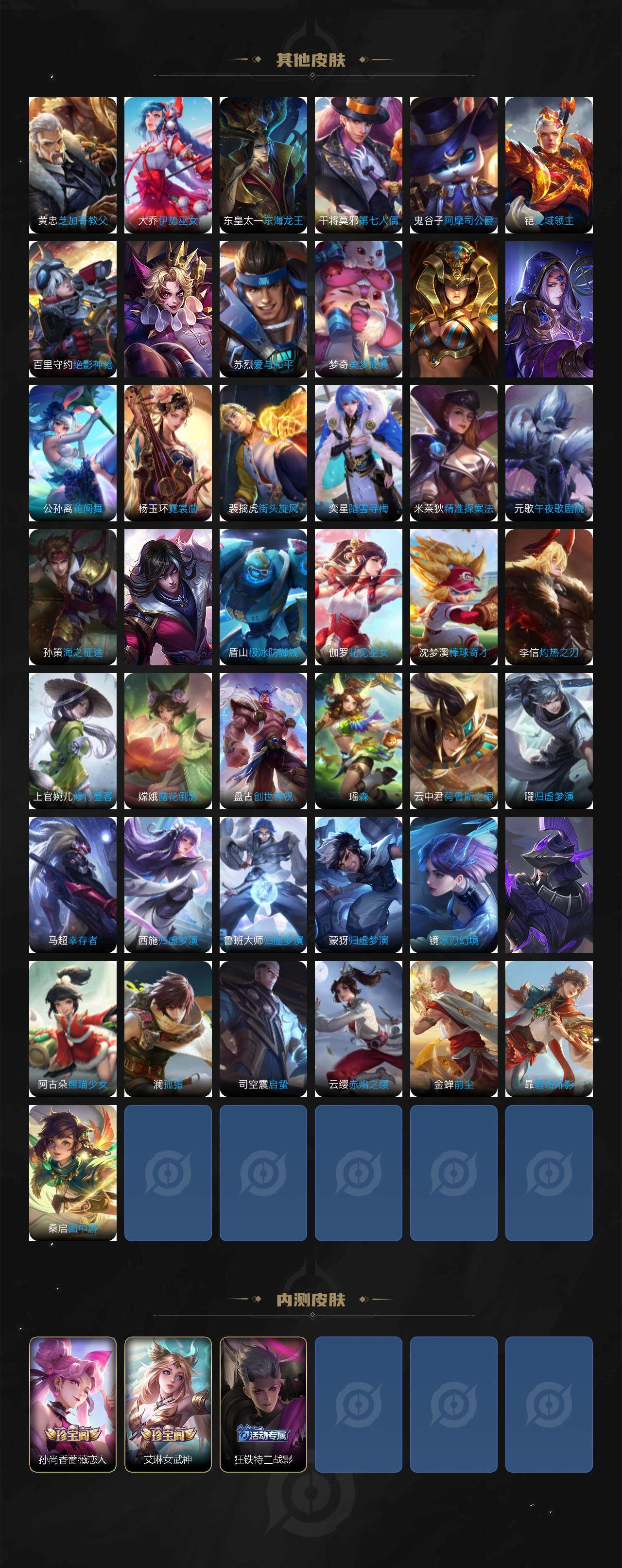 【传说皮肤】:后羿神树通天,云缨幻光神枪,桑启鸣野蒿,澜逐花归海,露娜霜月吟,周瑜音你心动,诸葛亮
