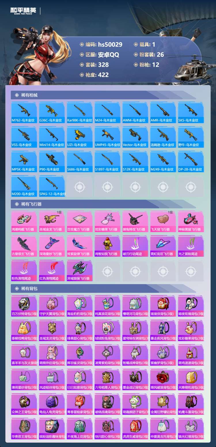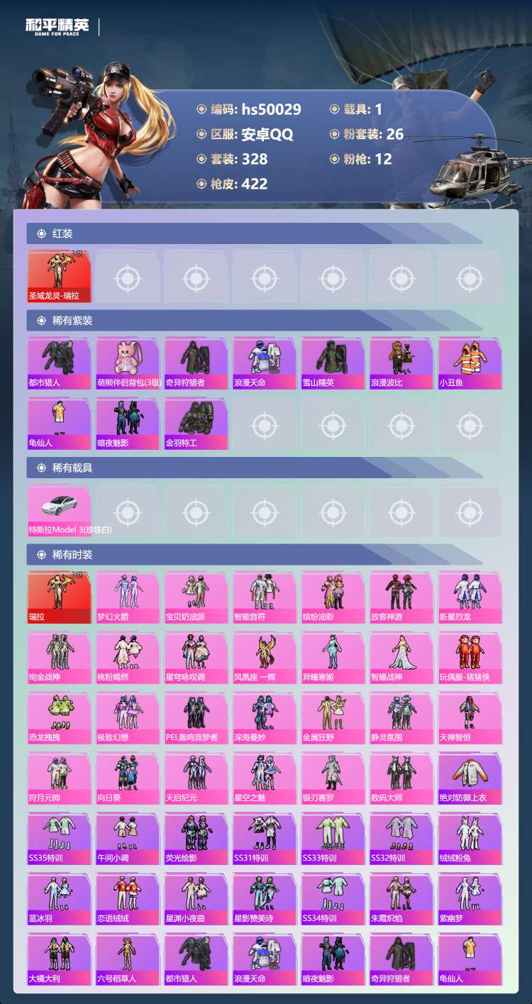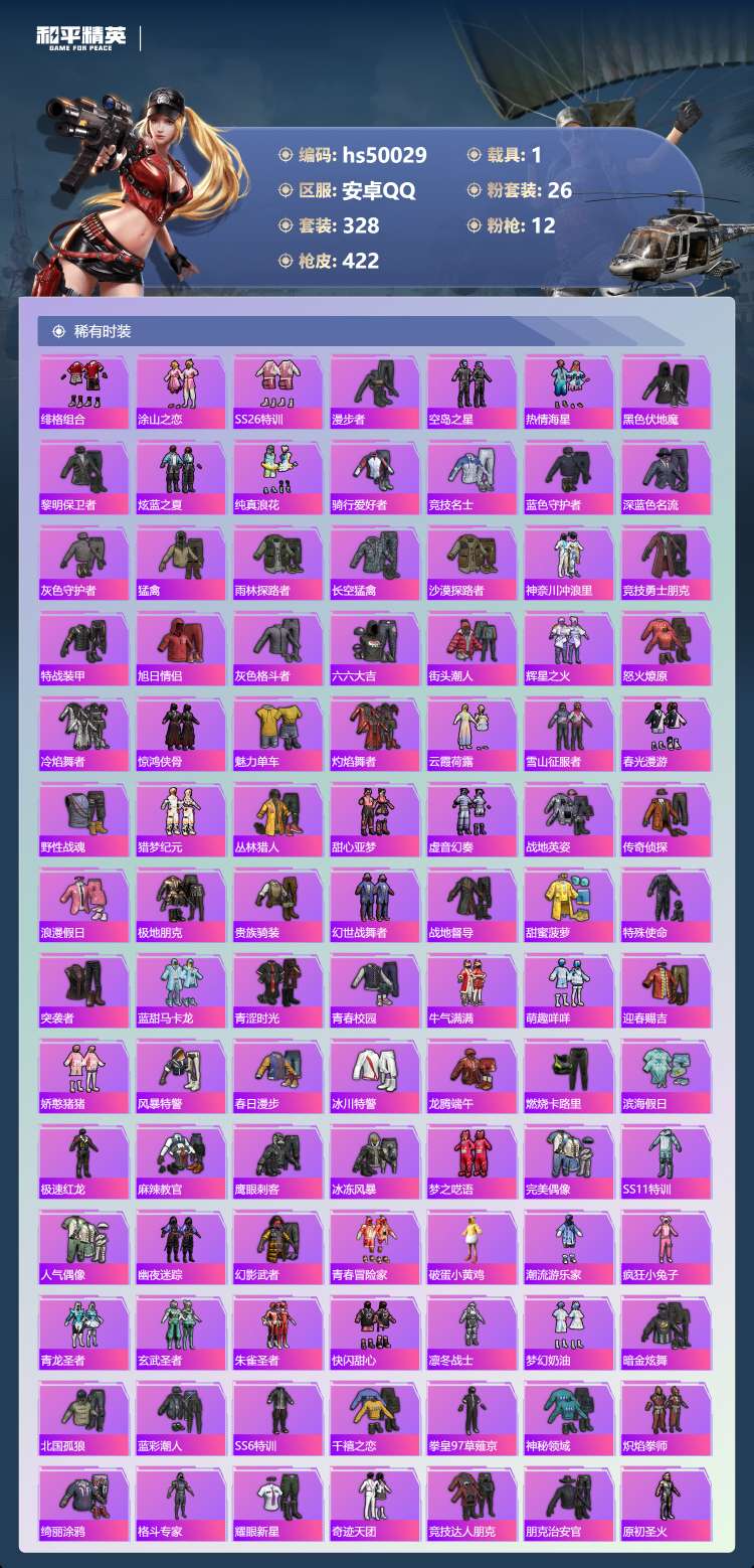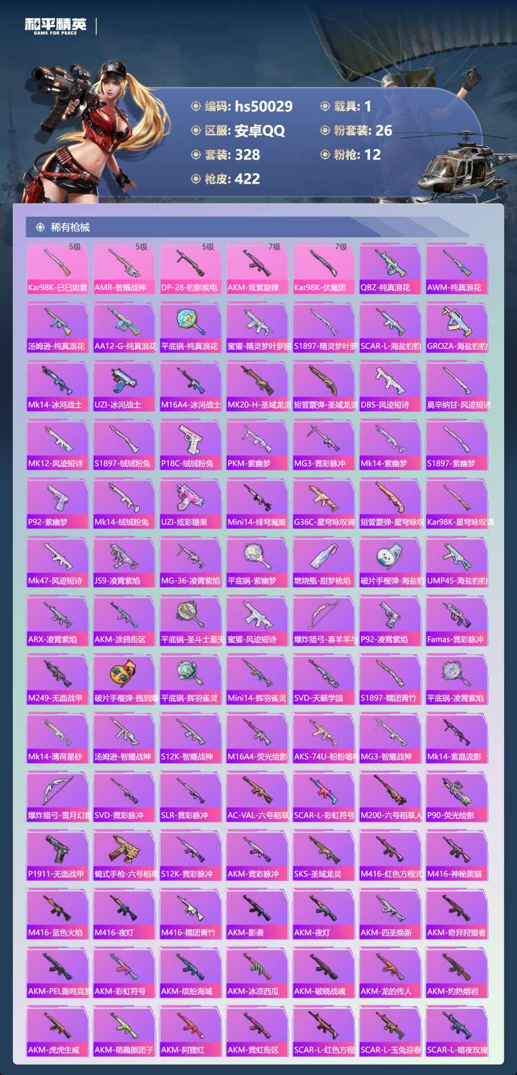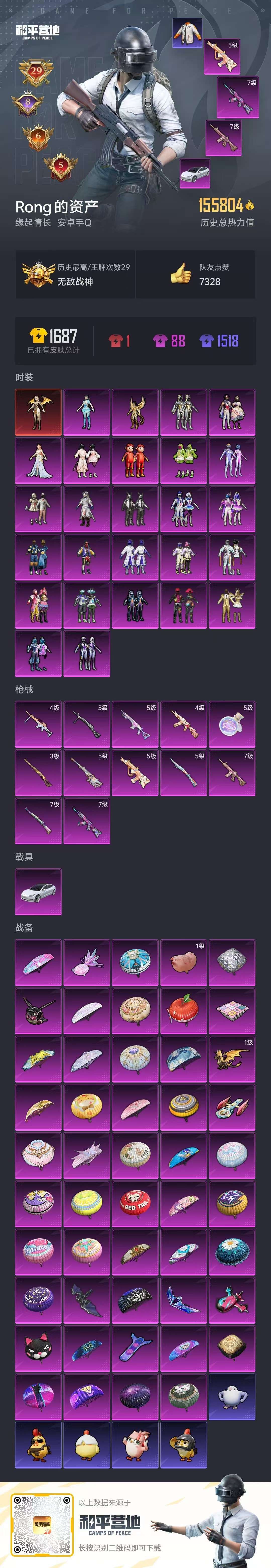 29王牌印记-有战神框-1红装-26粉装-12特效枪-1载具-155804热力值-328套装-422