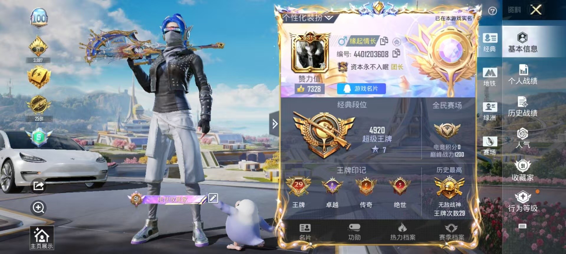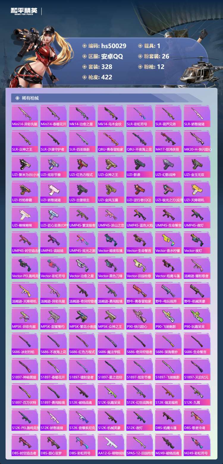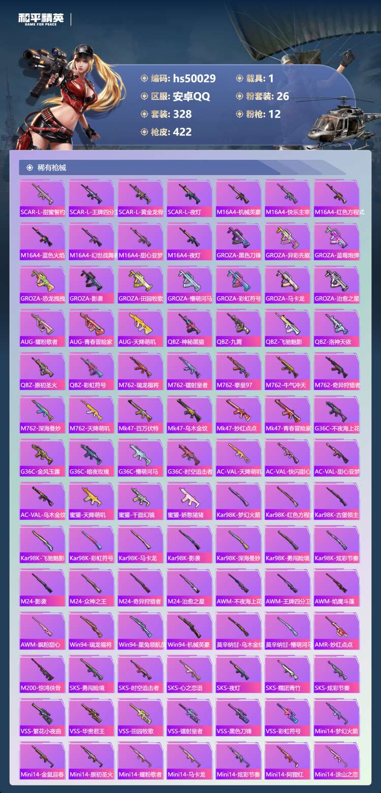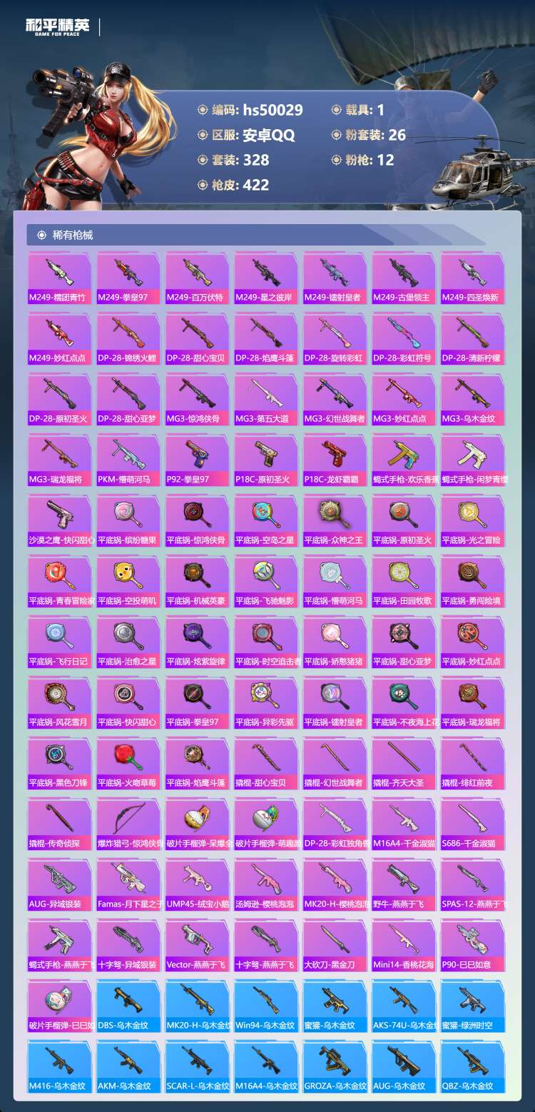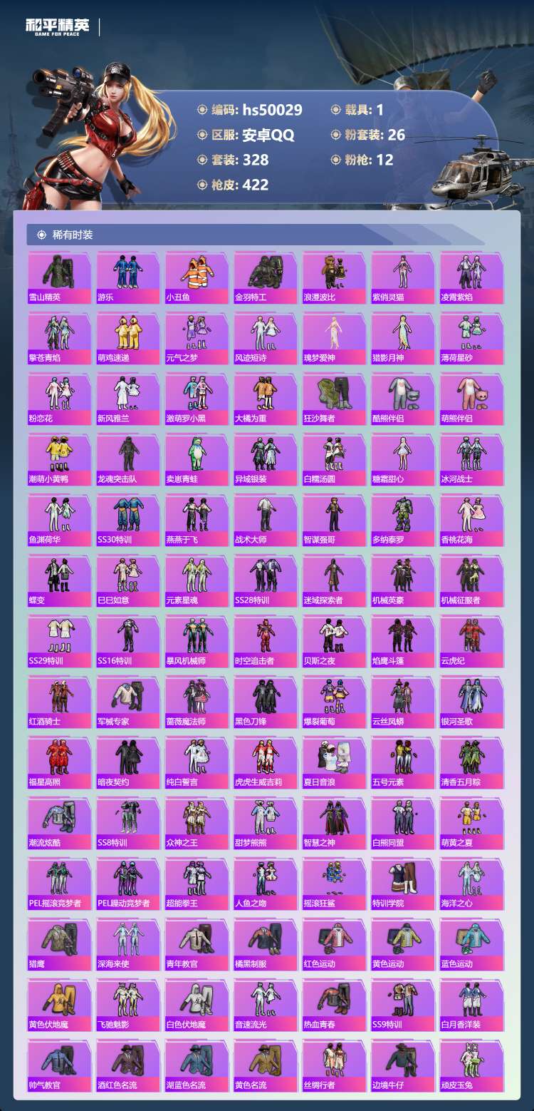 29王牌印记-有战神框-1红装-26粉装-12特效枪-1载具-155804热力值-328套装-422