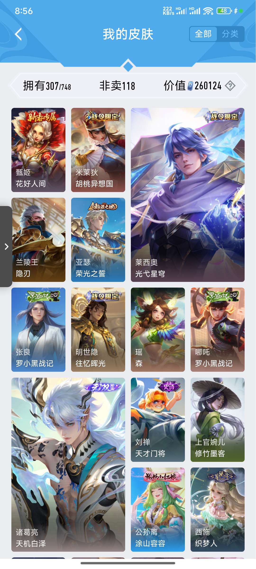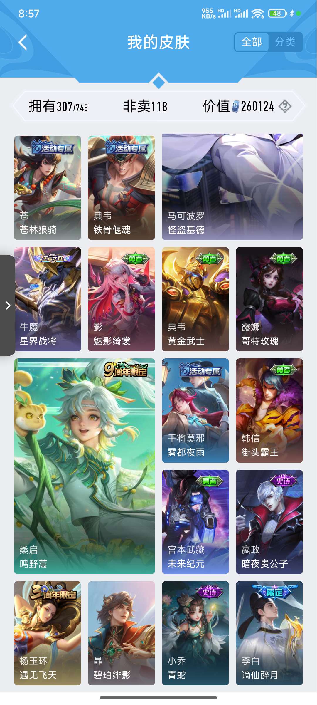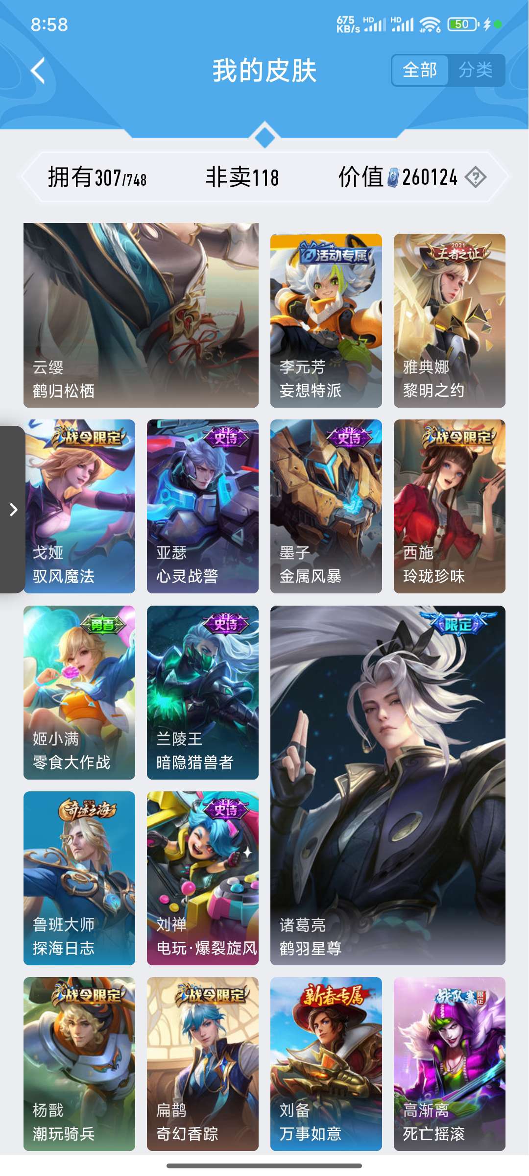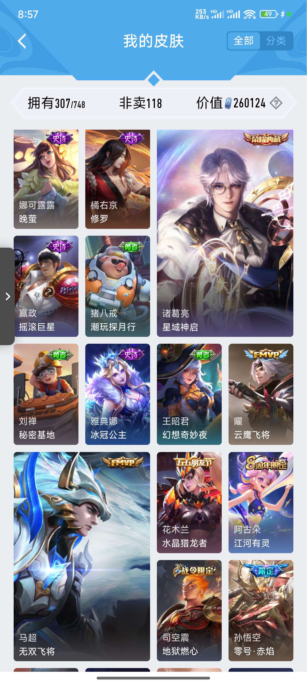 皮肤307 英雄127 荣耀王者 荣耀典藏2 无双皮肤2 珍品传说1 传说24 其他皮肤116-贵九,诸葛全皮带星传说,万战金标诸葛亮,三金标