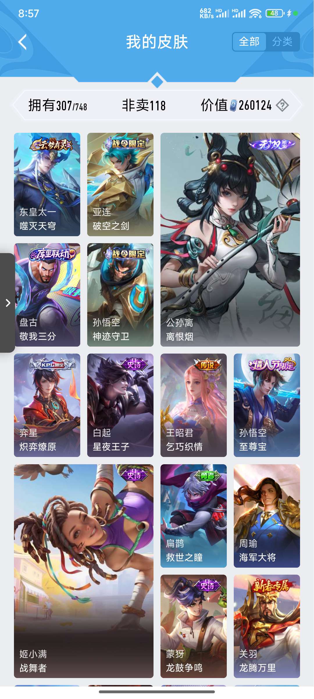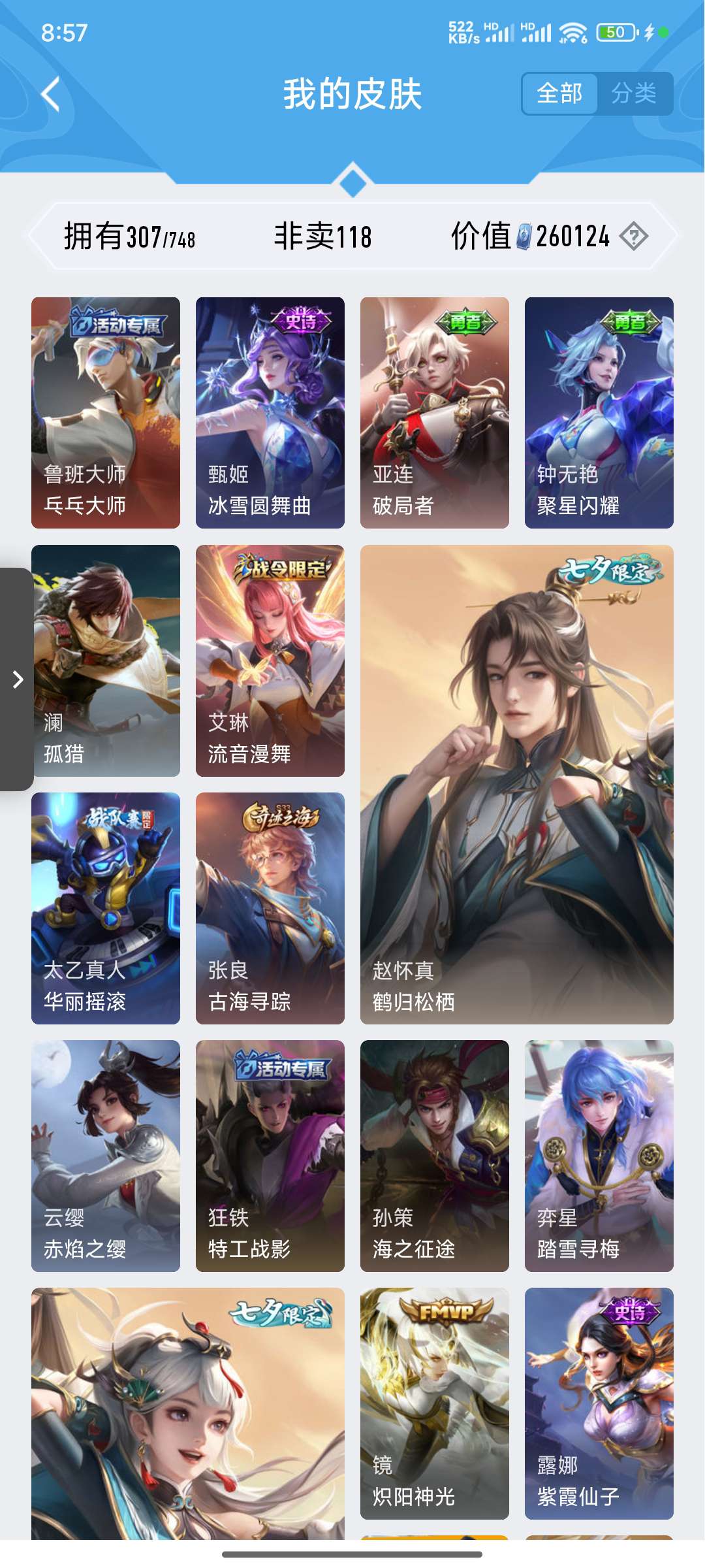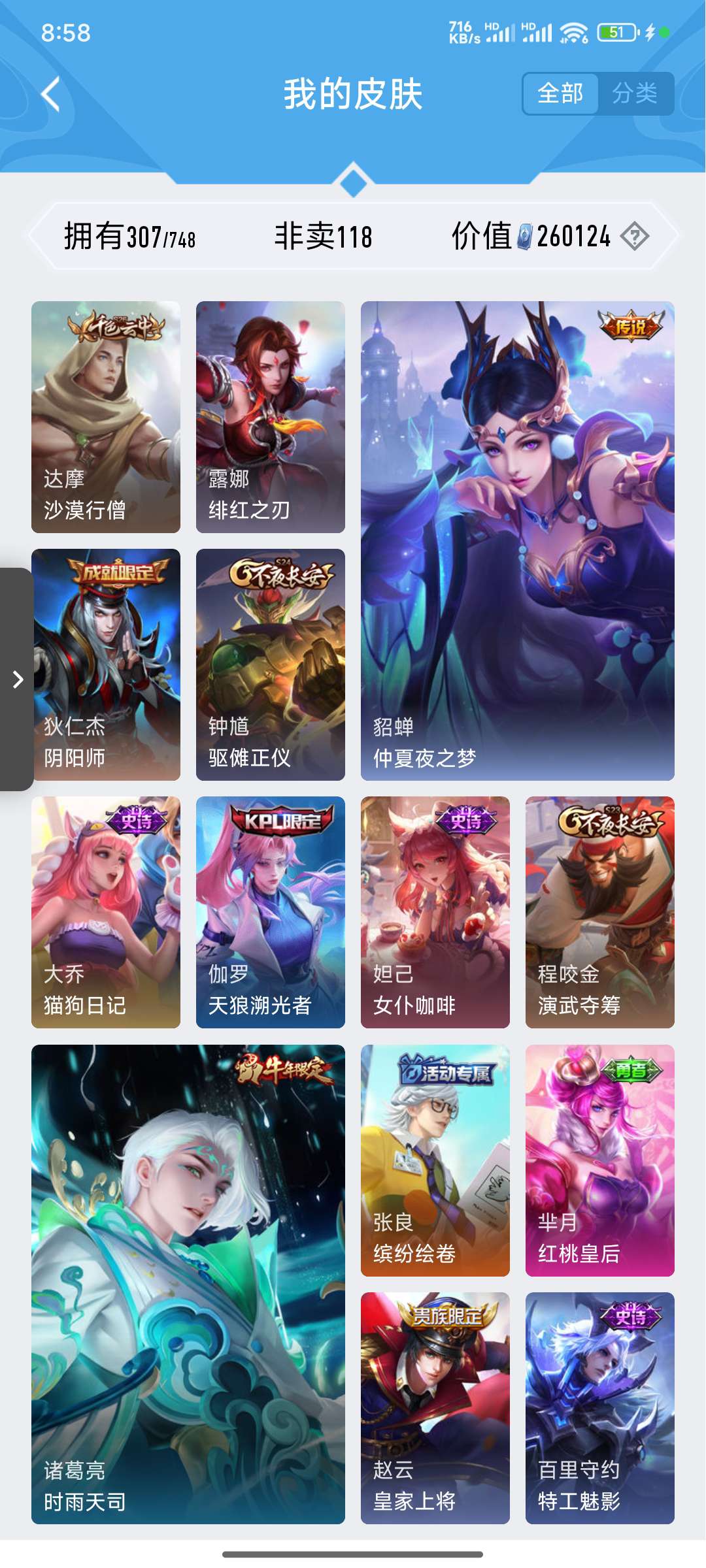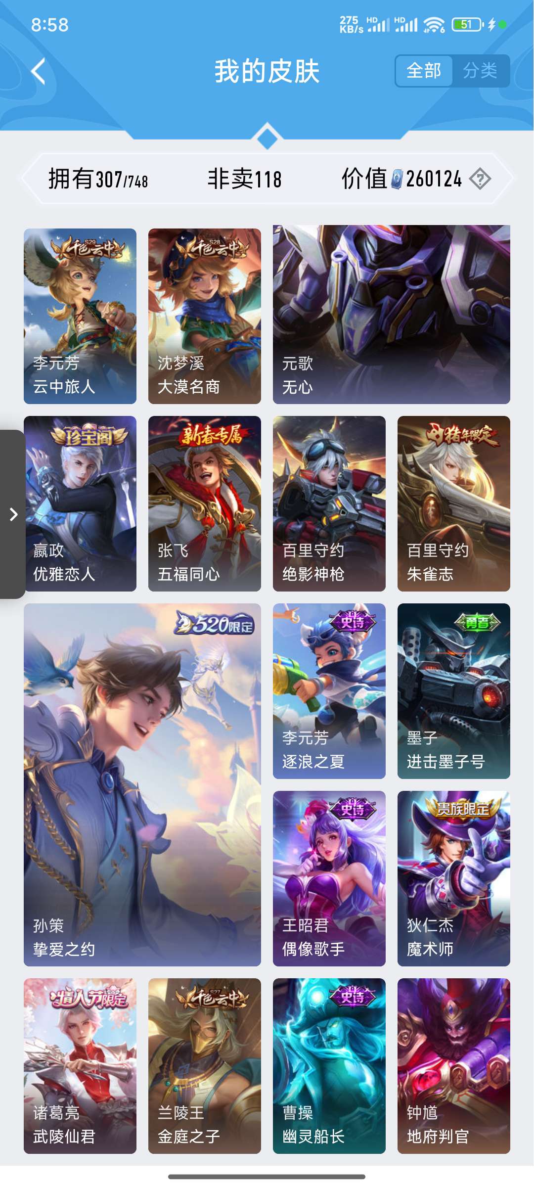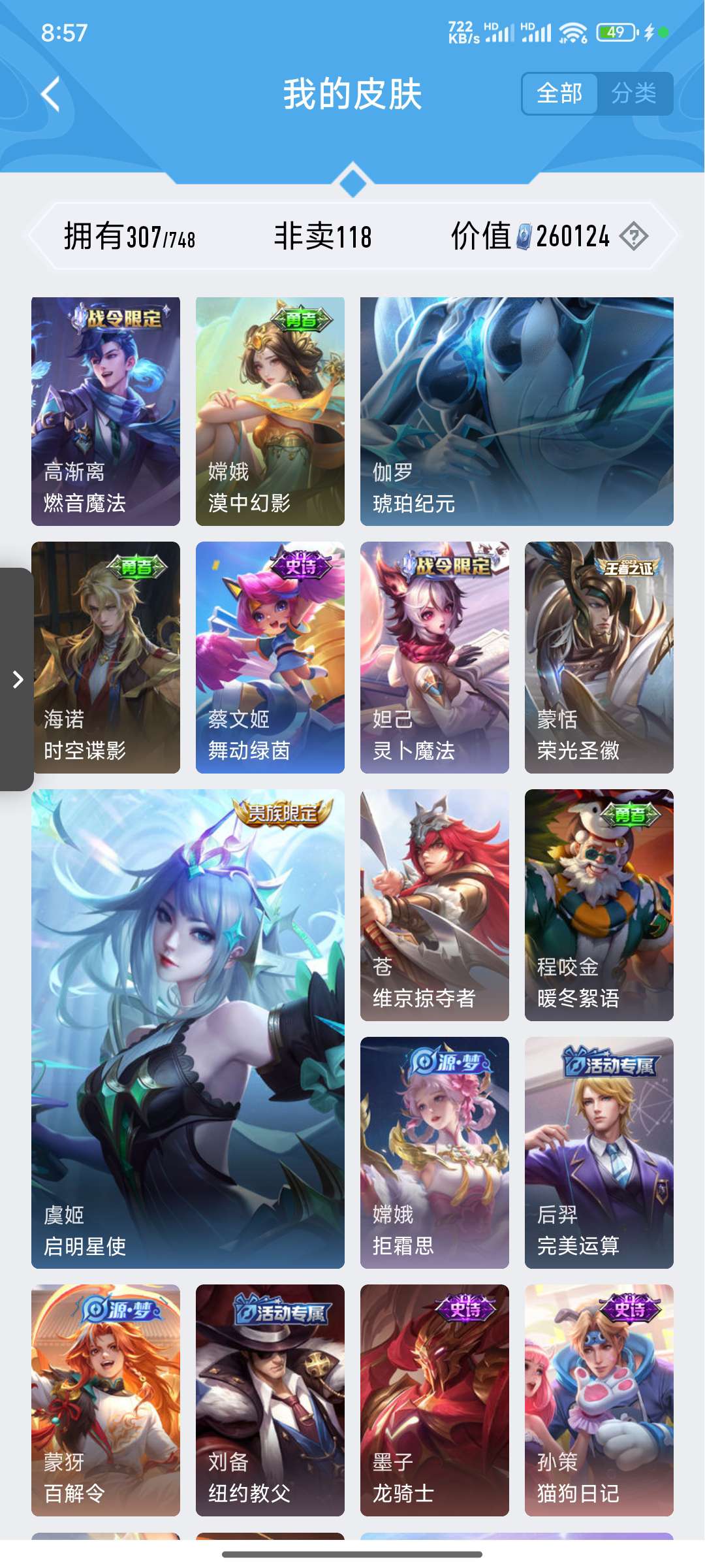 皮肤307 英雄127 荣耀王者 荣耀典藏2 无双皮肤2 珍品传说1 传说24 其他皮肤116-贵九,诸葛全皮带星传说,万战金标诸葛亮,三金标