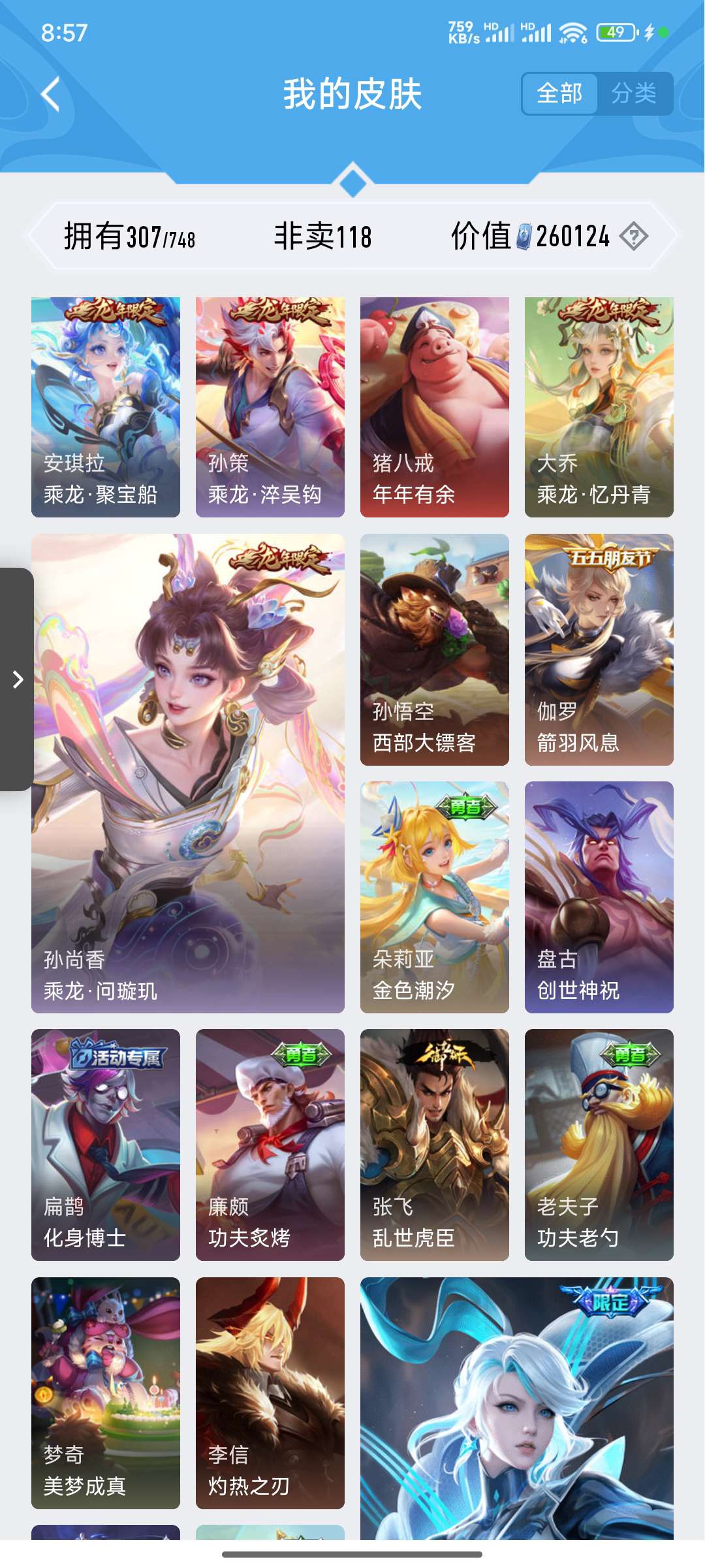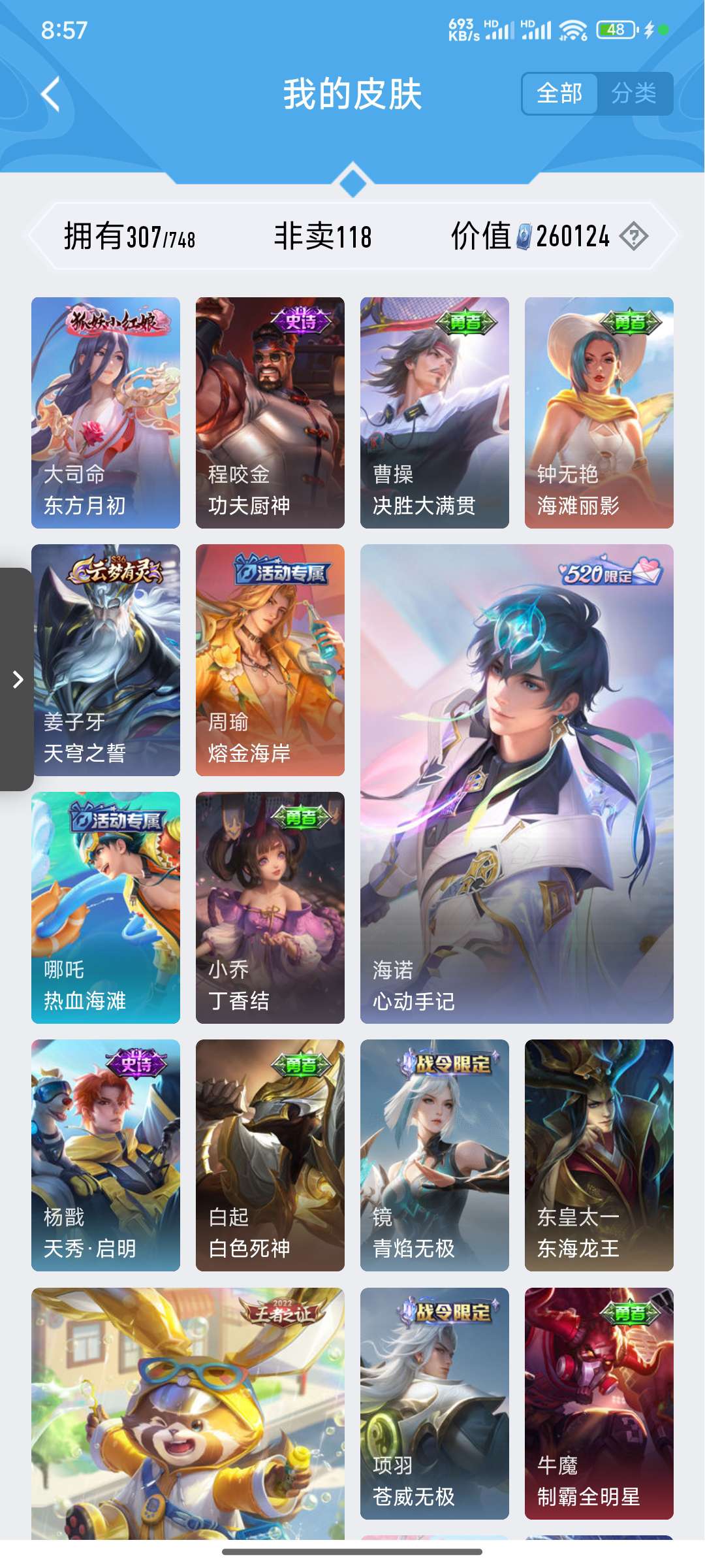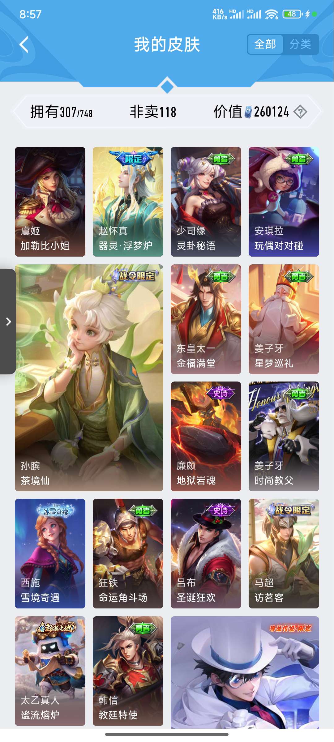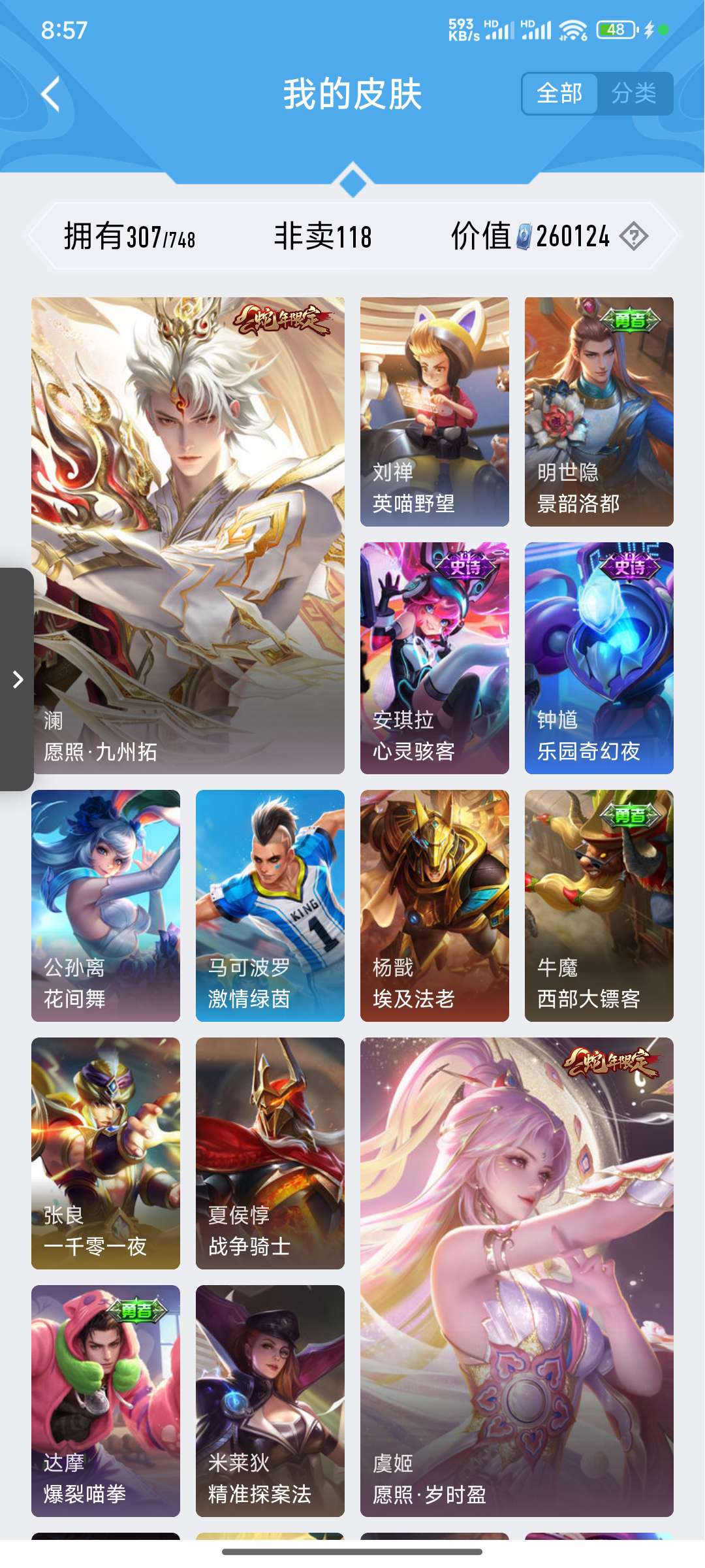 皮肤307 英雄127 荣耀王者 荣耀典藏2 无双皮肤2 珍品传说1 传说24 其他皮肤116-贵九,诸葛全皮带星传说,万战金标诸葛亮,三金标