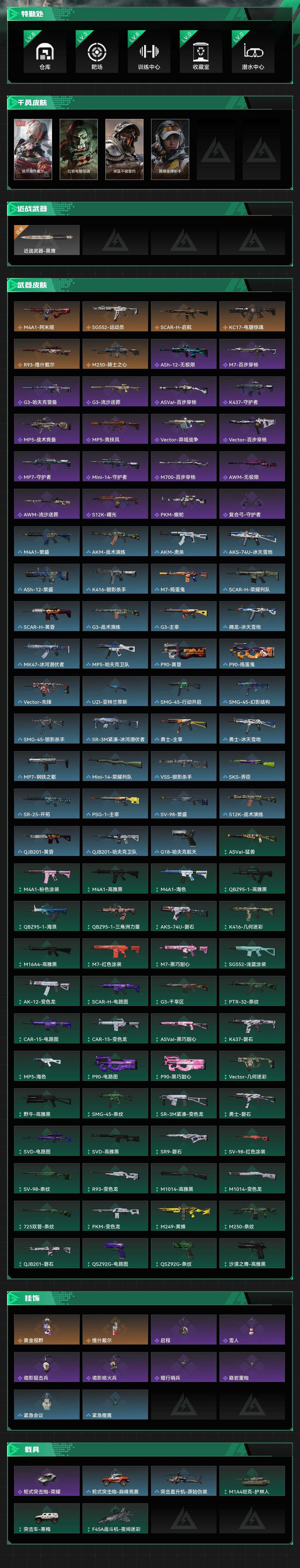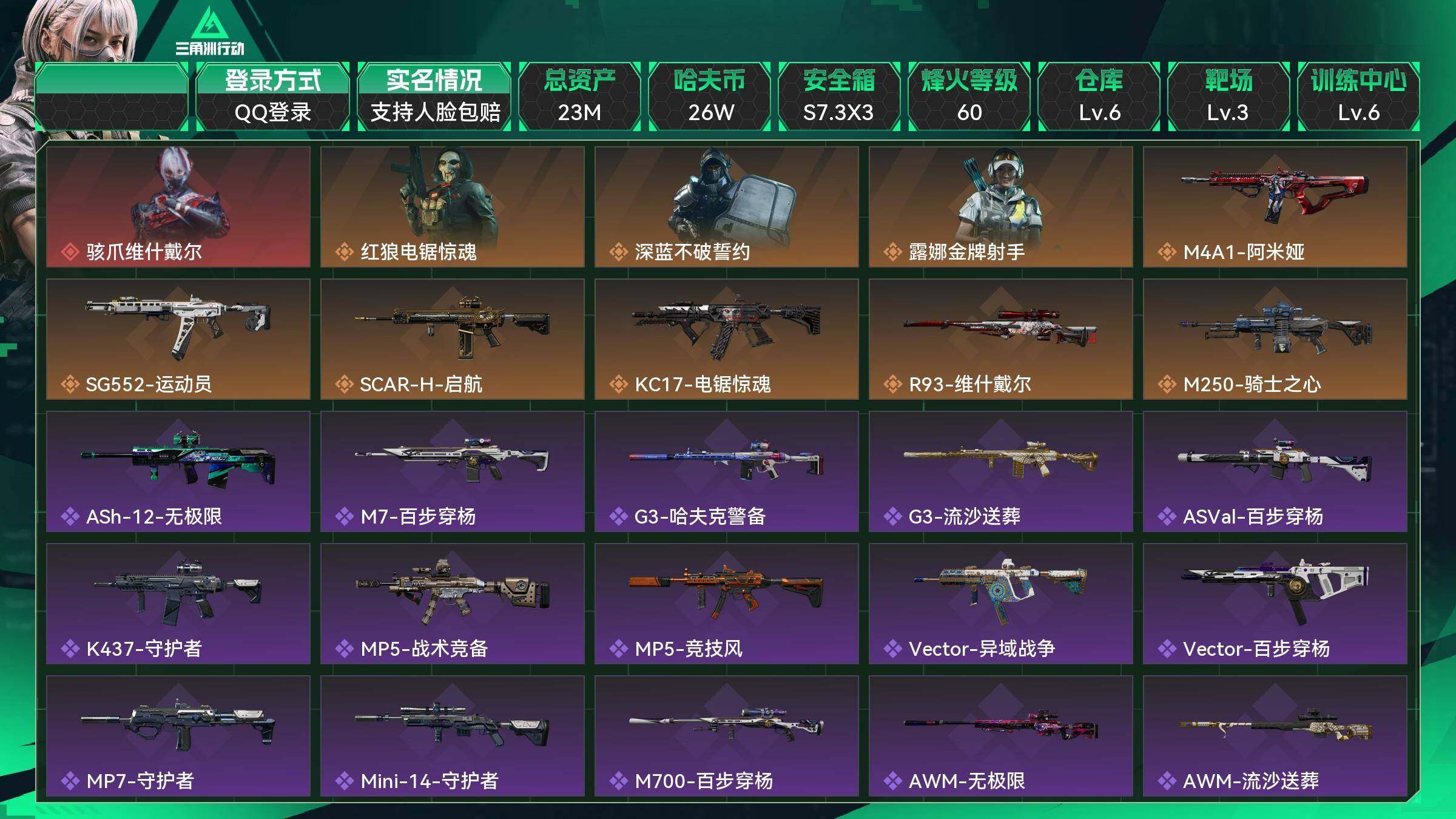 【mhlm699】总资产:23M,哈夫币:26W,武器皮肤105;烽火60级:三角洲巅峰,战场:暂无段位,【安全箱】S7顶级安全箱;【特勤处等级】仓库LV.6,靶场LV.3,训练中心LV.6,收藏室LV.0,潜水中心LV.0;【捆绑包2】维什戴尔捆绑包,电锯惊魂干员捆绑包;【干员皮肤4】骇爪维什戴尔,红狼电锯惊魂,深蓝不破誓约,露娜金牌射手;【近战皮肤】近战武器-黑鹰;【步枪皮肤】M4A1突击步