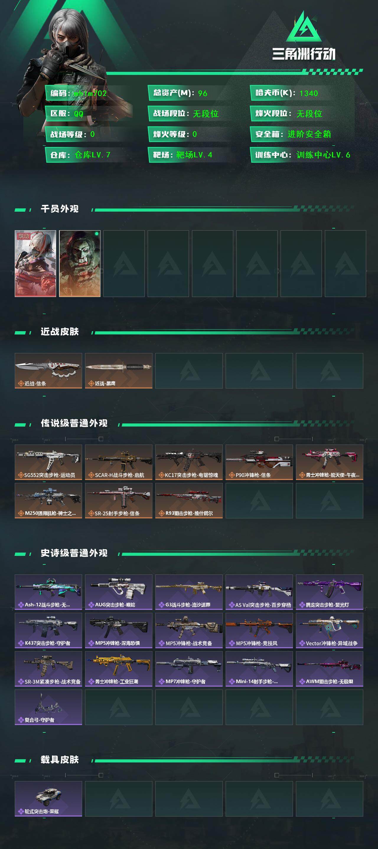 【mhlm702】总资产:96M,哈夫币:134W,武器皮肤93;烽火60级:黑鹰Ⅴ,战场:上等兵Ⅲ,【安全箱】高级安全箱;【特勤处等级】仓库LV.7,靶场LV.4,训练中心LV.6,收藏室LV.0,潜水中心LV.0;【捆绑包3】维什戴尔捆绑包,电锯惊魂干员捆绑包,信条捆绑包;【干员皮肤2】骇爪维什戴尔,红狼电锯惊魂;【近战皮肤】近战武器-信条,近战武器-黑鹰;【步枪皮肤】SG552突击步枪-运