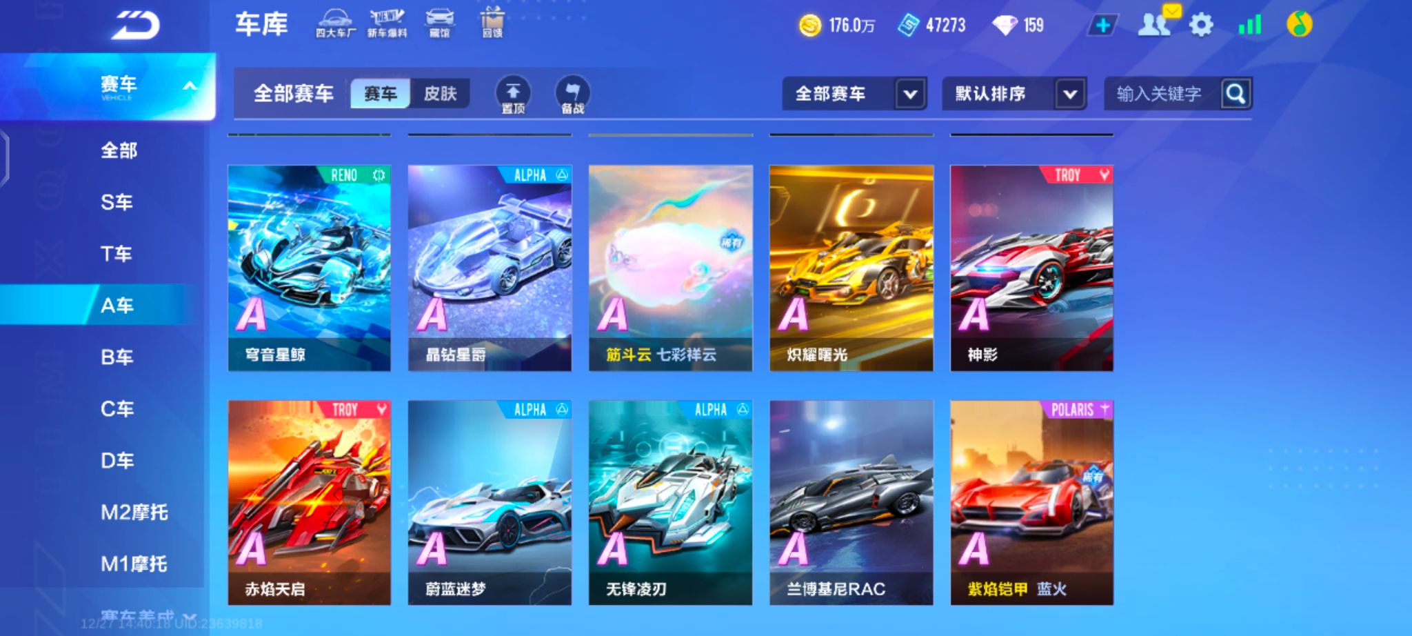 冰魄+霆光+璨雪恋歌男装A车数量48游戏等级81贵族等级6车
