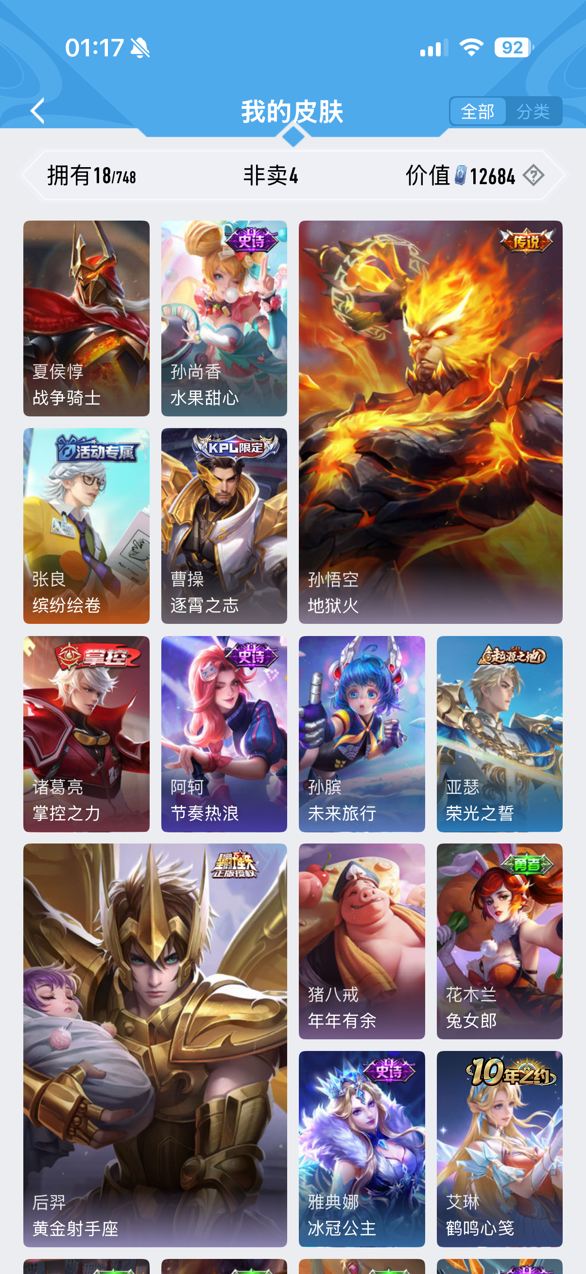 皮肤18 英雄36 至尊星耀 传说2 其他皮肤6-小号看得起的来,价格可议