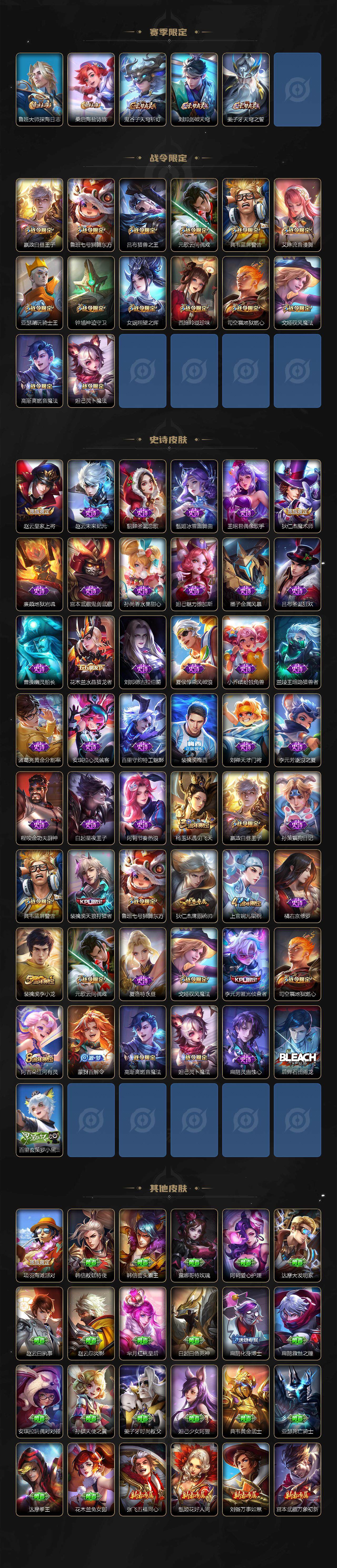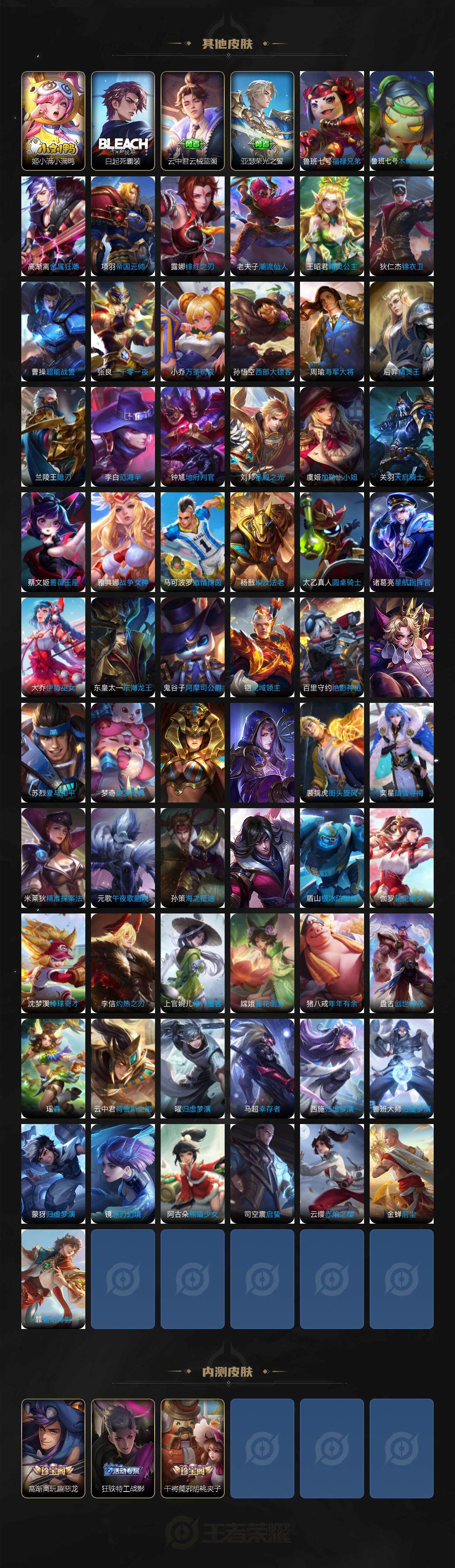 【限定皮肤】:白起狰,姜子牙天穹之誓,狄仁杰阴阳师,赵云皇家上将,嬴政白昼王子,鲁班七号狮舞东方,高渐离玩趣恶龙,芈月重明,吕布猎兽之王,元歌云间偶戏,夏侯惇朔风刀,曹操烛龙,典韦穷奇,典韦