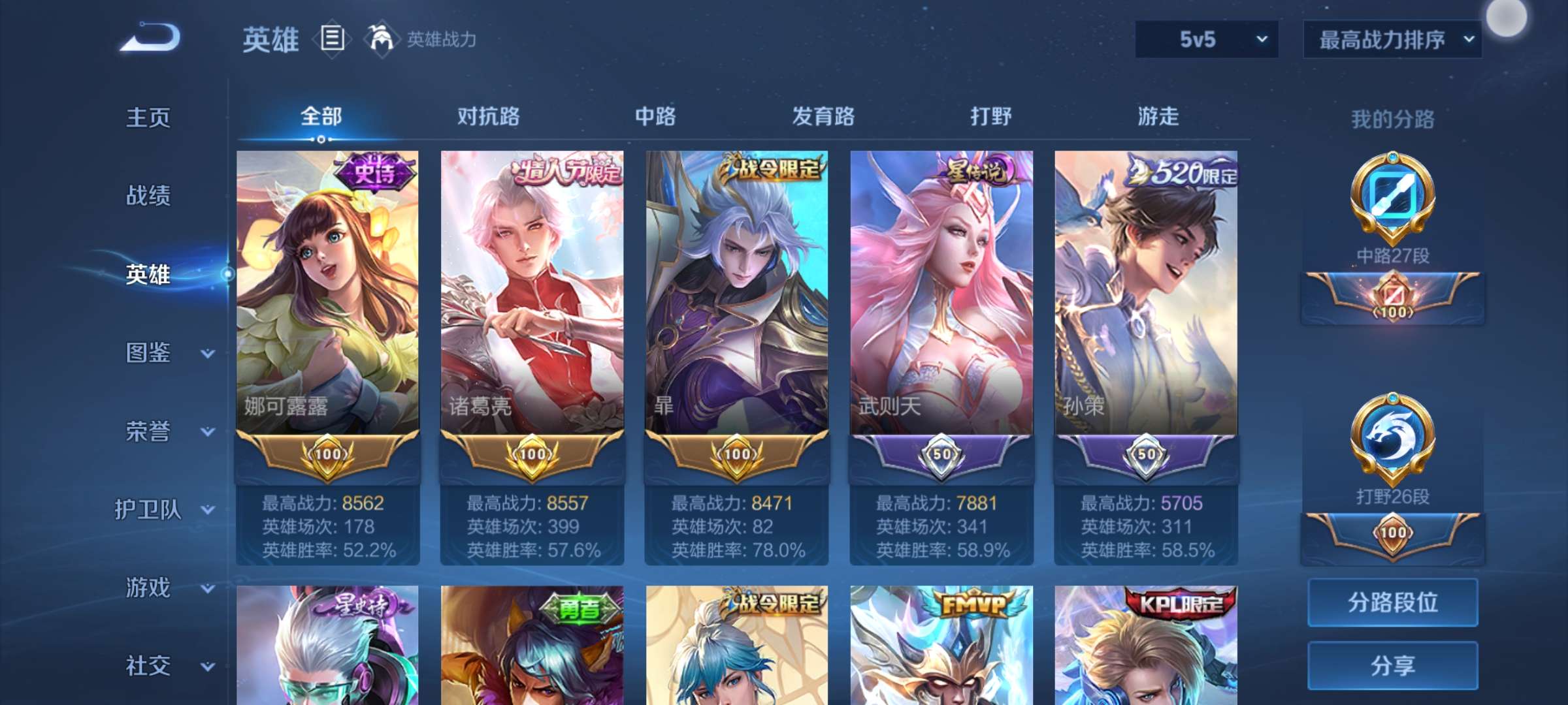 皮肤381 英雄127 传奇王者 荣耀典藏4 珍品传说1 传说19 其他皮肤174-马上贵九381皮肤,野王带妹号,娜可露露诸葛亮霏近九千战力,高胜率高评分