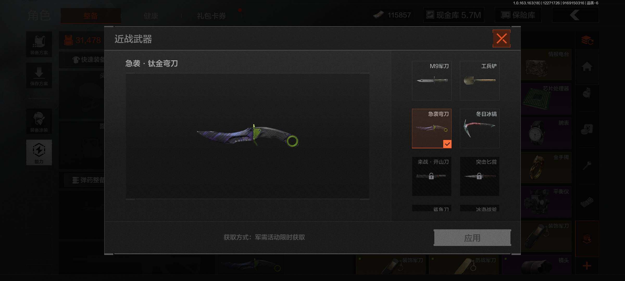 【AQN62】等级:30/段位:王牌/柯恩币:115857/工兵铲/冬日冰镐/急袭弯刀