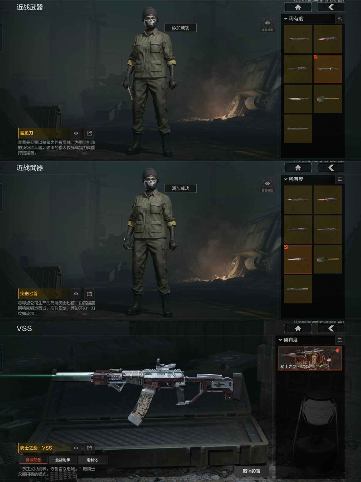 MWT4161【精品 瑞兔 7刀】安卓Q-等级30-仓库价值23m-科恩币1596k现金库15m-【枪皮】 骑士之剑·VSS 【近战武器】 胜利军刀 瑞兔折刀 野战折刀 突击匕首 鲨鱼刀 工兵铲 开山刀