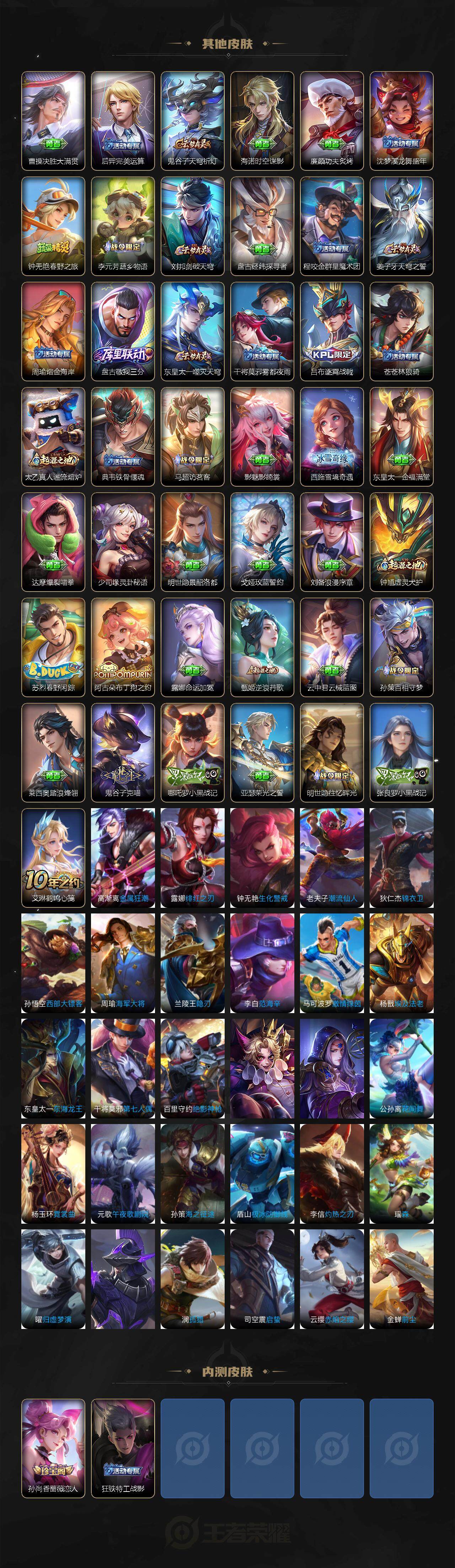 【限定皮肤】:姜子牙天穹之誓,狄仁杰阴阳师,赵云皇家上将,孙尚香蔷薇恋人,元歌无心,马可波罗山海玄木吟,狄仁杰魔术师,项羽海滩派对,李元芳云中旅人,百里玄策原初追逐者,裴擒虎擒涛扼浪,嫦娥拒霜思,嫦