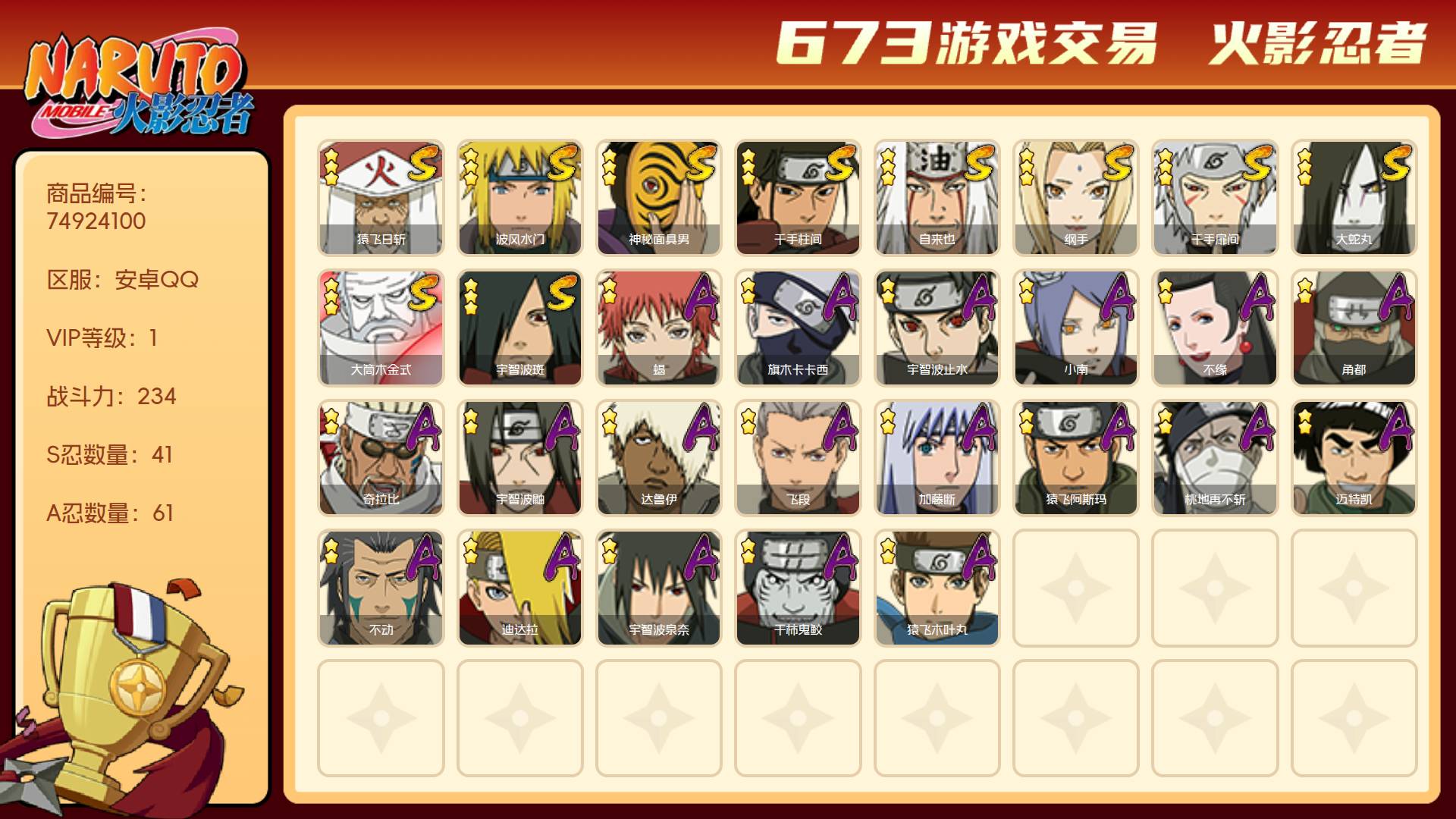 角色等级158 金币123 战斗力234 S忍41 A忍61 5星S忍者243 1 段位新生