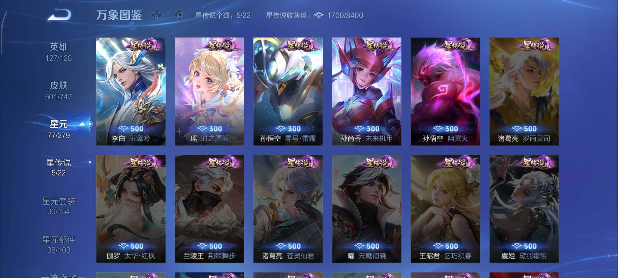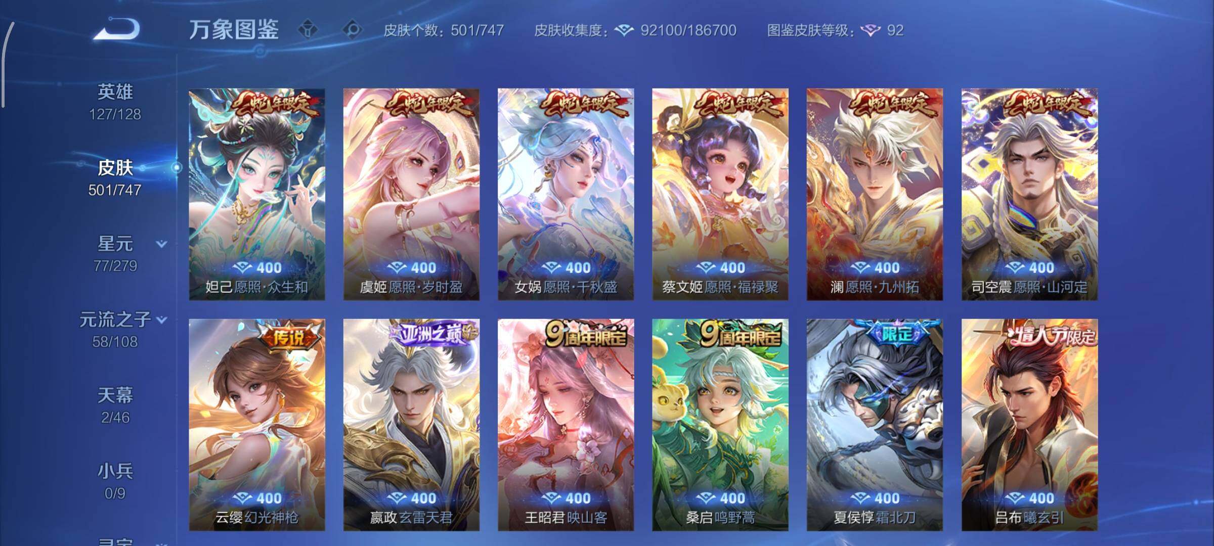 【精氪贵族v10·全皮花木兰·全皮孙悟空·全皮露娜·全皮女娲·3无双·4典藏·3珍品·61传说·缺11抽出水晶·鸿兔大展天幕·5星传说·紫瑶·玉鸾吟·千劫归真·满蛇年限定·满龙年限定·满兔年限定·满鼠年限定·满虎年限定·满五虎上将·可二次】YXw9374-安卓Q-127英雄-501皮肤-21王者印记-300铭文-贵族积分24w【贵族10】【4典藏·3无双·3珍品·5