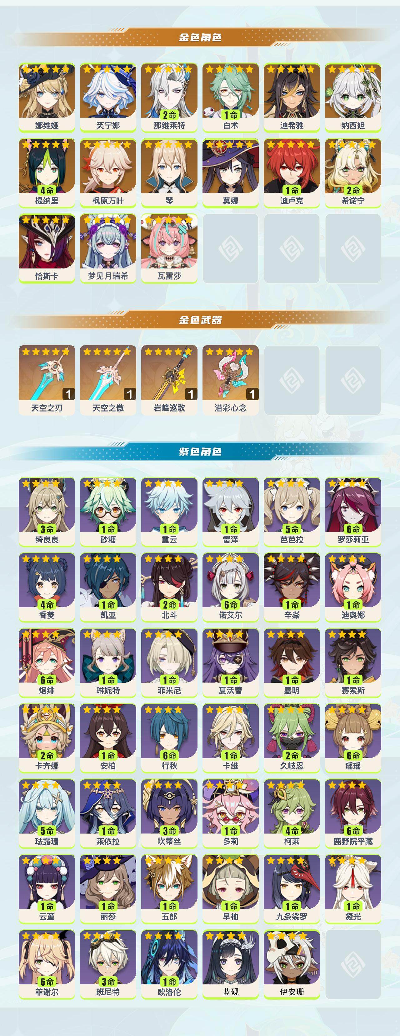 【YSYT301】59级/男主/17个五星角色/0命瓦雷莎/梦见月瑞希/恰斯卡/2命希诺宁/娜维娅/芙宁娜/2命那维莱特/1命白术/迪希雅/纳西妲/4命提纳里/枫原万叶/琴/1命迪卢克/莫娜/精1溢彩心念/岩峰巡歌/天空之傲/天空之刃/0命伊安珊/0命蓝砚/0命欧洛伦/2命卡齐娜/1命赛索斯/1命嘉明/1命夏沃蕾/1命菲米尼/琳妮特/3命绮良良/卡维/满命瑶瑶/5命珐露珊/1命莱依拉/3命坎蒂丝/1命多莉/4命柯莱/满命鹿野院平藏/2命久岐忍/云堇/0命五郎/0命九条裟罗/0命早柚/满命烟绯/满