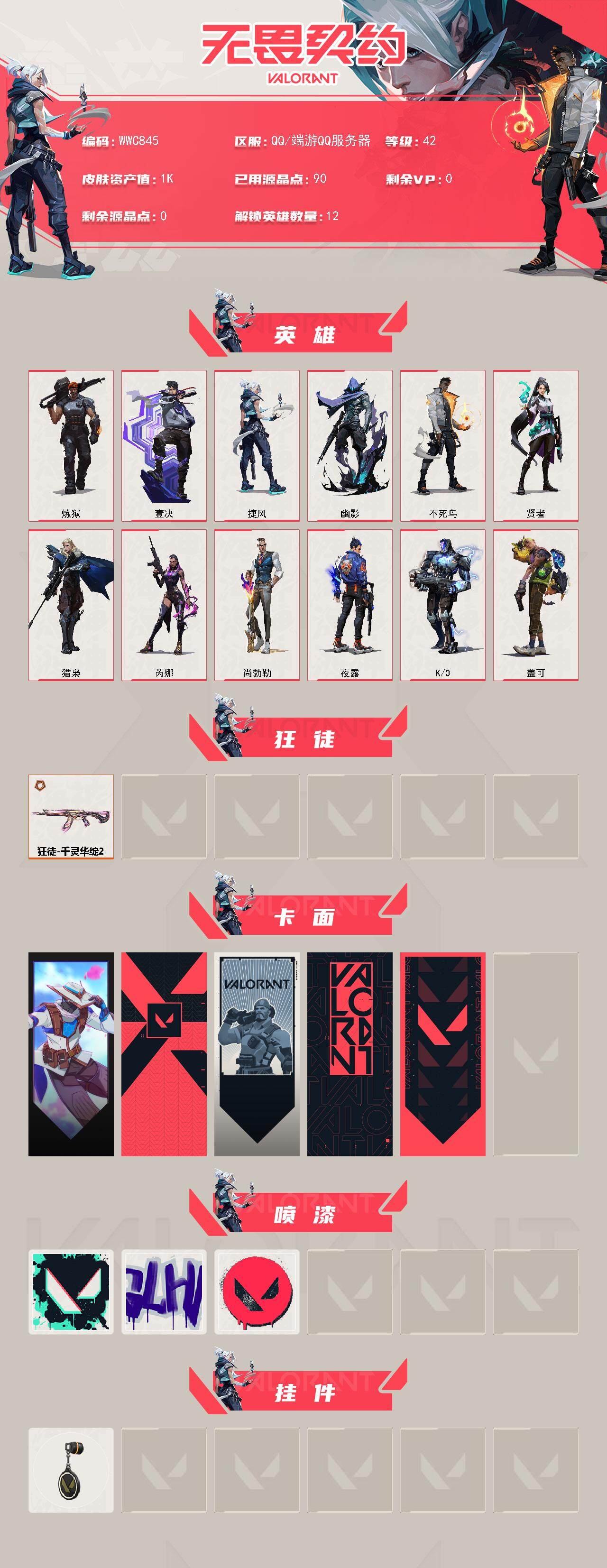 【WWC845】终极*1/皮肤*2/等级*42/段位:白银/炼狱/壹决/捷风/幽影/不死鸟/贤者/猎枭/芮娜/尚勃勒/夜露/K/O/盖可/狂徒-千灵华绽//2.0/无畏契约GO!第一卷:零 卡面/代号红色 卡面/新兵报到 卡面/V契约 卡面/无畏契约 卡面/胜利属于无畏契约 喷漆/GLHF 喷漆/无畏契约 喷漆/无畏契约 纪念币 挂饰