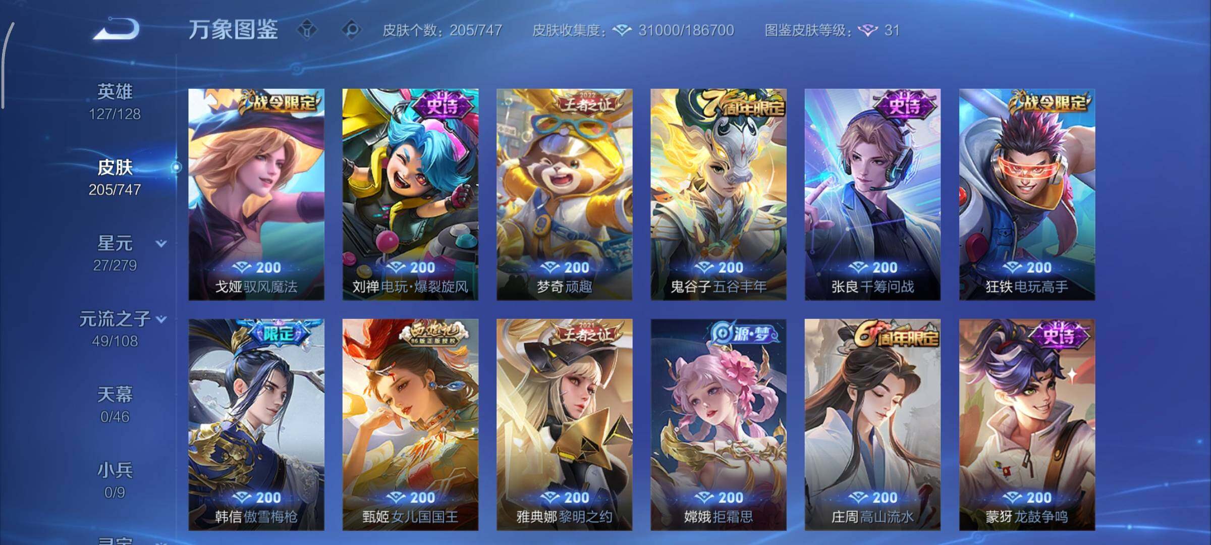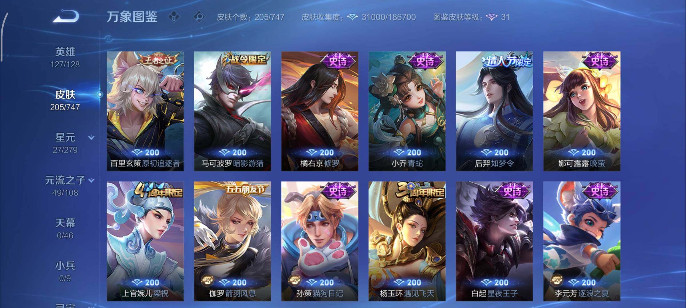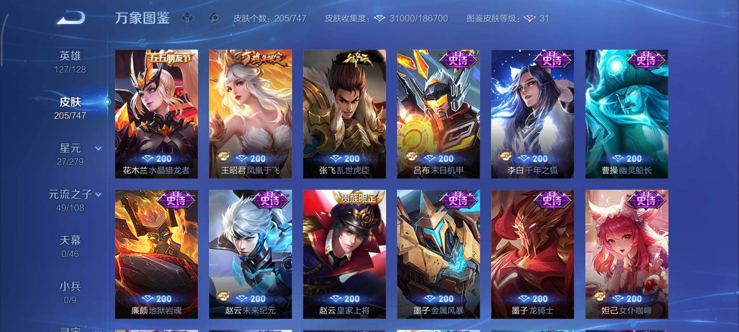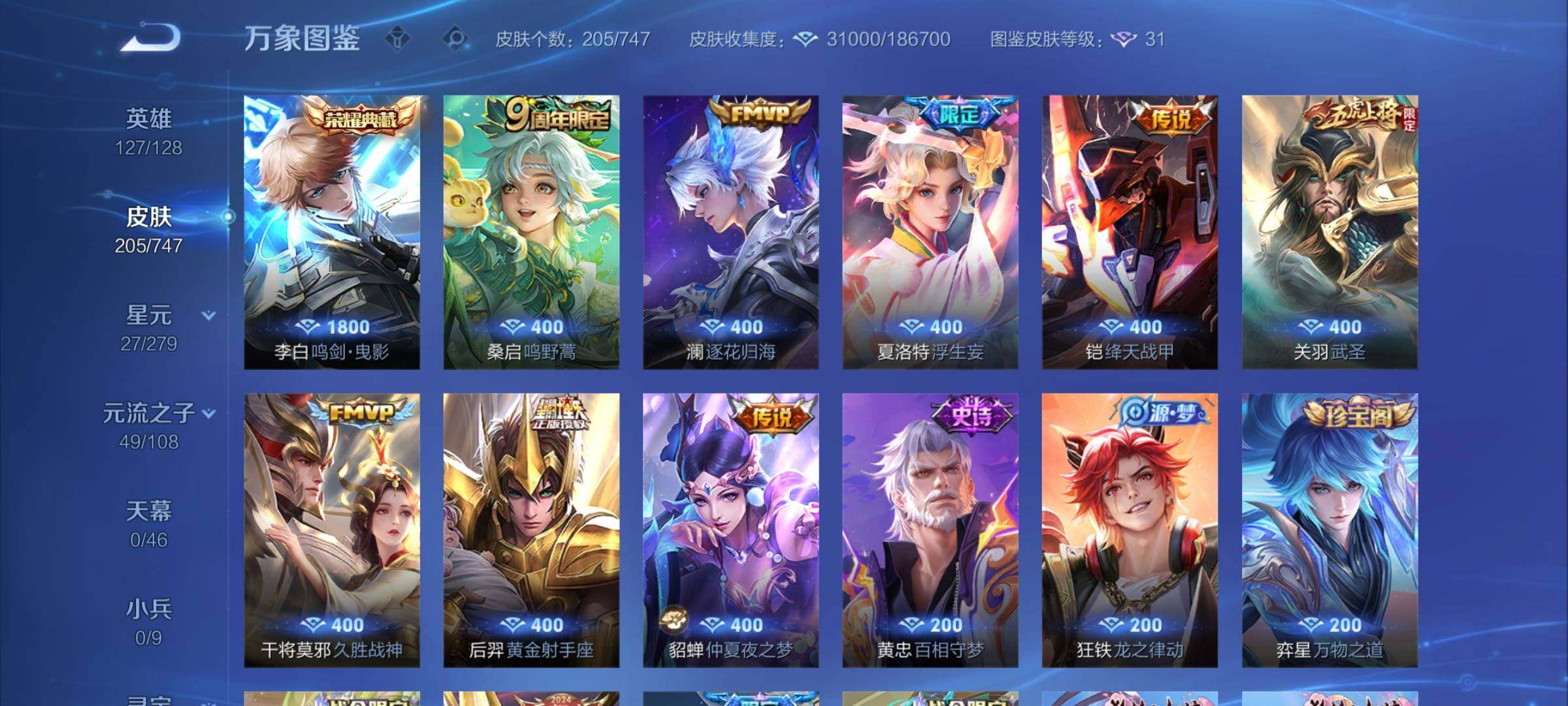 可换绑【李白典藏 浮生妄 关羽武圣 傲雪梅枪 多传说限定质量号】幸运值241,5按键,1星传说,15王者印记,五级铭文140,可二次KK7119,安卓Q-V7-205皮肤-1典藏皮肤-8传说-77史诗【荣耀典藏】:李白鸣剑曳影【星元皮肤】:貂蝉金色仲夏夜【传说皮肤】:桑启鸣野蒿,澜逐花归海,夏洛特浮生妄,铠绛天战甲,关羽武圣,干将莫邪久胜战神,后羿黄金射手座,貂蝉