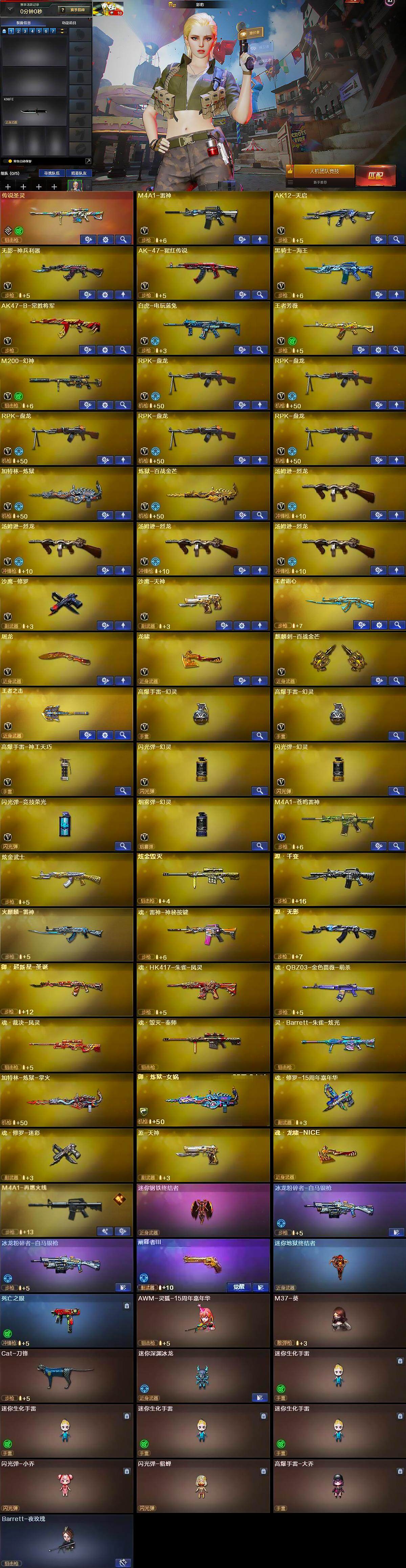 【热门武器】:传说圣灵,M200-幻神,死亡之眼,白虎-电玩蓝兔,Cat-刀锋,汤姆逊-烈龙*4,RPK-盘龙*5,加特林-炼狱,羊驼玩偶,沙鹰-修罗,黄金猫猫手套-白鲨