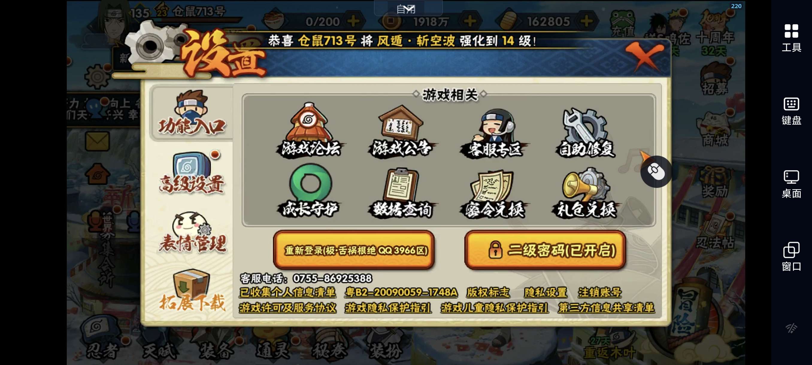 【安卓】仓鼠金币713号,162805金币,40张高招卷,1990限时点券,火影忍者手游QQ区,蜀面