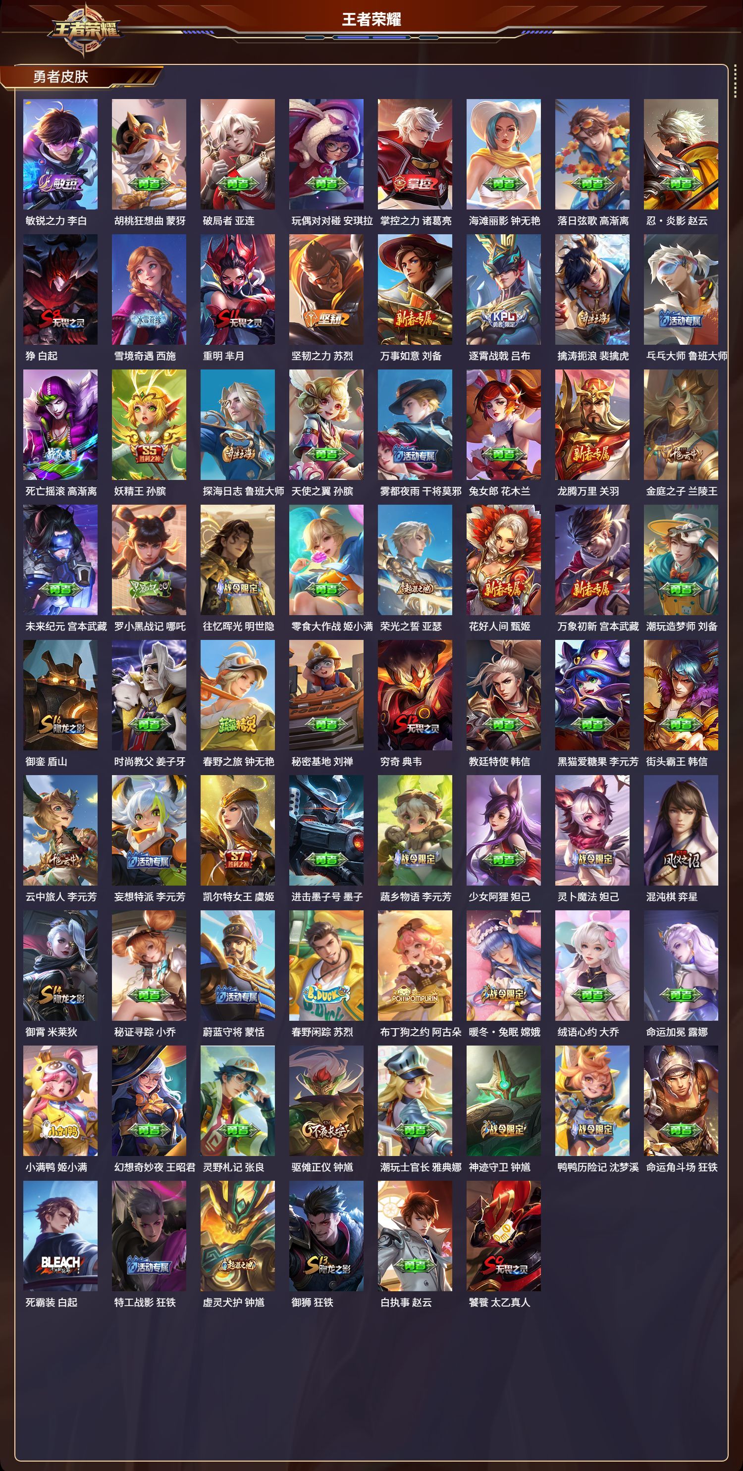 安卓QQ/至圣王者/395皮肤/128英雄/1典藏/0珍品无双/1无双/1珍品传说/25传说/108