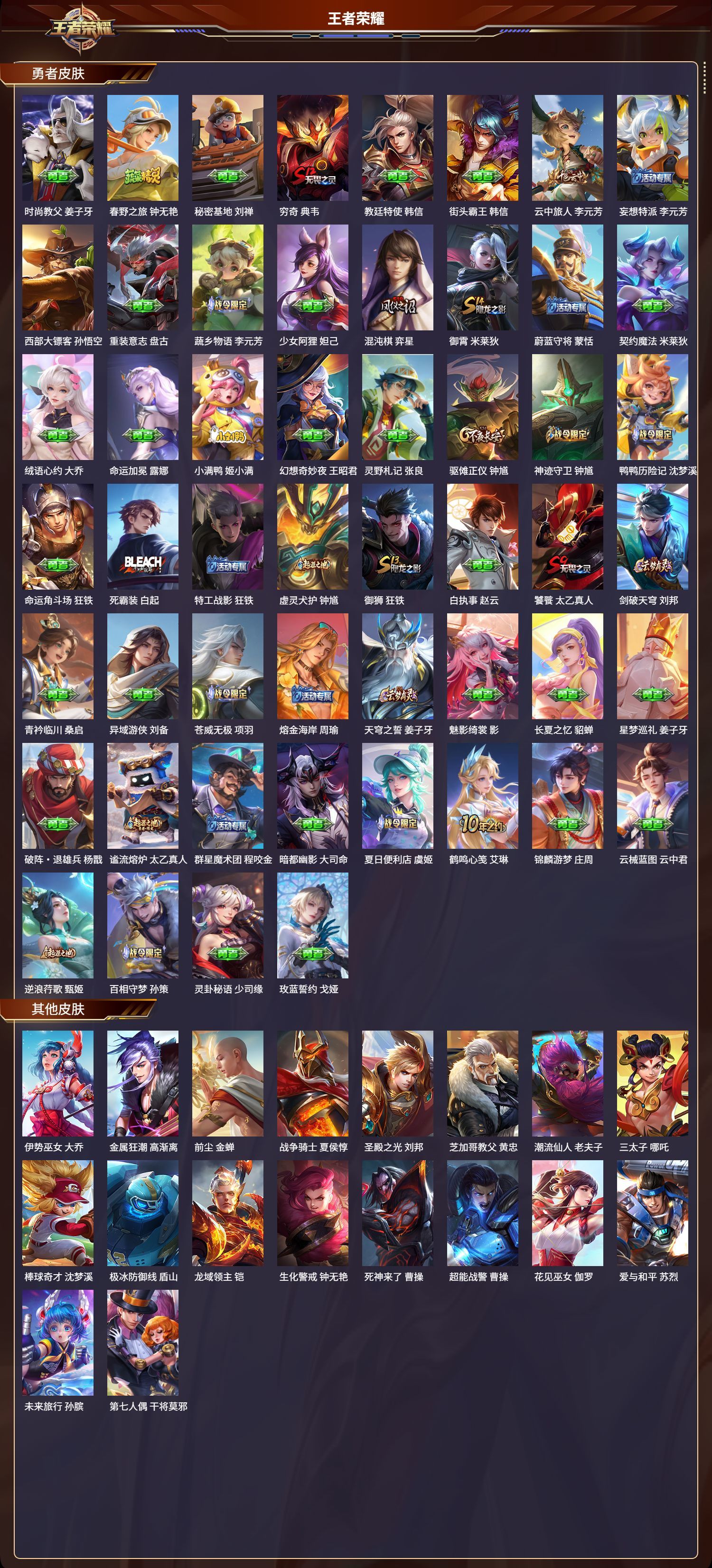 苹果QQ/至圣王者/412皮肤/128英雄/7典藏/0珍品无双/2无双/2珍品传说/32传说/122