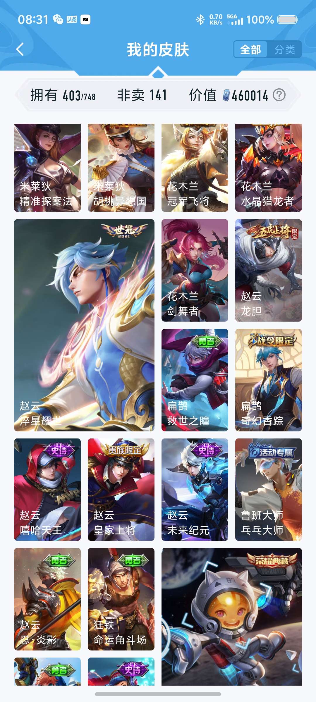 皮肤403 英雄128 非凡王者 荣耀典藏8 无双皮肤1 传说45 其他皮肤156-安卓微信-8典