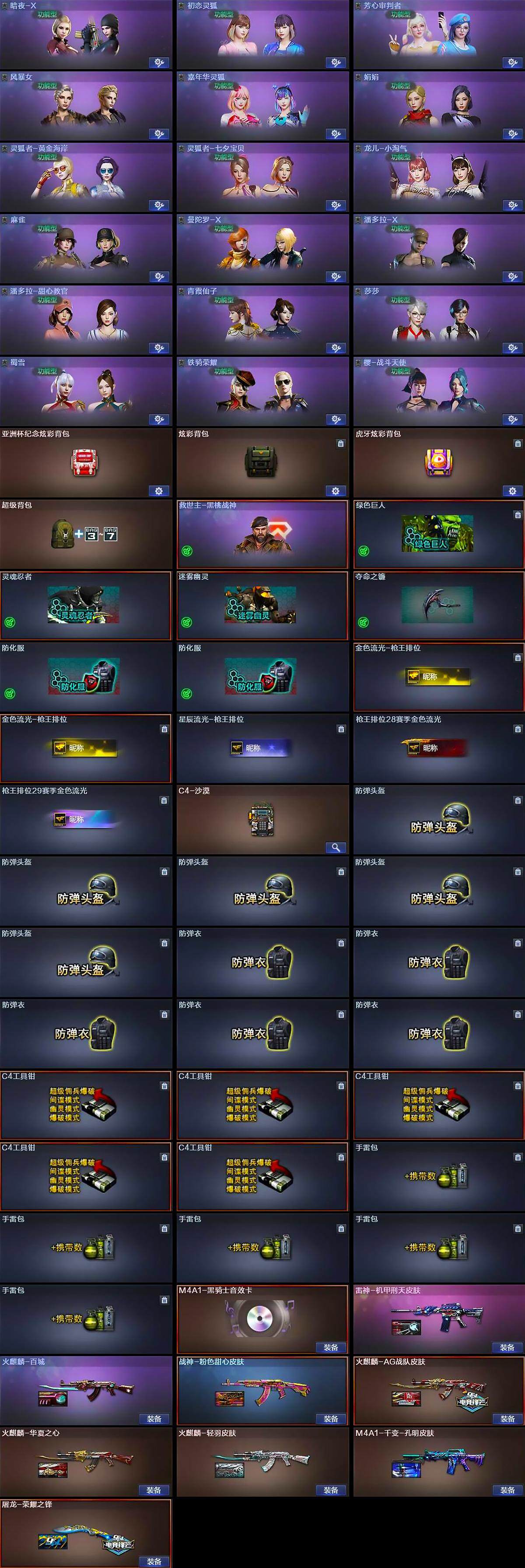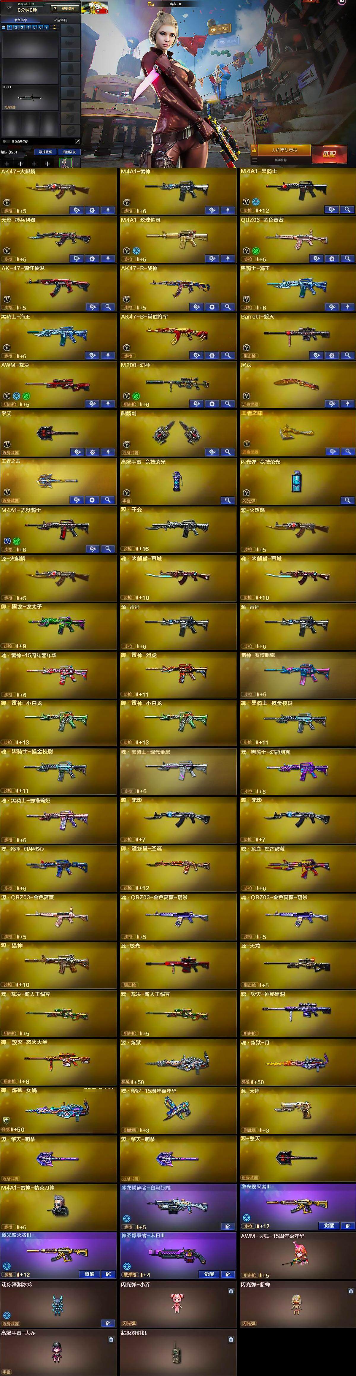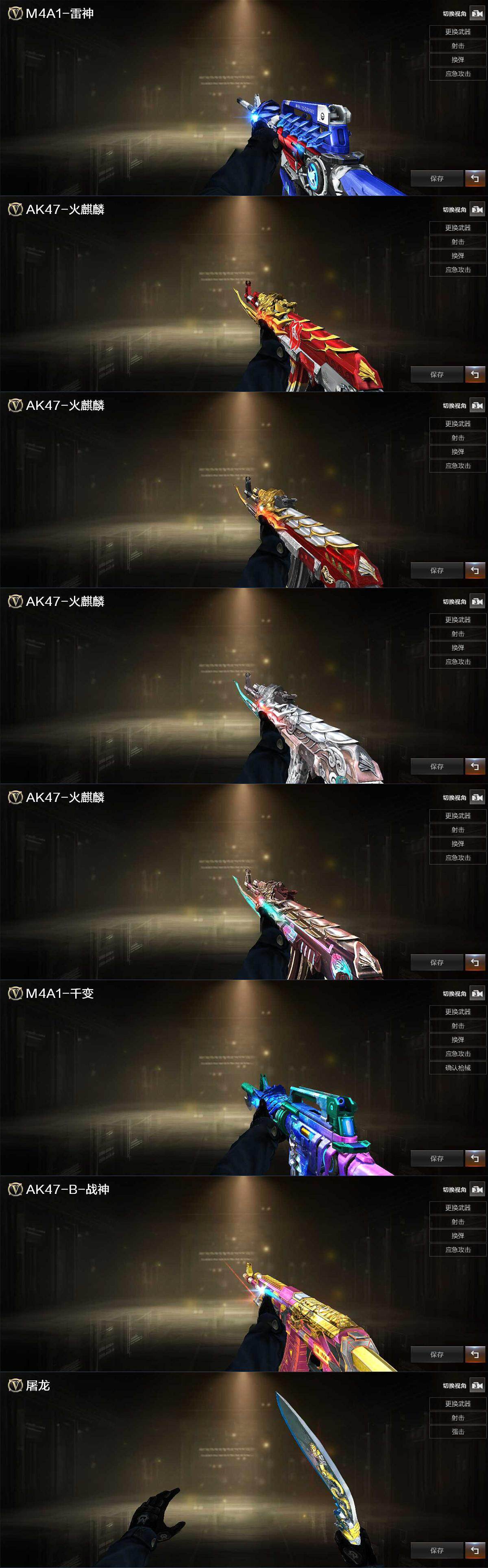 【皮肤】:雷神-机甲刑天皮肤,火麒麟-AG战队皮肤,火麒麟-华夏之心,火麒麟-轻羽皮肤,火麒麟-百城,M4A1-千变-孔明皮肤,战神-粉色甜心皮肤,AK47-B-常胜将军-曹操,AK47-B-常胜将军-刘备,AK47-B-常胜将军-孙权,屠龙-荣耀之锋