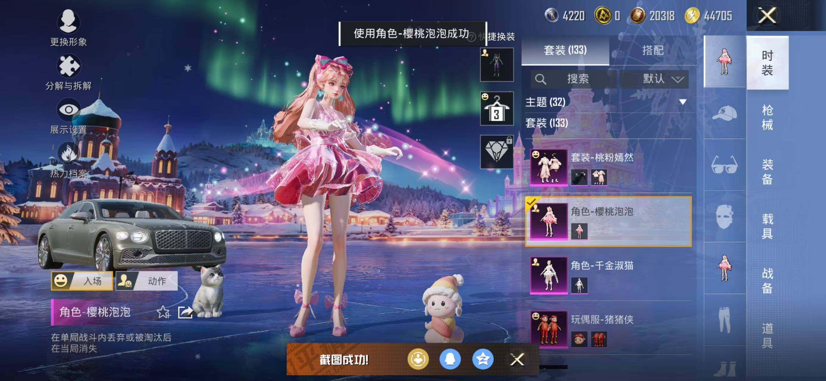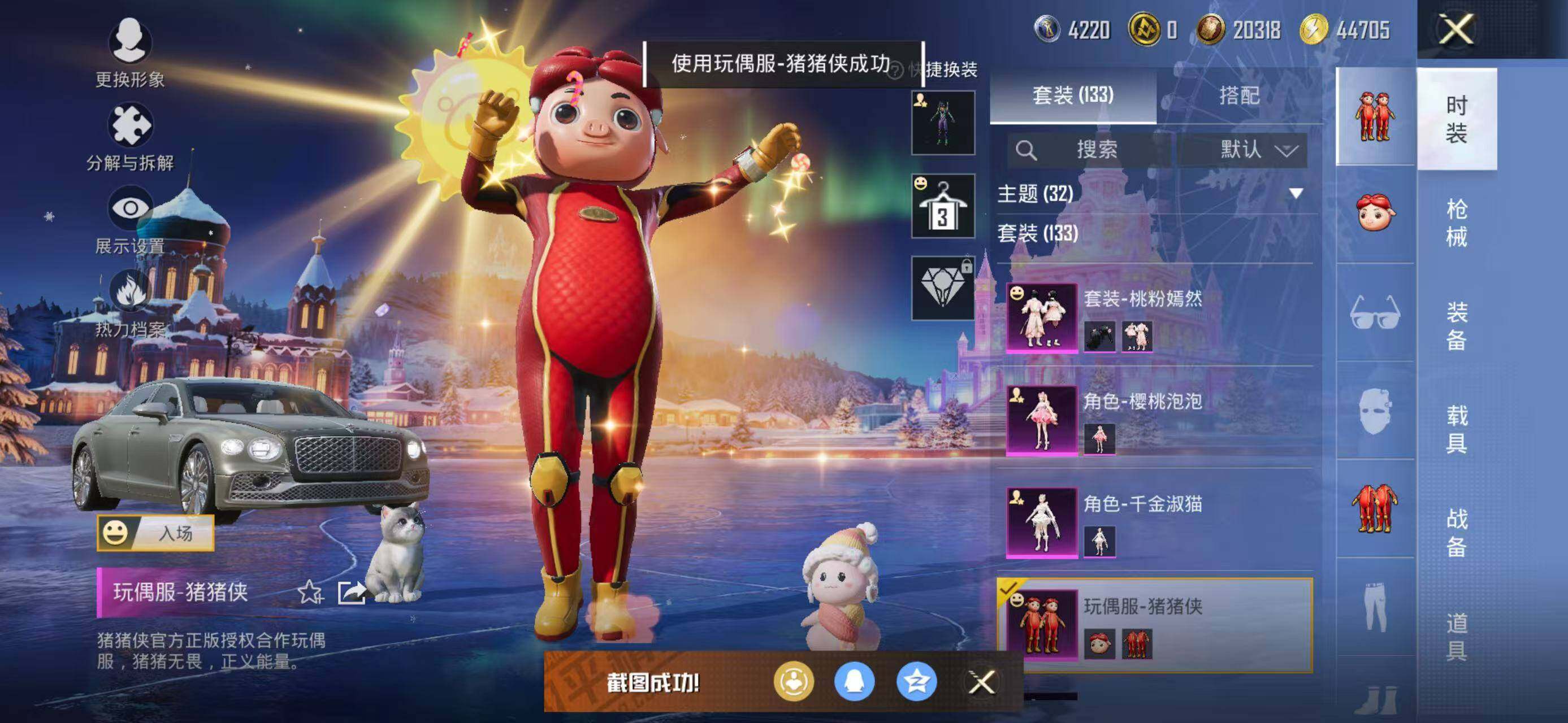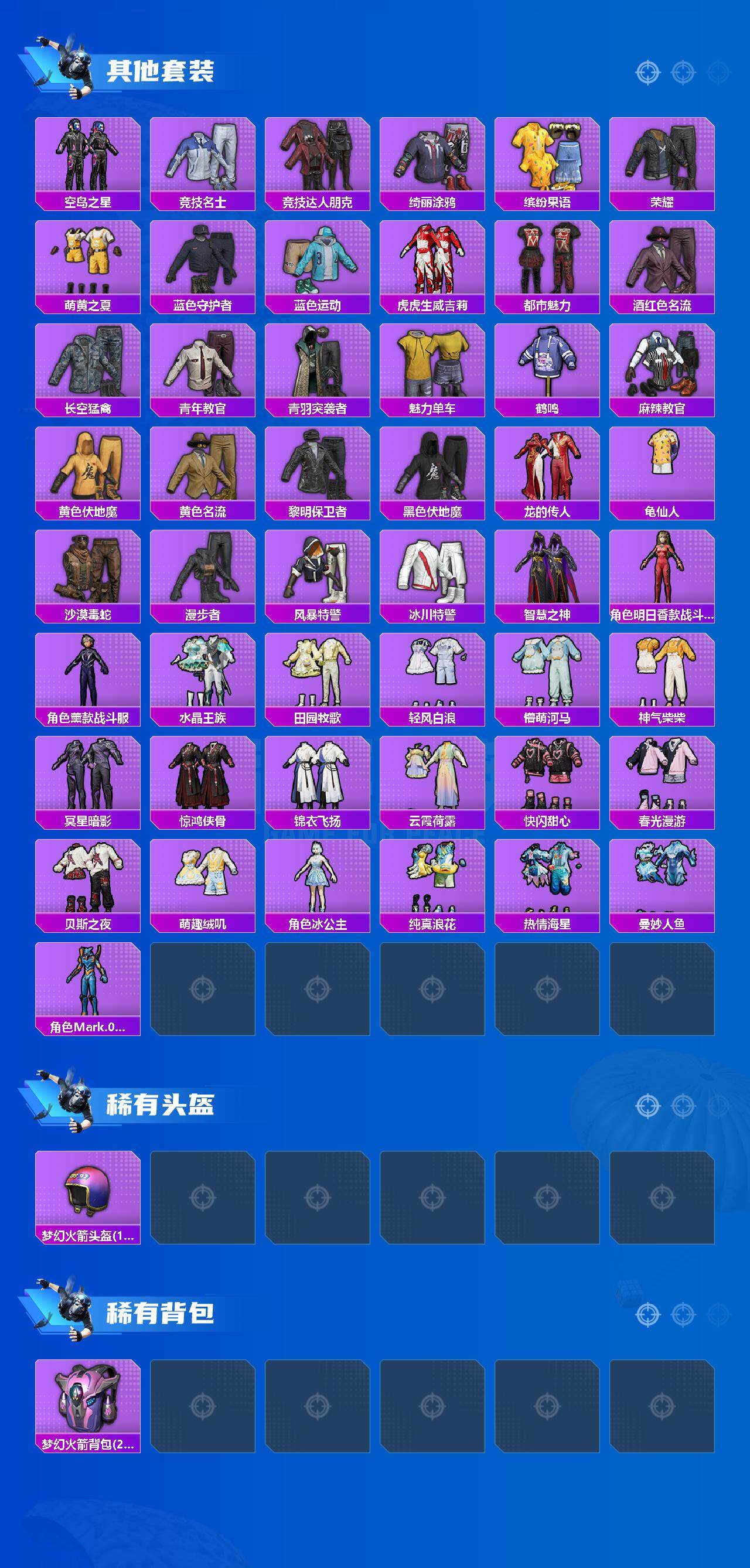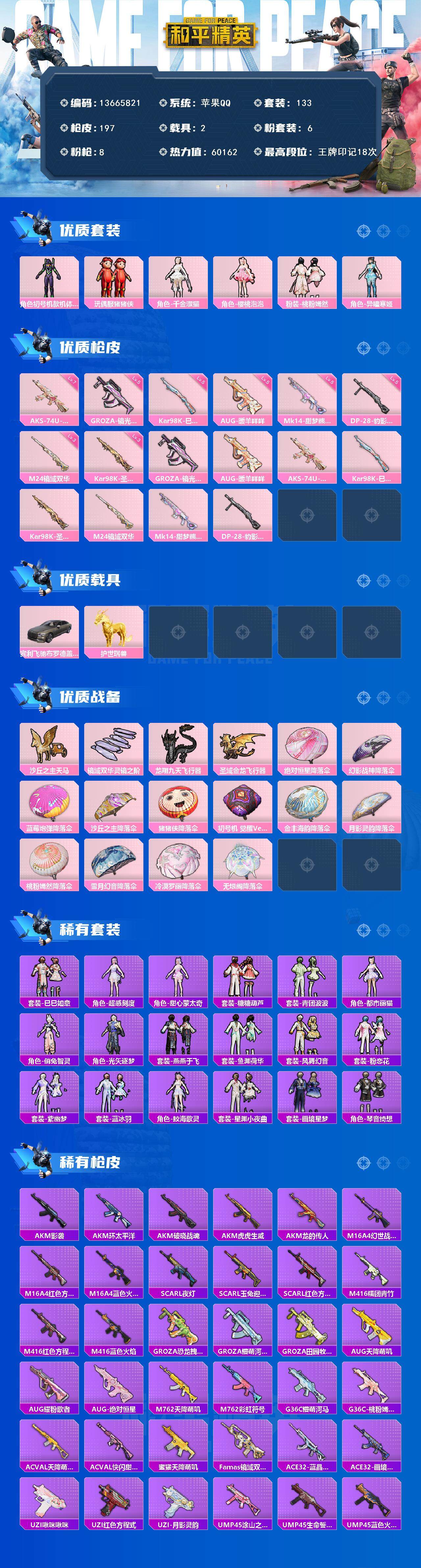 133套装/枪械8/装备226/载具2/战备141/王牌印记18/热力值60162/五级GROZA-镜光银凌/五级AUG-暖羊咩咩/七级AKS-74U-星穹咏叹调/五级Kar98K-巳巳如意/三级Kar98K-圣域龙灵/三级M24-镜域双华/五级Mk14-甜梦熊击/五级DP-28-豹影疾电/套装-龟仙人/角色-Mark.06/初号机款机体服/玩偶服-猪猪侠/角色-千金淑猫/角色-樱桃泡泡/粉装-