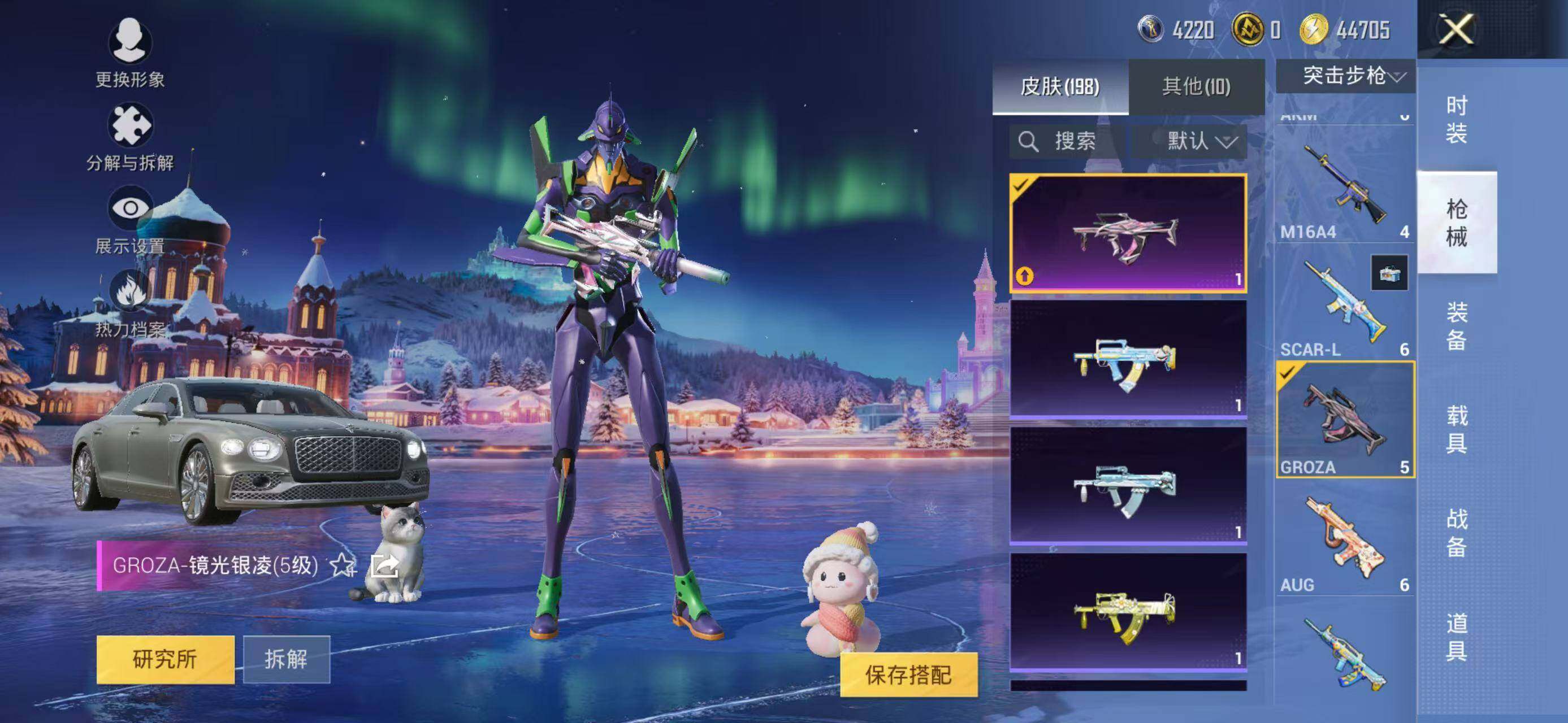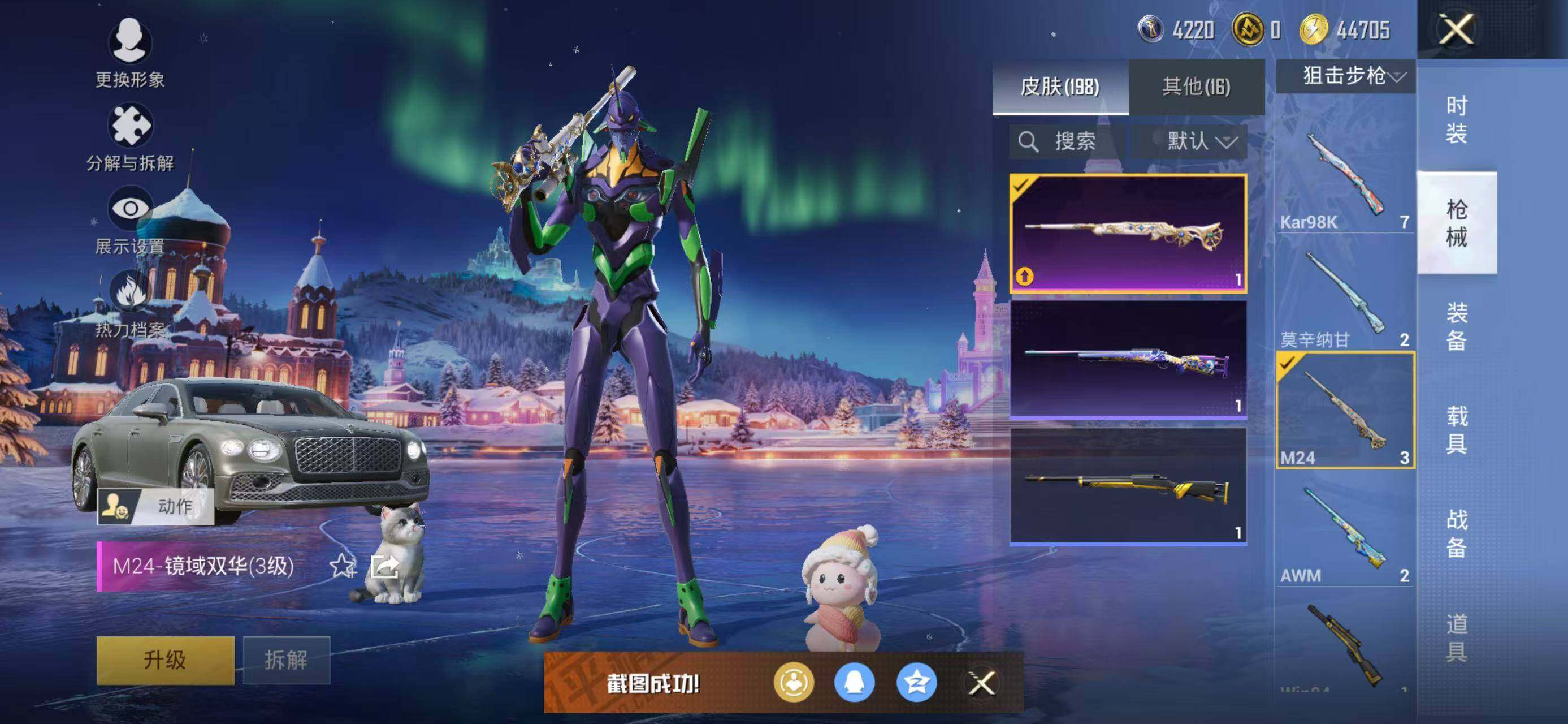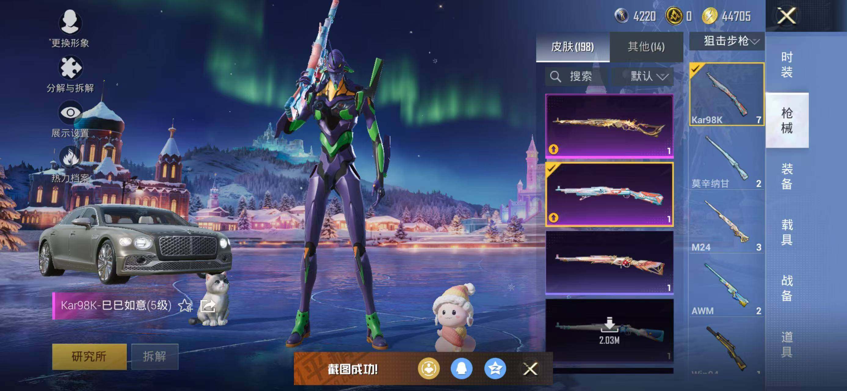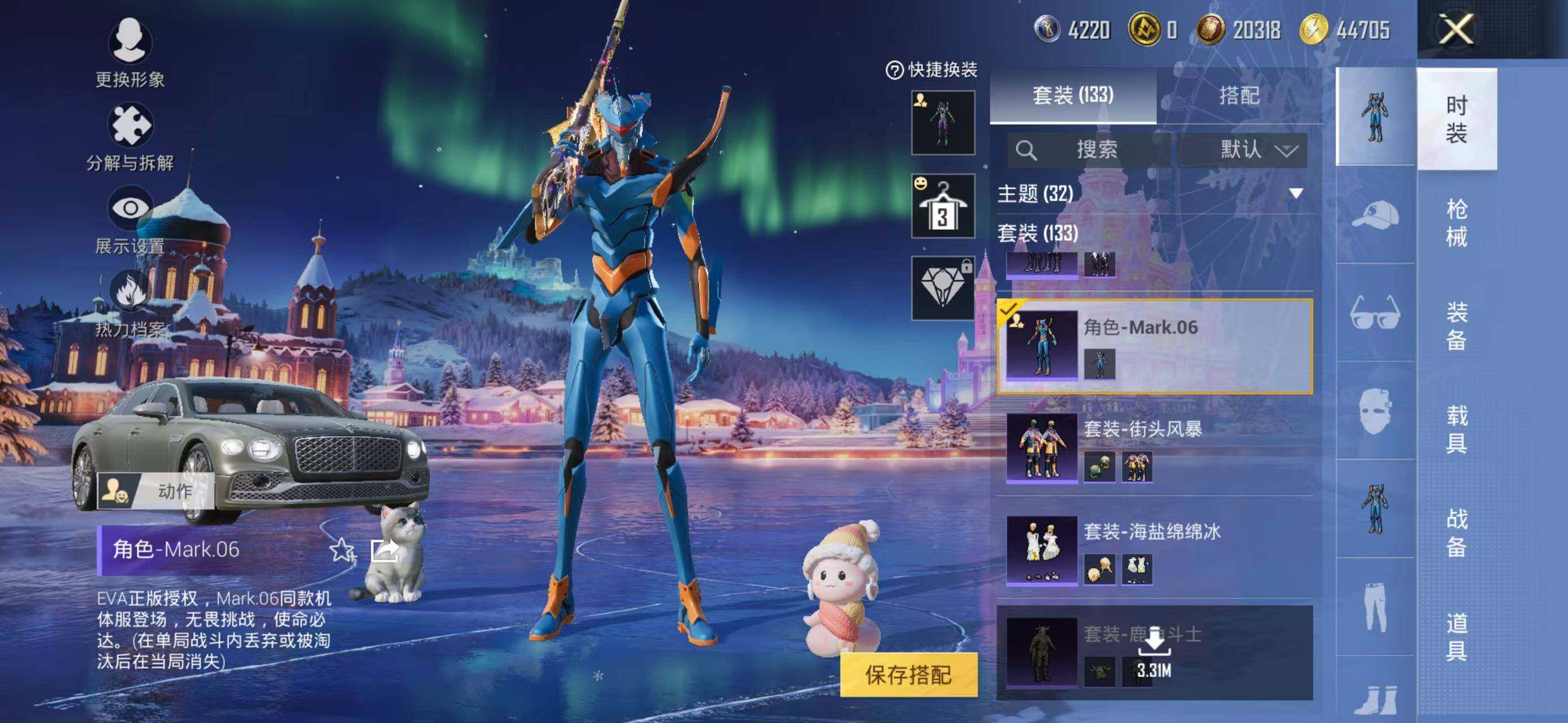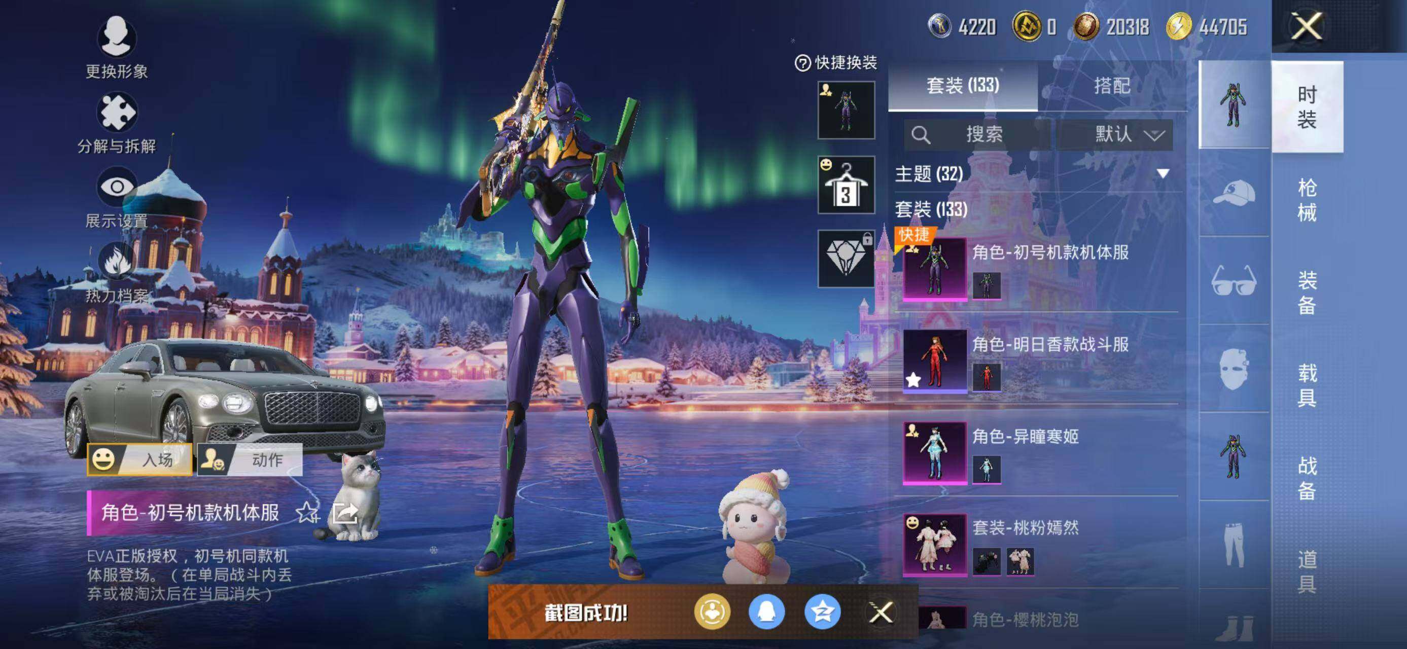 133套装/枪械8/装备226/载具2/战备141/王牌印记18/热力值60162/五级GROZA-镜光银凌/五级AUG-暖羊咩咩/七级AKS-74U-星穹咏叹调/五级Kar98K-巳巳如意/三级Kar98K-圣域龙灵/三级M24-镜域双华/五级Mk14-甜梦熊击/五级DP-28-豹影疾电/套装-龟仙人/角色-Mark.06/初号机款机体服/玩偶服-猪猪侠/角色-千金淑猫/角色-樱桃泡泡/粉装-