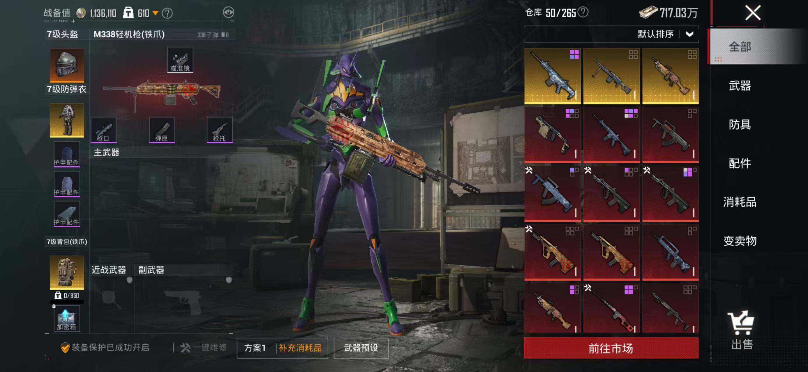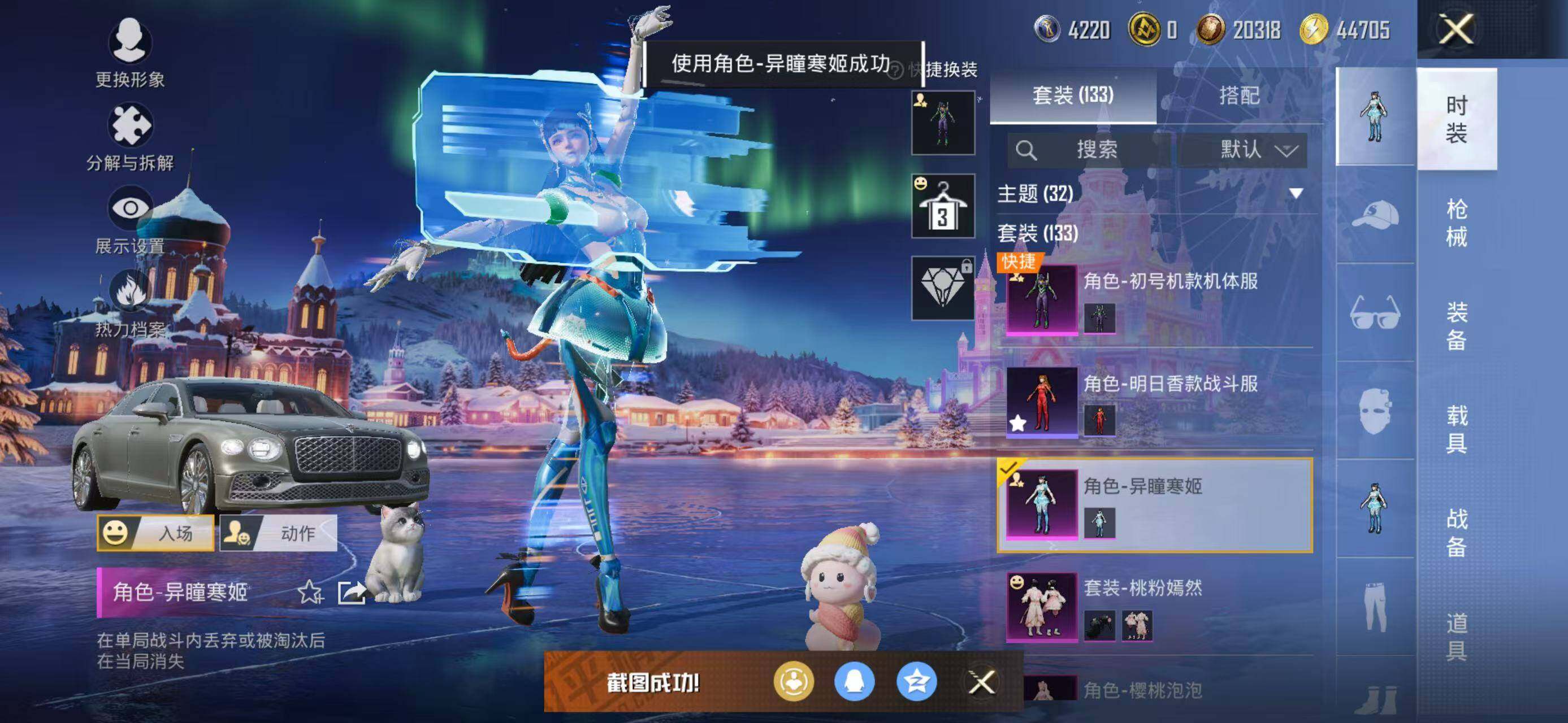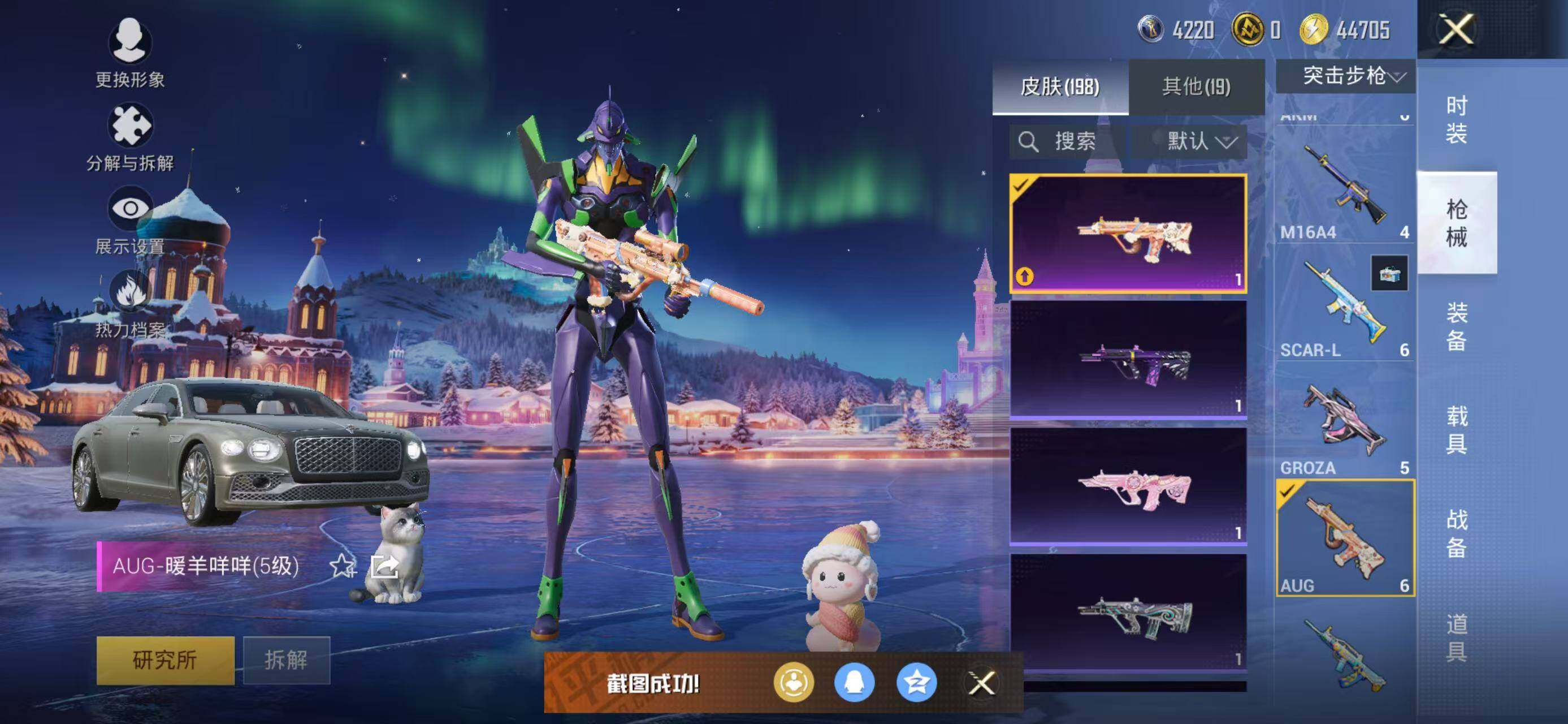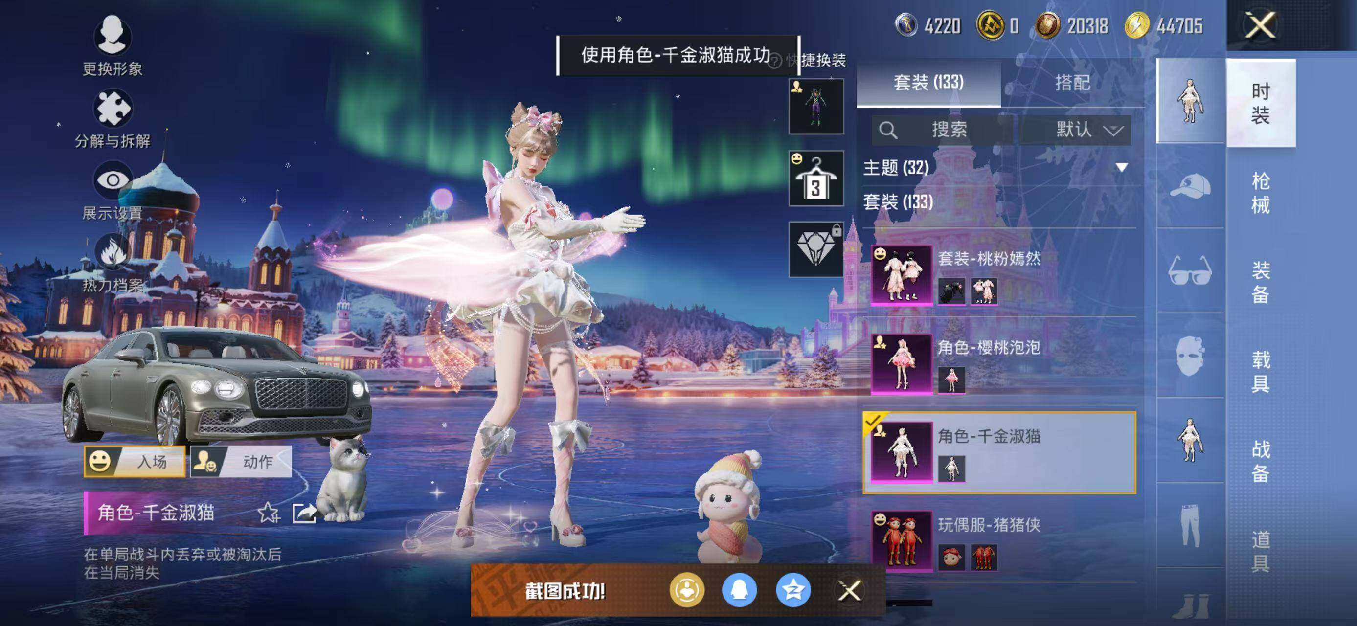 133套装/枪械8/装备226/载具2/战备141/王牌印记18/热力值60162/五级GROZA-镜光银凌/五级AUG-暖羊咩咩/七级AKS-74U-星穹咏叹调/五级Kar98K-巳巳如意/三级Kar98K-圣域龙灵/三级M24-镜域双华/五级Mk14-甜梦熊击/五级DP-28-豹影疾电/套装-龟仙人/角色-Mark.06/初号机款机体服/玩偶服-猪猪侠/角色-千金淑猫/角色-樱桃泡泡/粉装-