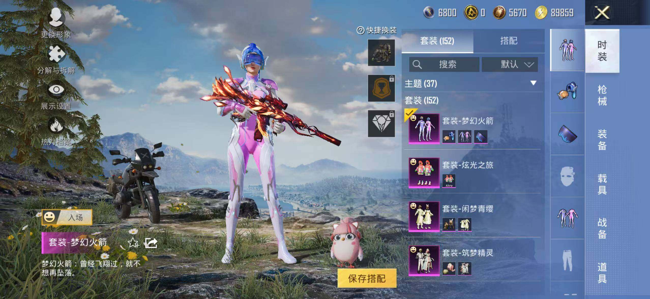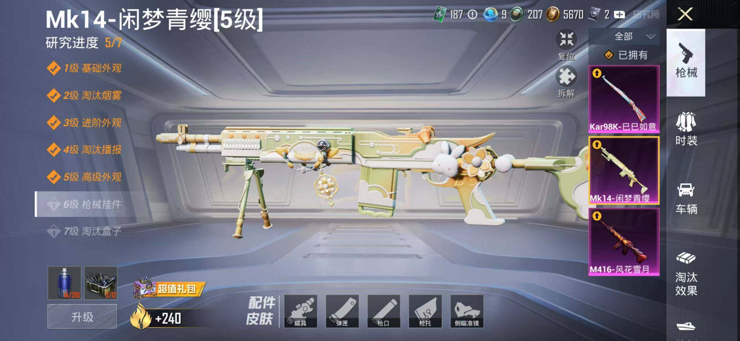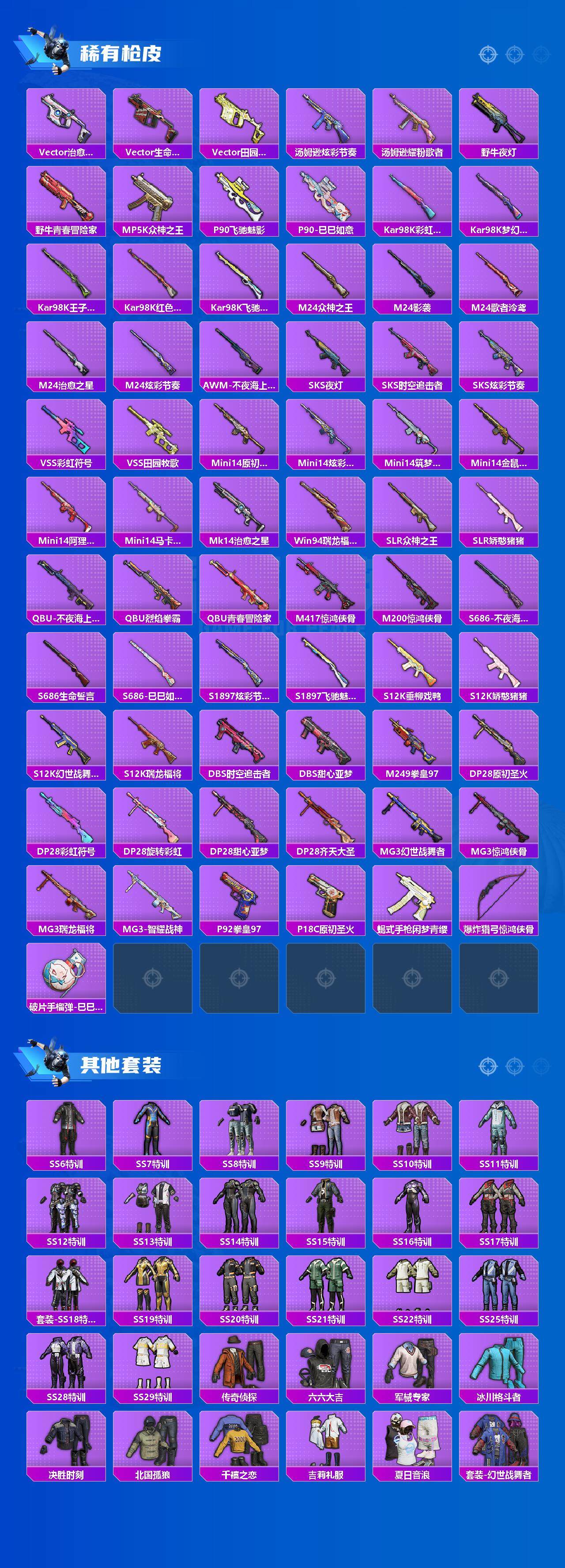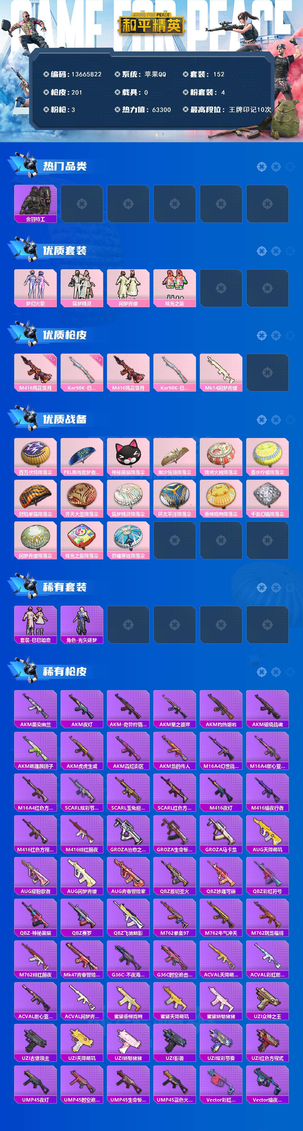 152套装/枪械3/装备262/战备171/王牌印记10/热力值63300/七级M416-风花雪月/五级Kar98K-巳巳如意/粉装-梦幻火箭/金羽特工/套装-粉红小猪/梦幻火箭/筑梦精灵/闲梦青缨/炫光之旅/M416-风花雪月/Kar98K-巳巳如意/MK14-闲梦青缨/百万伏特降落伞/PEL轰鸣竞梦者降落伞/神秘黑猫降落伞/潮汐统领降落伞/锦绣火鲤降落伞/香水柠檬降落伞/烈焰拳霸降落伞/齐天