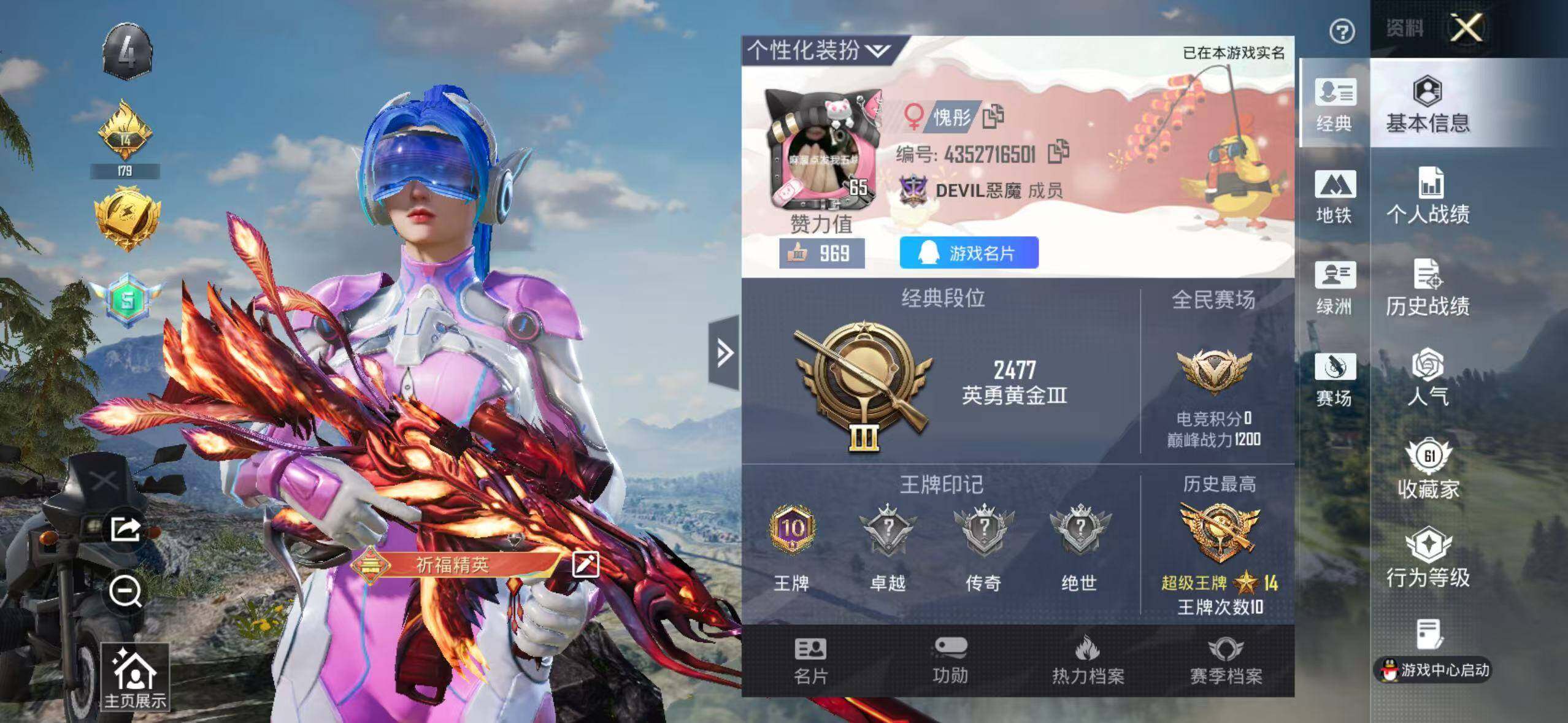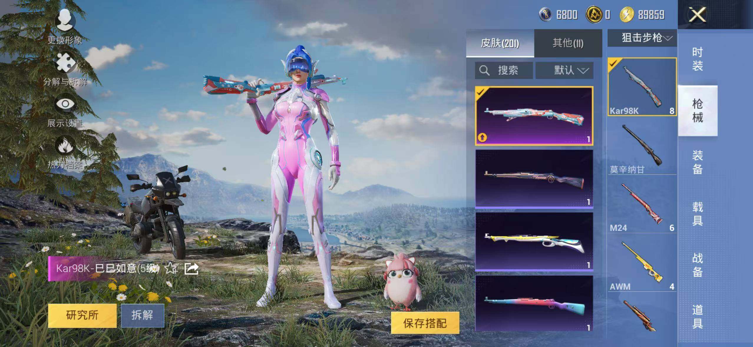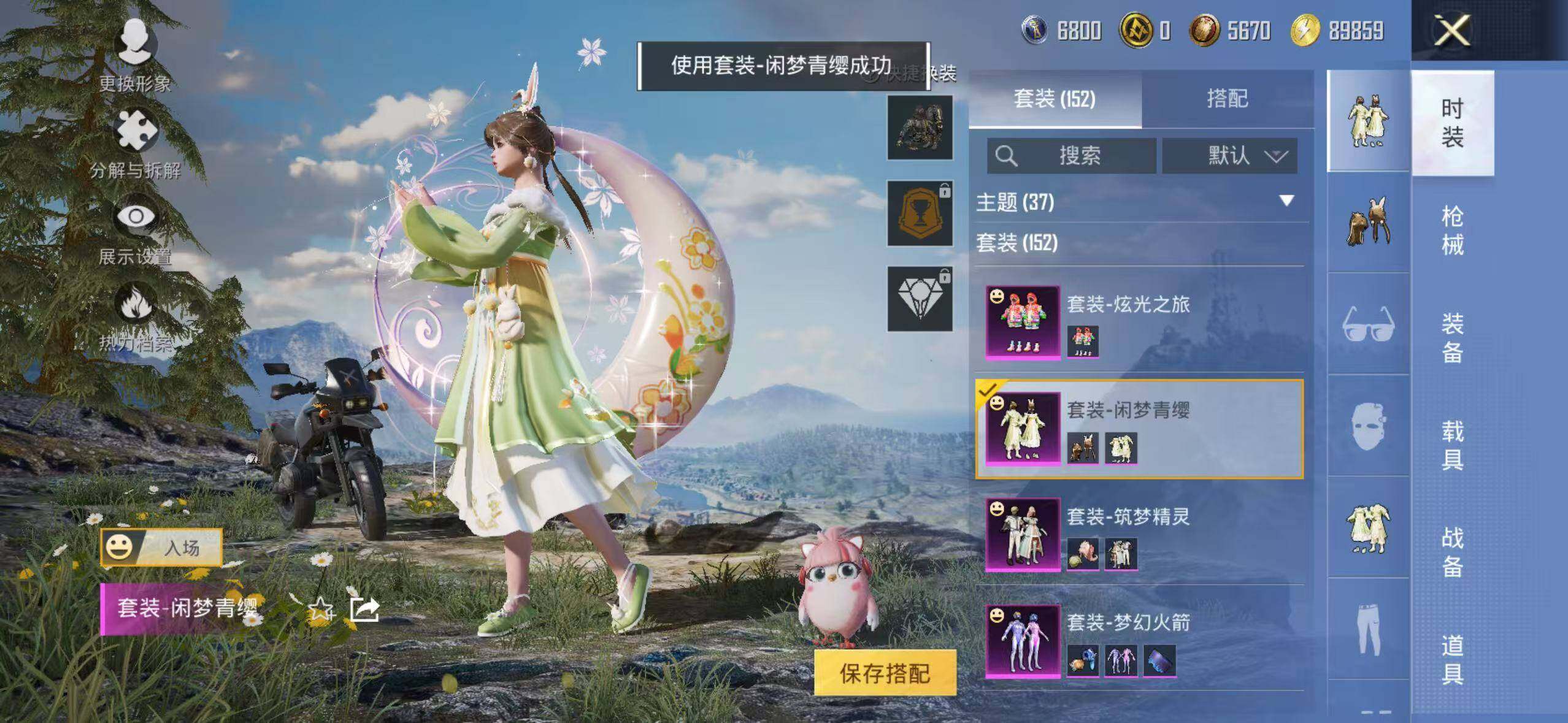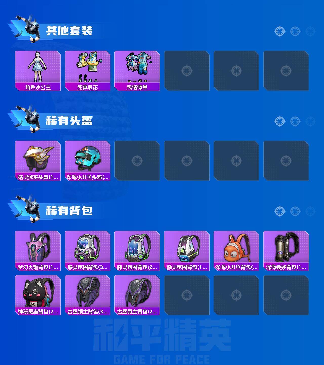 152套装/枪械3/装备262/战备171/王牌印记10/热力值63300/七级M416-风花雪月/五级Kar98K-巳巳如意/粉装-梦幻火箭/金羽特工/套装-粉红小猪/梦幻火箭/筑梦精灵/闲梦青缨/炫光之旅/M416-风花雪月/Kar98K-巳巳如意/MK14-闲梦青缨/百万伏特降落伞/PEL轰鸣竞梦者降落伞/神秘黑猫降落伞/潮汐统领降落伞/锦绣火鲤降落伞/香水柠檬降落伞/烈焰拳霸降落伞/齐天