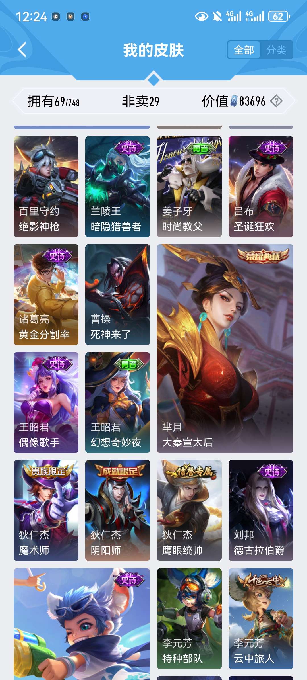 皮肤69 英雄92 荣耀黄金 荣耀典藏2 传说5 其他皮肤31-好想有一个水晶没用,我记着,还有别的区有武则天,武则天有皮肤,