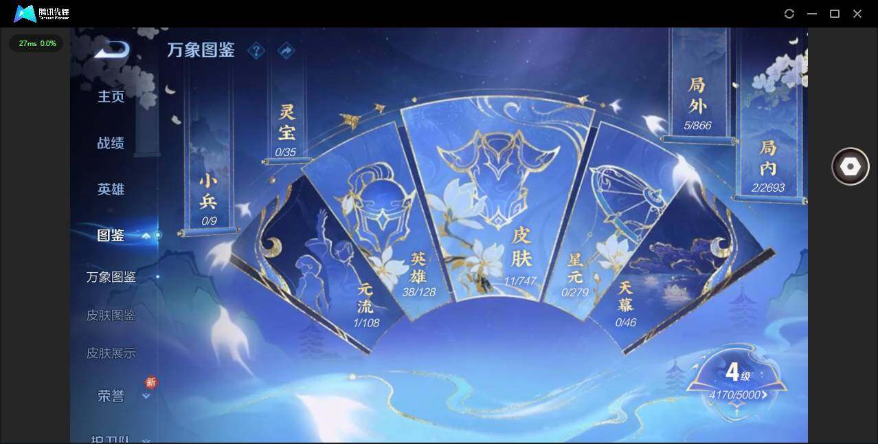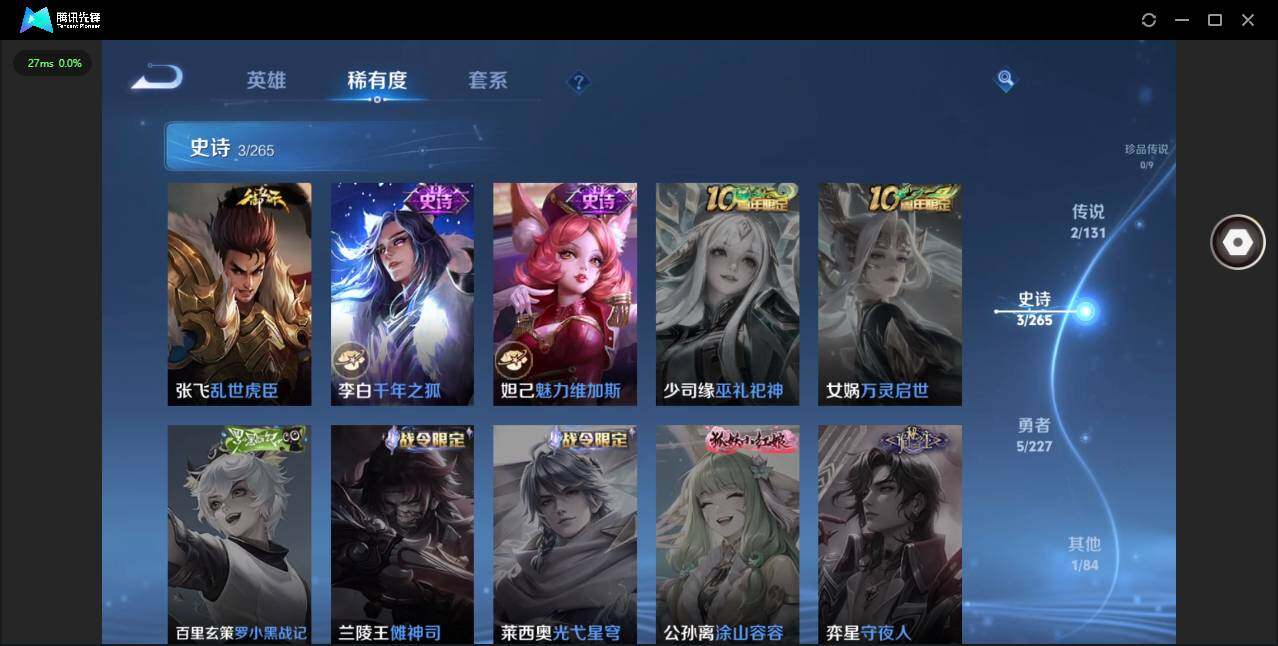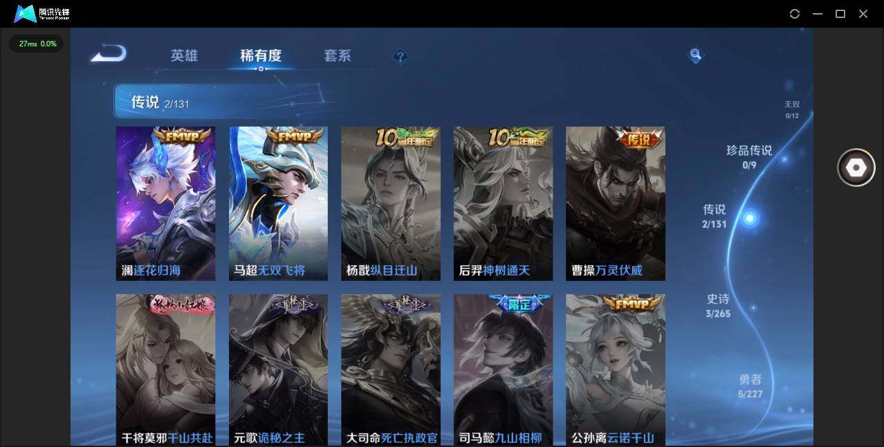 贵族等级: V4 英雄数: 38 皮肤数: 11 传说皮: 无双飞将,澜逐花归海
