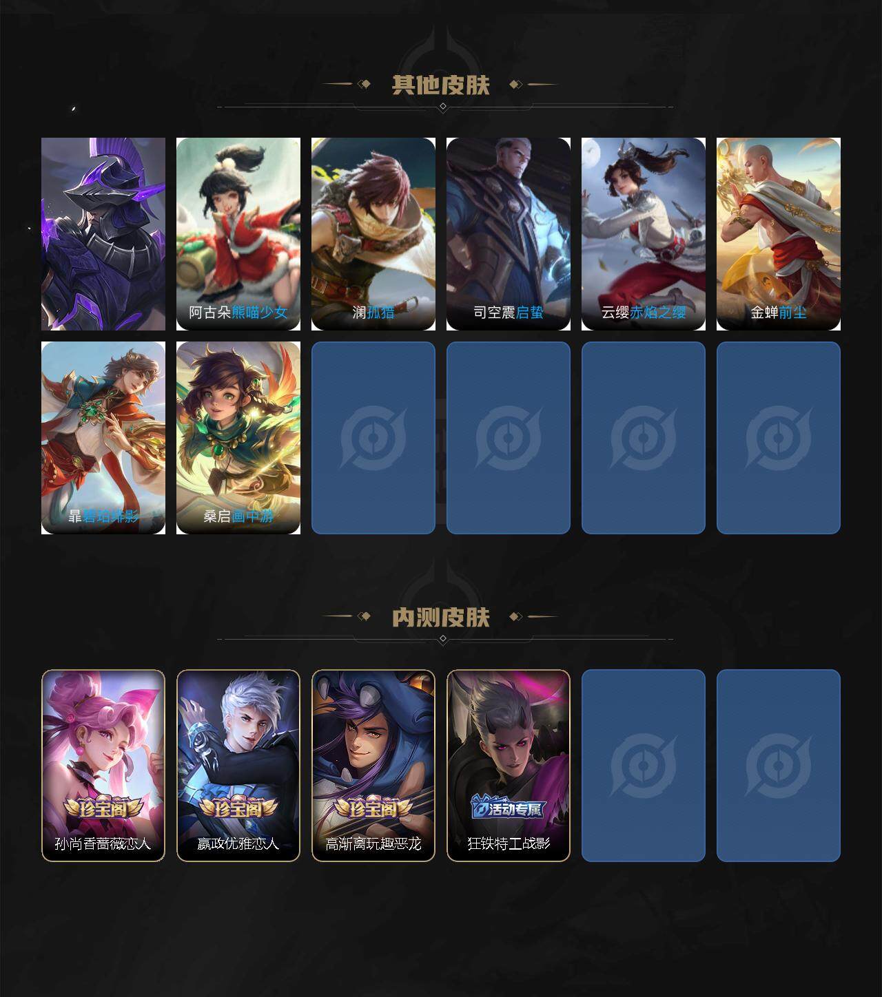 【传说皮肤】:澜愿照九州拓,桑启鸣野蒿,诸葛亮鹤羽星尊,张飞百相守梦,公孙离记忆之芯,伽罗炽翼辉光,孙悟空齐天大圣,小乔山海琳琅生,李信山海炽霜斩,李白诗剑行,不知火舞绯