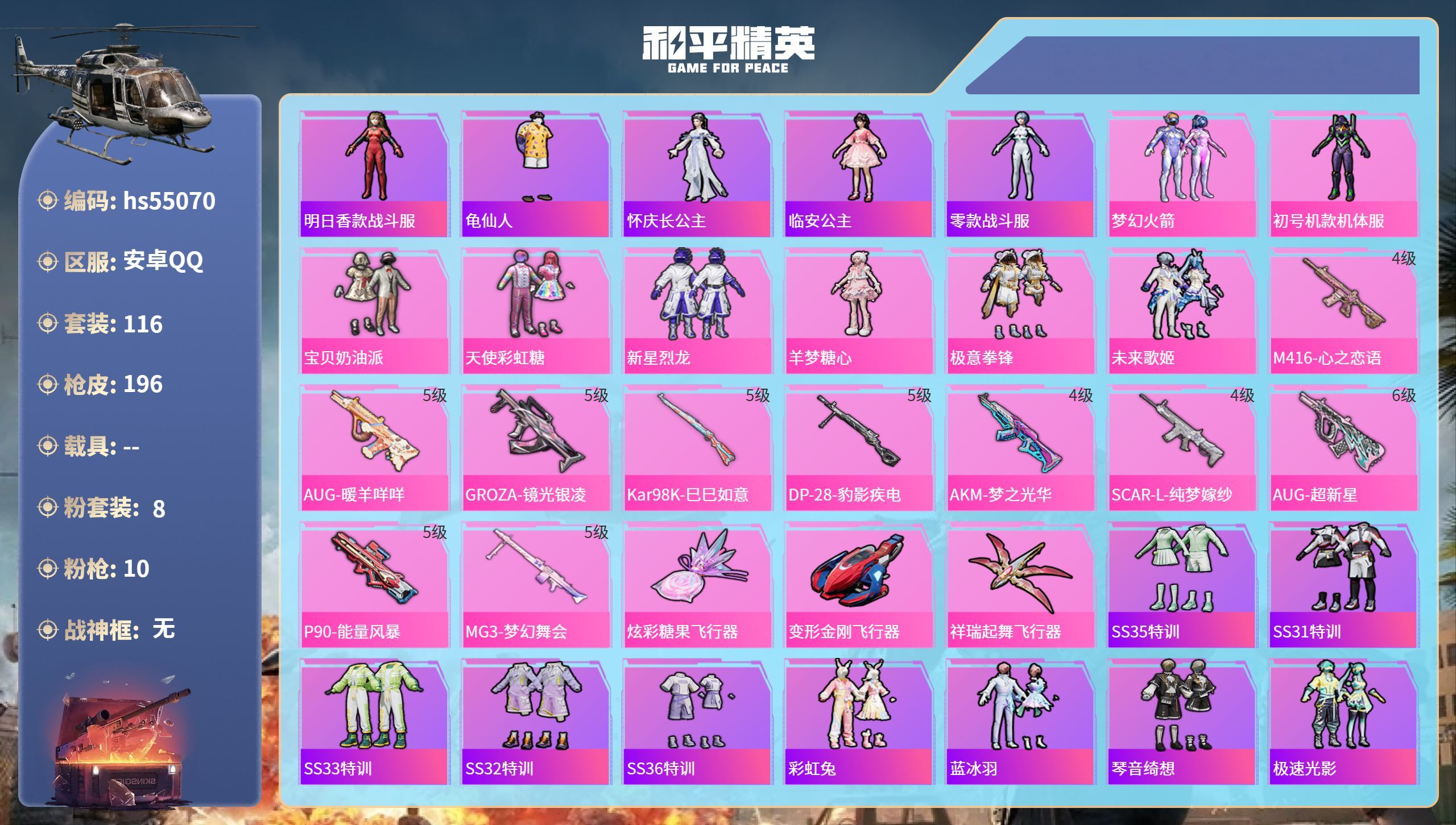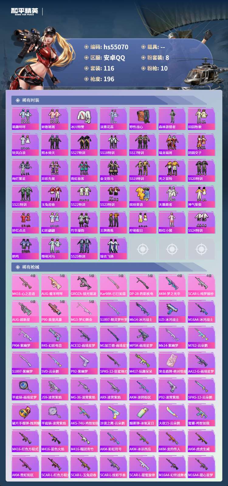 hs55070 安卓手Q-9王牌印记-8粉装-10特效枪-62532热力值-116套装-196枪皮【