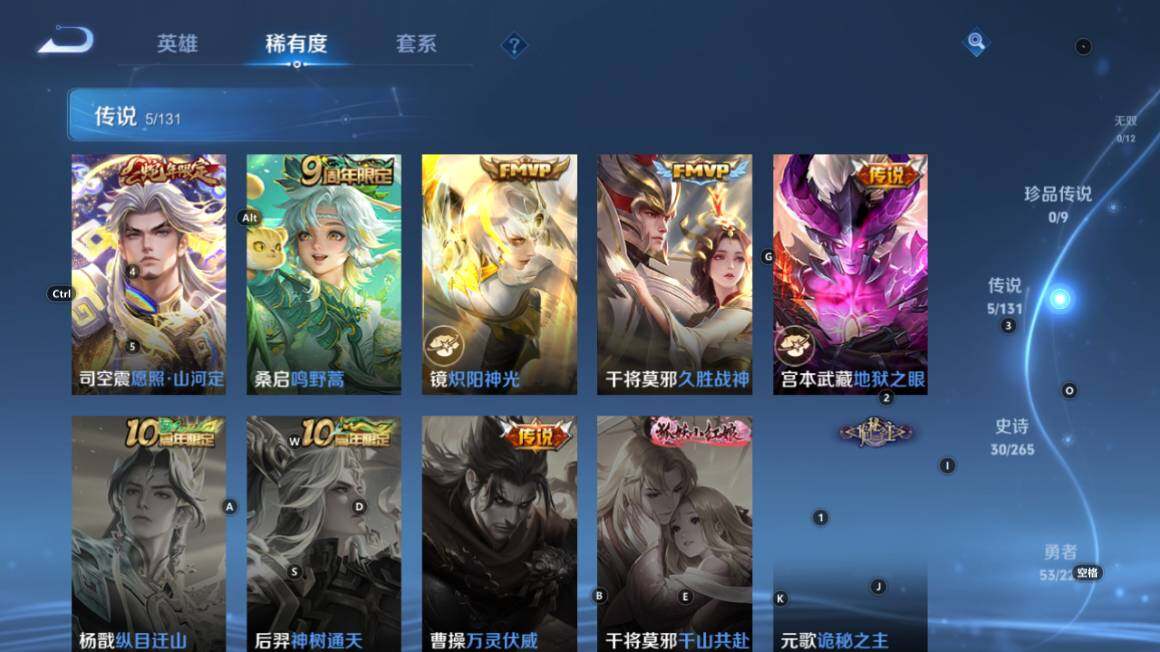 【传说皮肤】:司空震愿照山河定,桑启鸣野蒿,镜炽阳神光,干将莫邪久胜战神,宫本武藏地狱之眼
